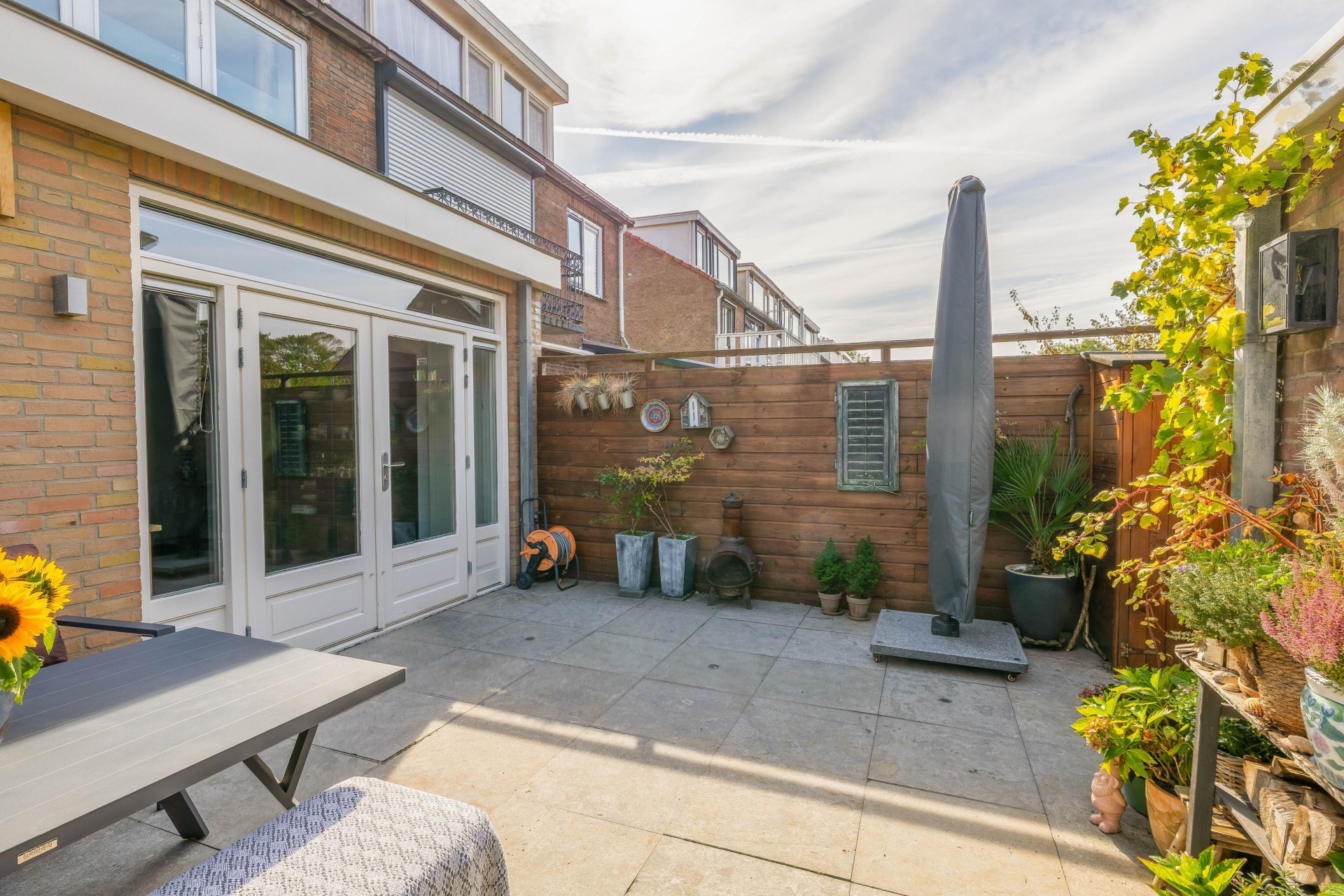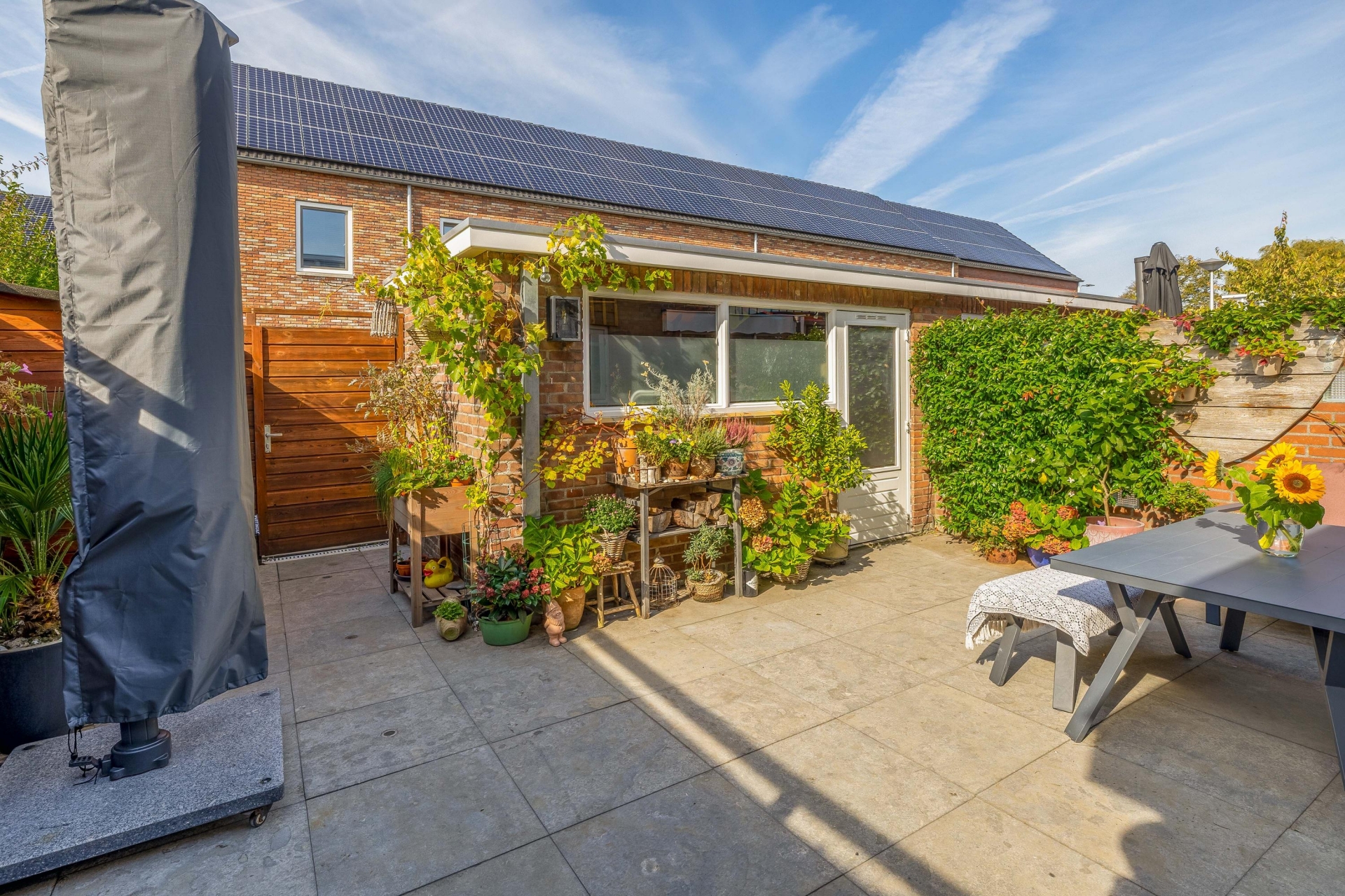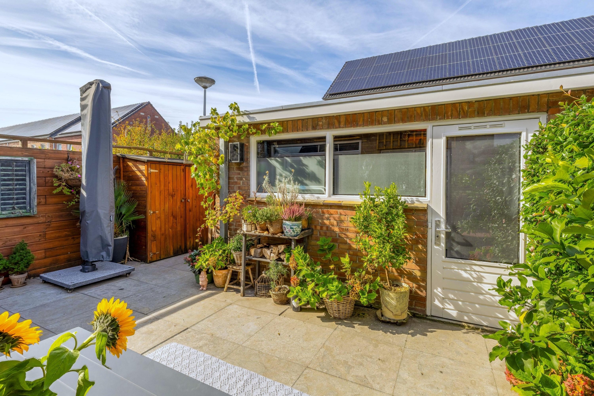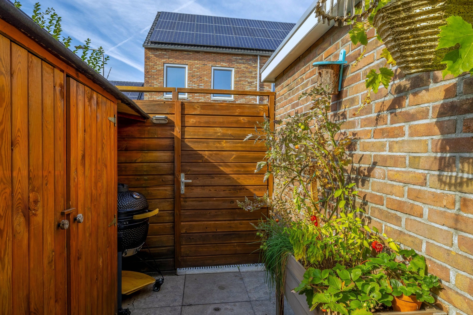 De achtertuin is onderhoudsvriendelijk aangelegd met grote tegels, groenborders en genoeg plek voor een loungeset of eettafel. Dankzij de ligging op het noordwesten heb je hier in de middag en avondzon een heerlijk plekje om te ontspannen. Achterin staat een vrijstaande stenen berging met elektra – ideaal voor fietsen, gereedschap of de barbecue. Via de achterom kom je zo uit op een pad richting de openbare parkeerplaatsen. Ook aan de voorzijde is het netjes aangelegd met een eigen pad naar de voordeur en volwassen beplanting voor privacy en uitstraling.