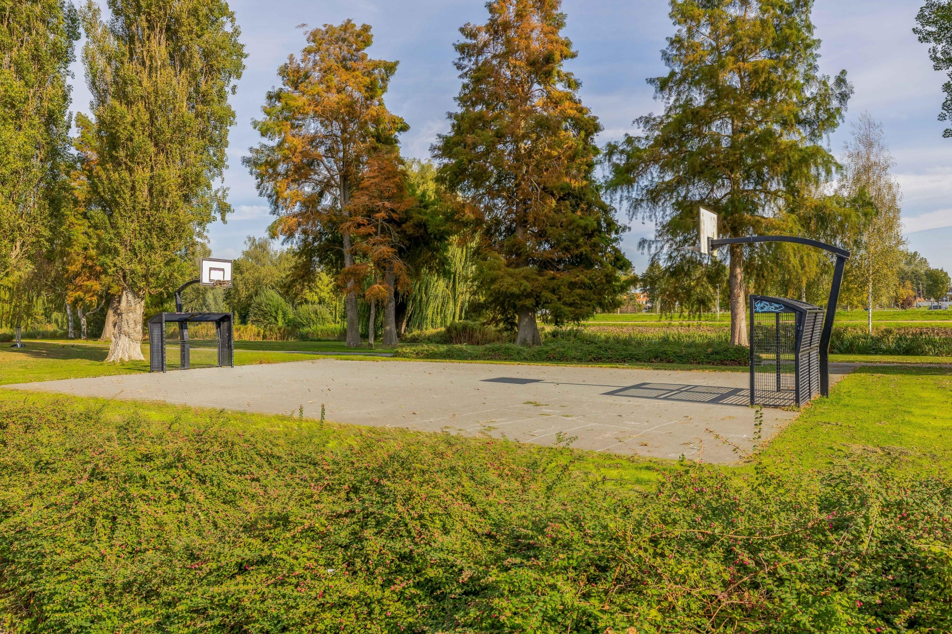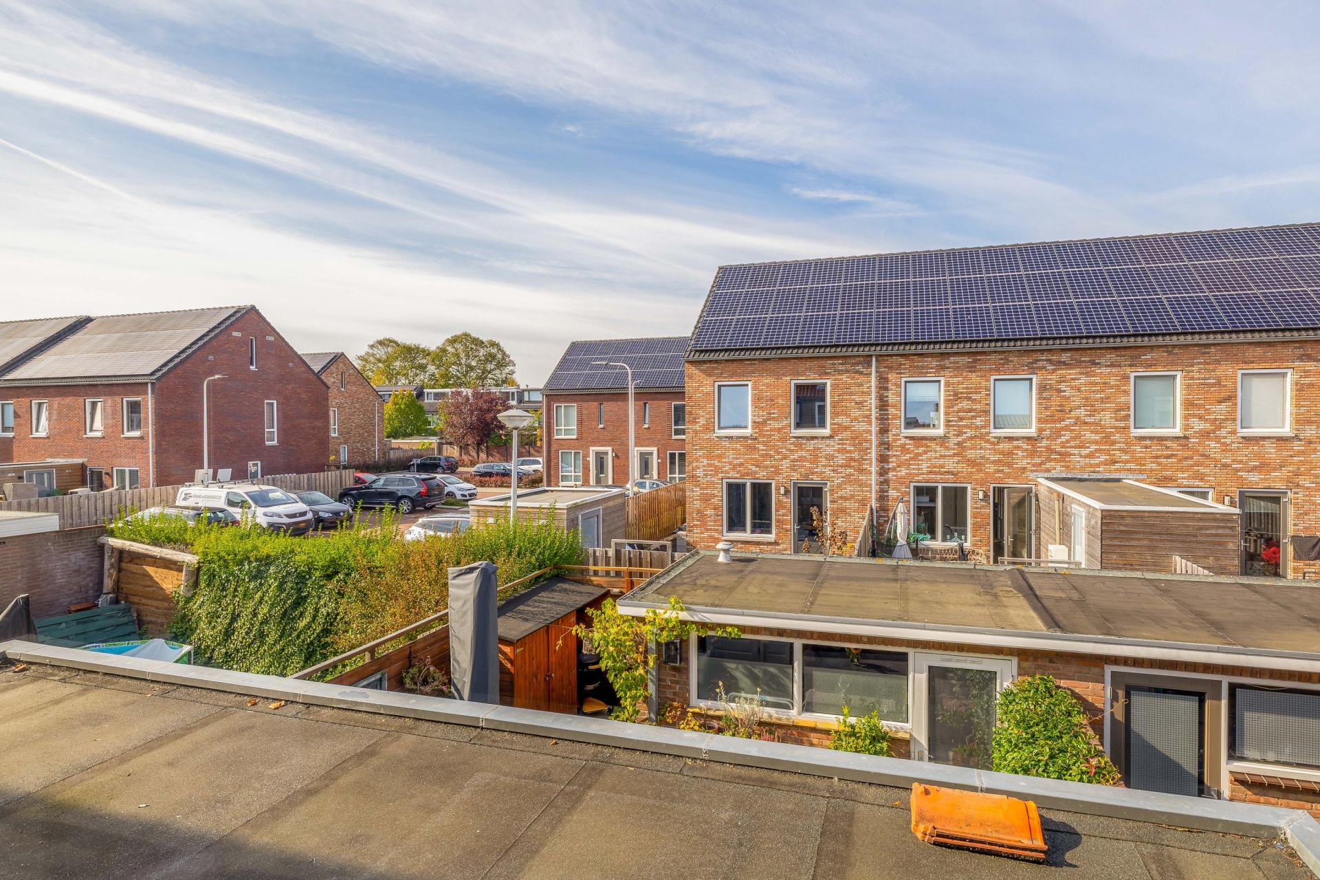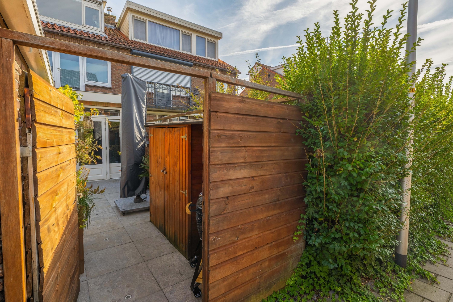 De achtertuin is onderhoudsvriendelijk aangelegd met grote tegels, groenborders en genoeg plek voor een loungeset of eettafel. Dankzij de ligging op het noordwesten heb je hier in de middag en avondzon een heerlijk plekje om te ontspannen. Achterin staat een vrijstaande stenen berging met elektra – ideaal voor fietsen, gereedschap of de barbecue. Via de achterom kom je zo uit op een pad richting de openbare parkeerplaatsen. Ook aan de voorzijde is het netjes aangelegd met een eigen pad naar de voordeur en volwassen beplanting voor privacy en uitstraling.