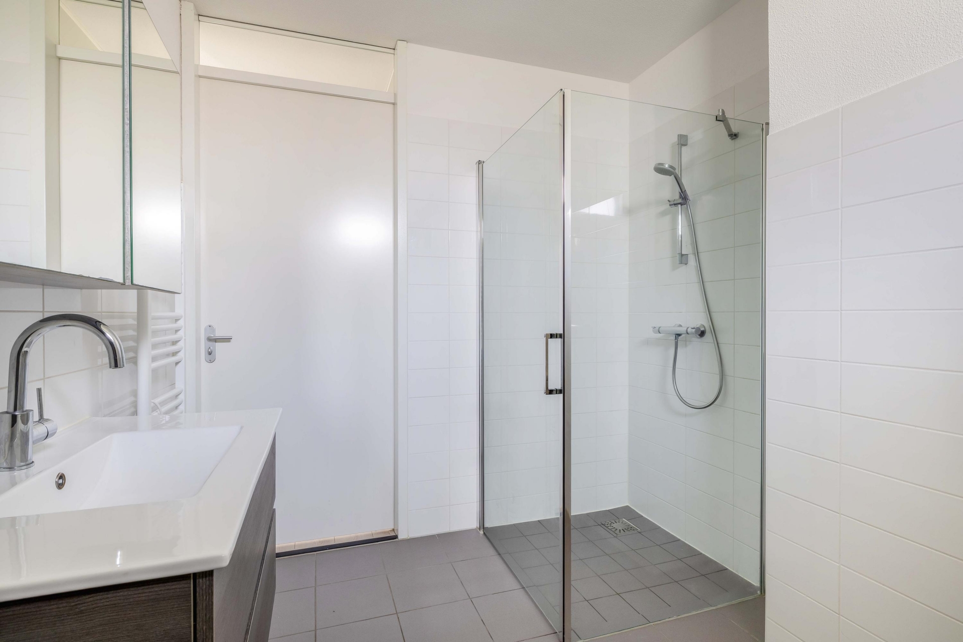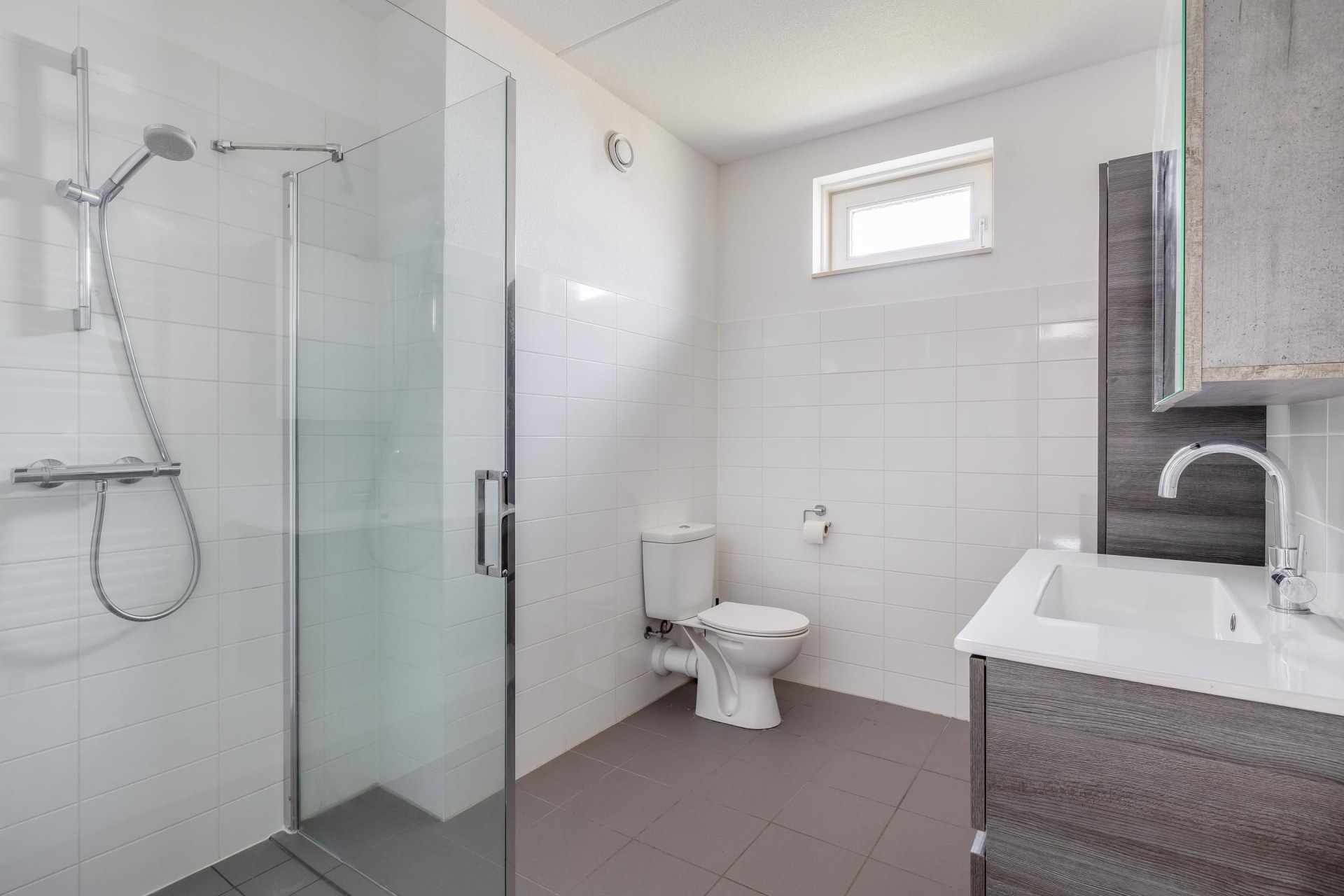De badkamer is modern uitgevoerd en praktisch ingericht met een inloopdouche, toilet en een wastafel.