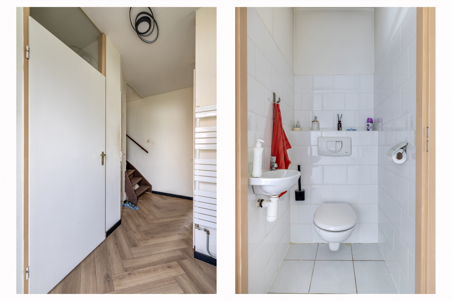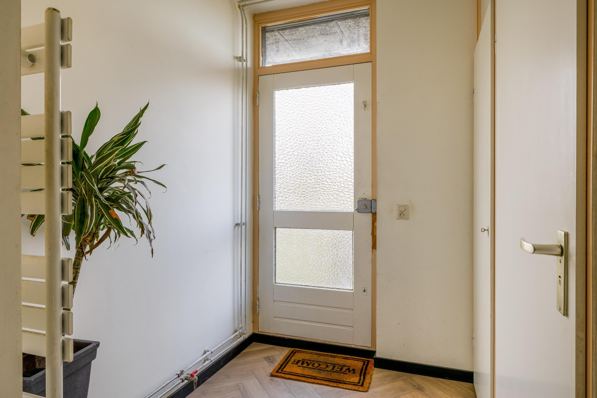 Via de entree kom je binnen in de hal met toiletruimte, meterkast en praktische bergruimte. Vanuit hier stap je de woonkamer in. Wat direct opvalt is de hoeveelheid licht dankzij de grote raampartijen. Dit zorgt voor een prettige en open sfeer.