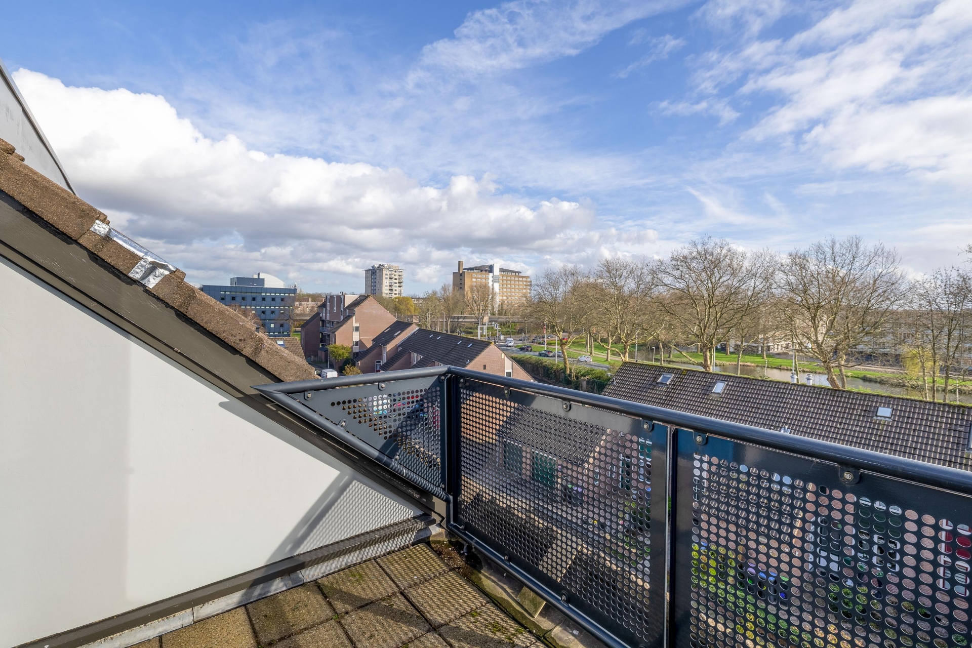 Aan de achterzijde van het huis bevindt zich het balkon, gelegen op het zuiden. Hier kun je heerlijk genieten van de zon en het vrije uitzicht over de omgeving. Een fijne plek om de dag te beginnen met een kop koffie of juist af te sluiten.