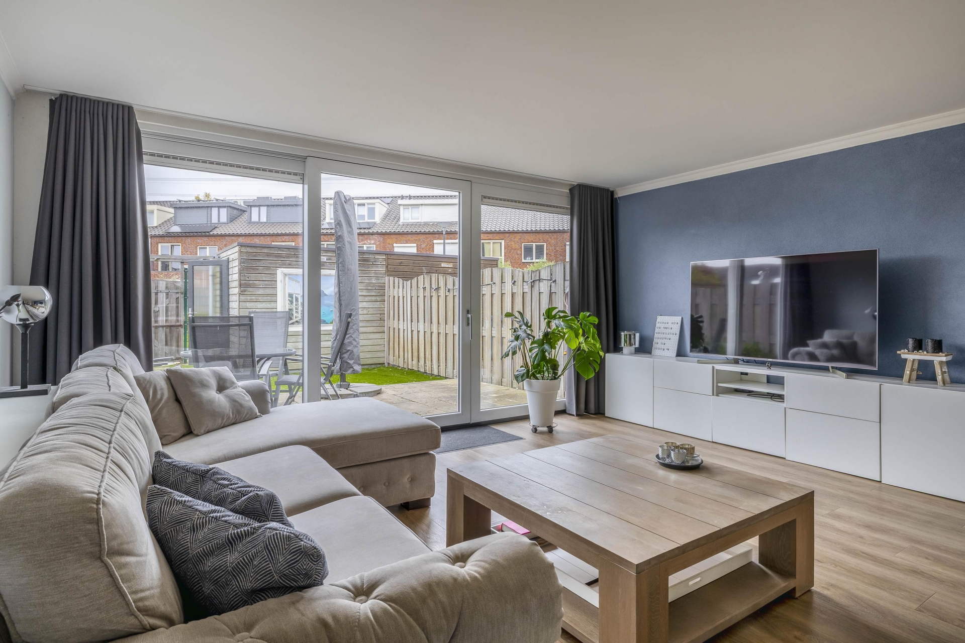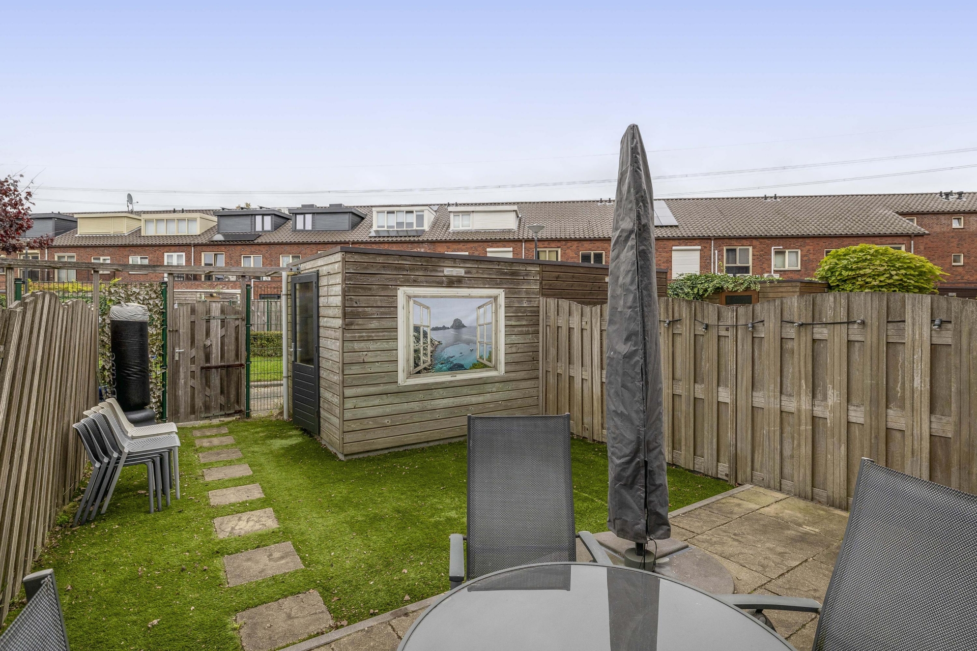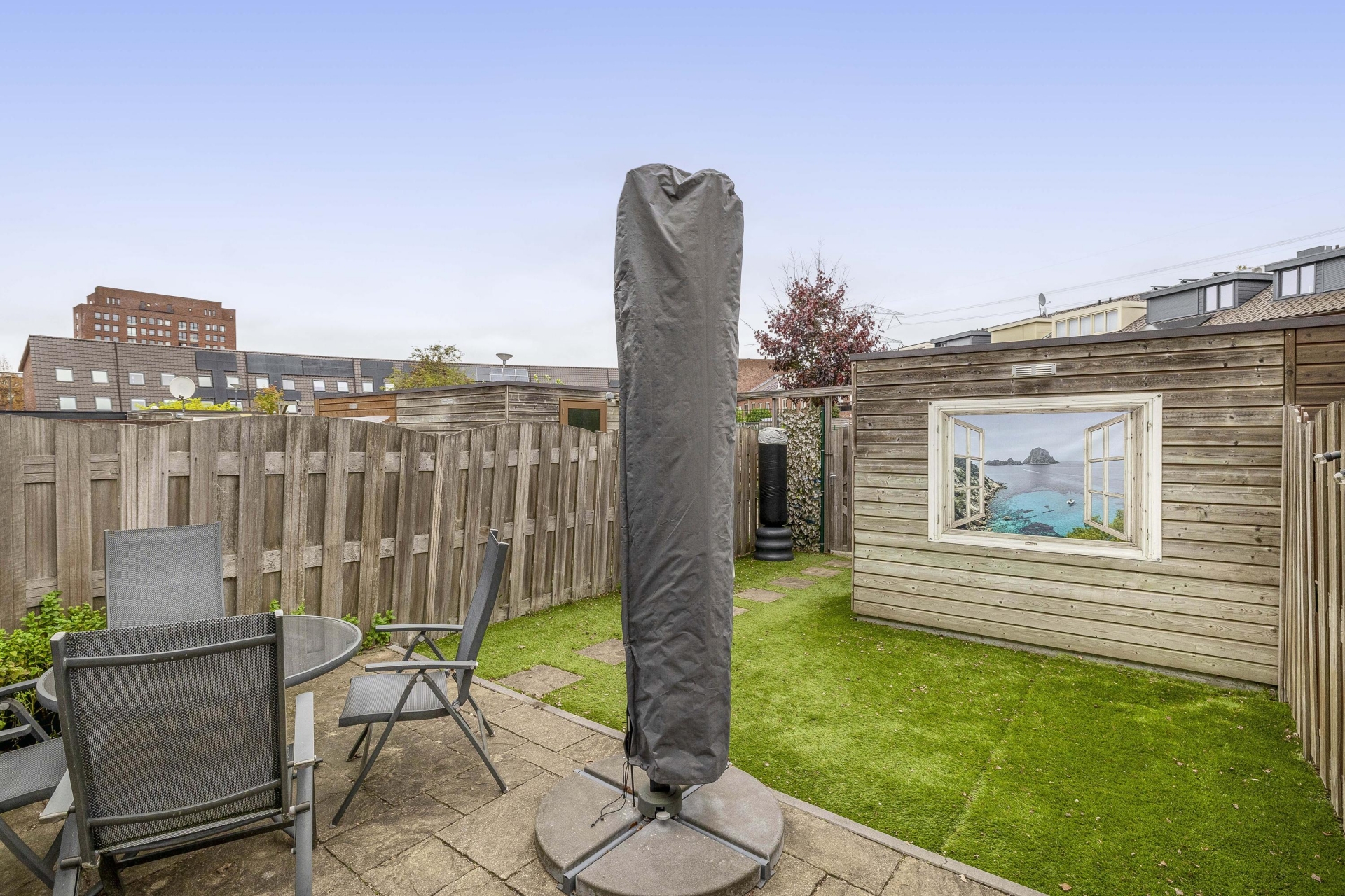 De achtertuin ligt op het zuidwesten: dat betekent volop zon in de middag en avond. De tuin is netjes aangelegd met kunstgras en een betegeld terras. Door de schuifpui vanuit de woonkamer loop je zo naar buiten, op warme dagen wordt dit echt een verlengstuk van je leefruimte.