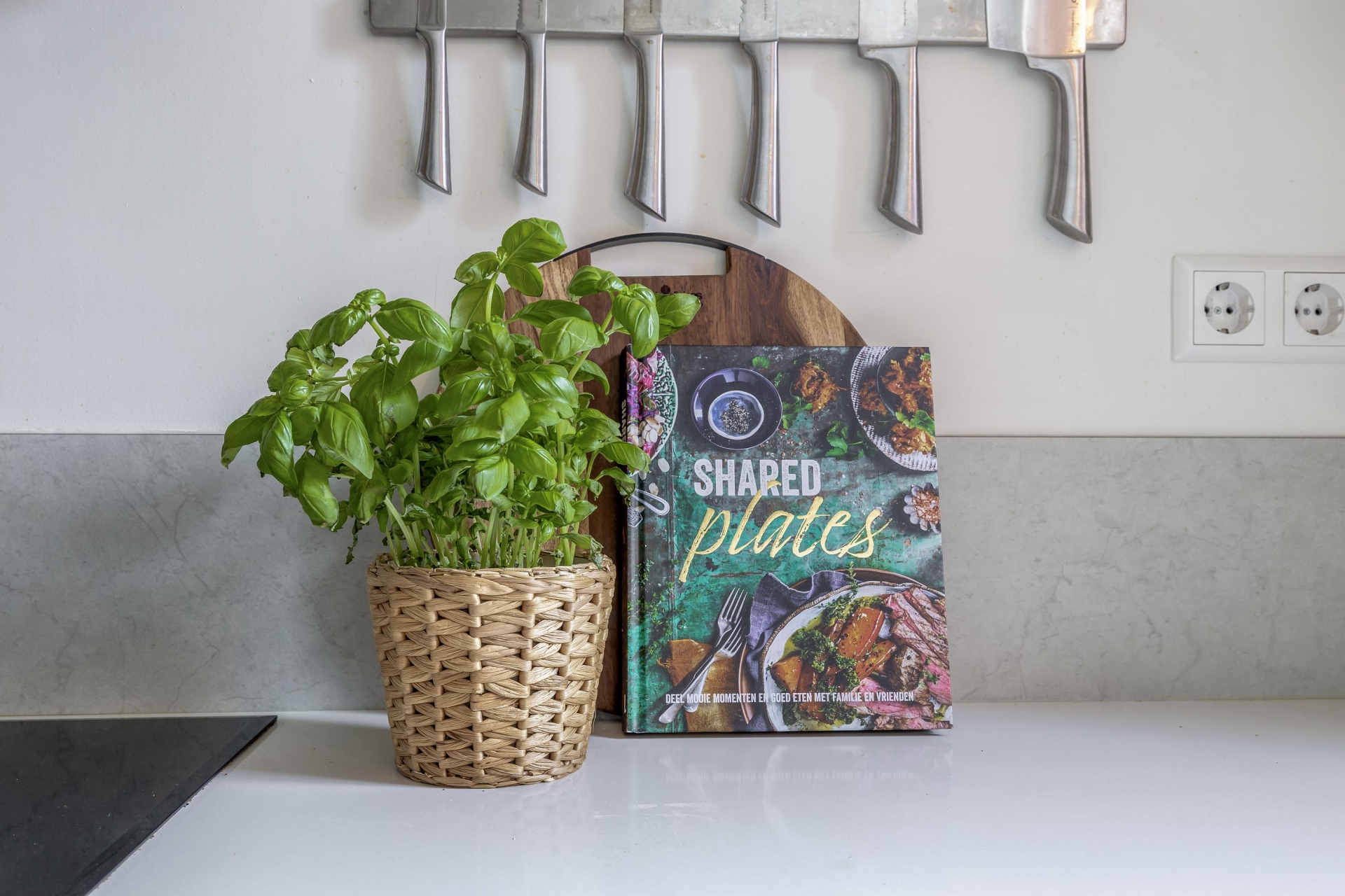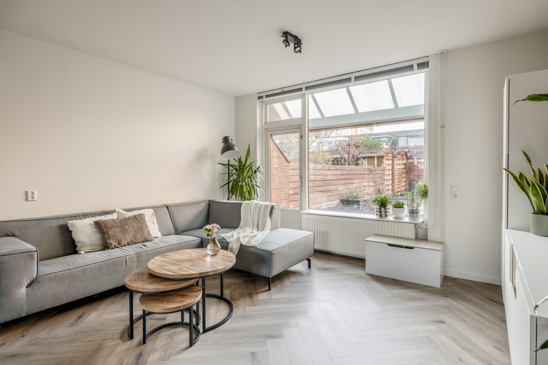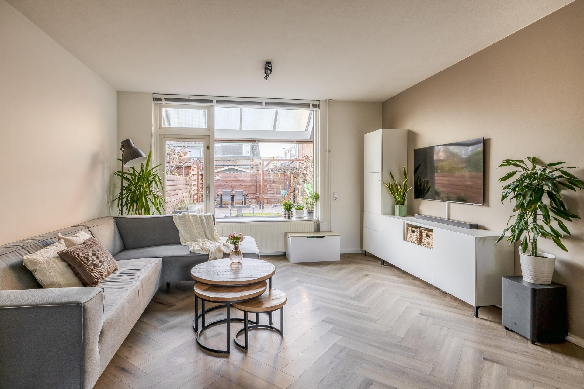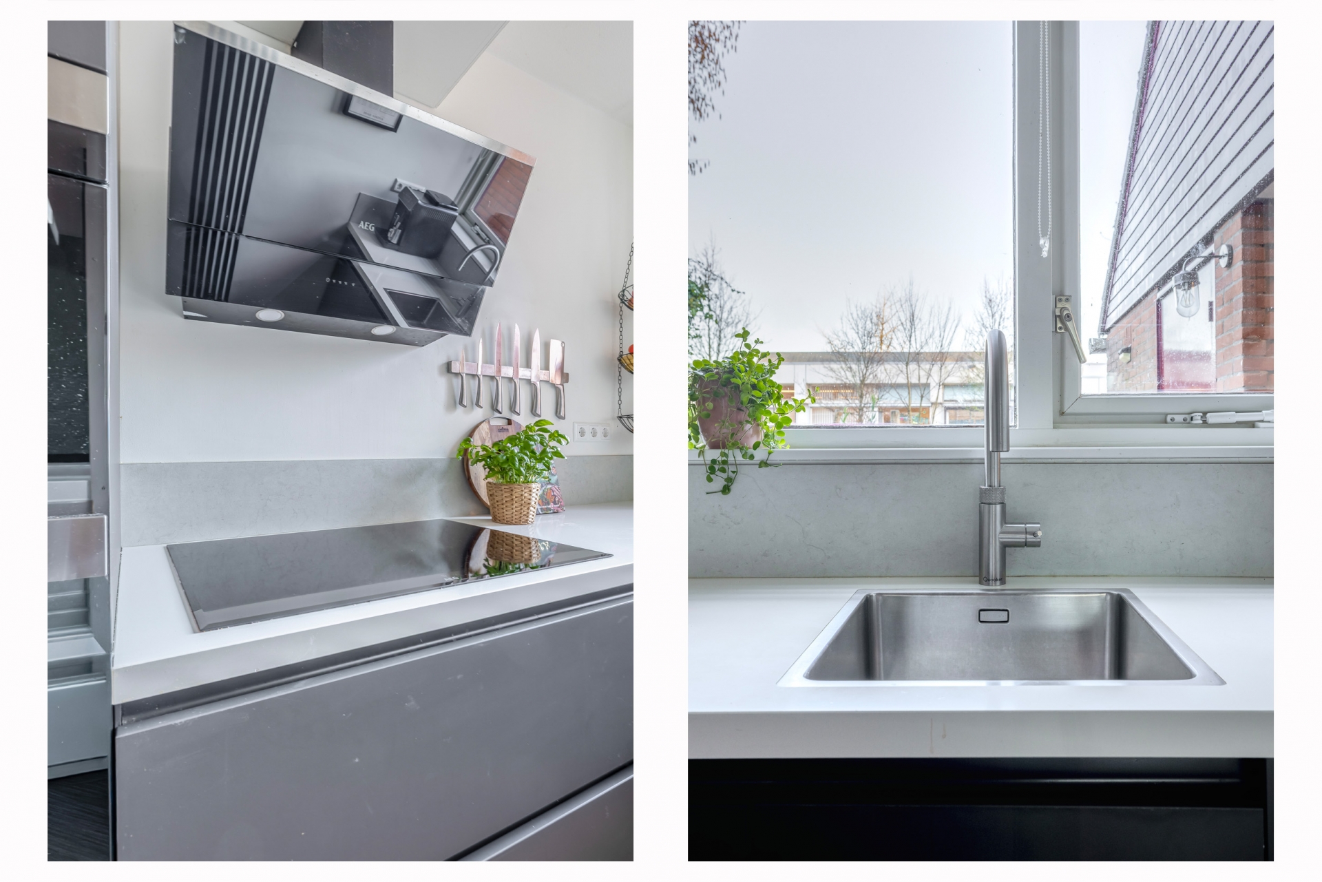 De woonkamer is een fijne, lichte ruimte met een strakke laminaat-visgraatvloer en een mooie overgang naar de halfopen keuken. De moderne keuken uit 2021 is uitgerust met inbouwapparatuur, een Quooker en veel werkruimte, een heerlijke plek voor kookliefhebbers. Het geheel heeft een eigentijdse uitstraling, met rustige kleuren en een praktische indeling.