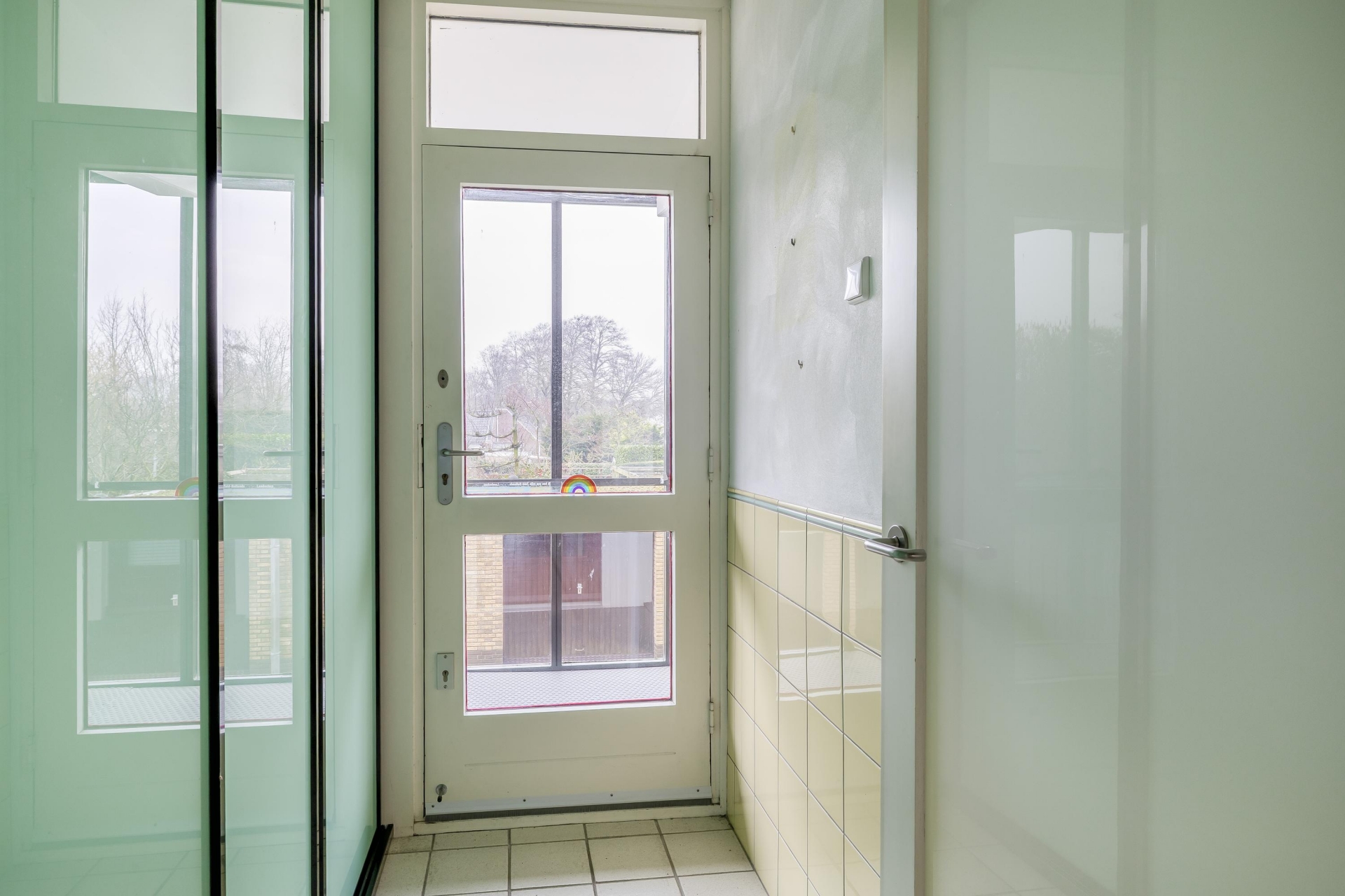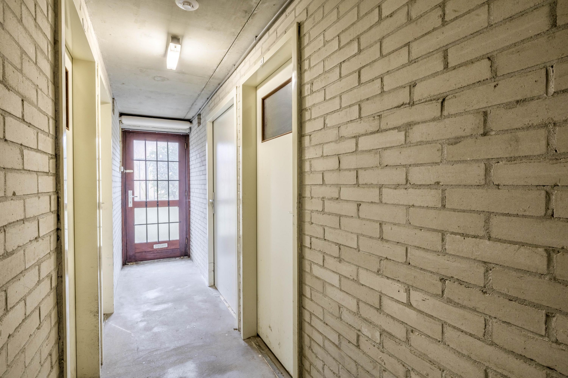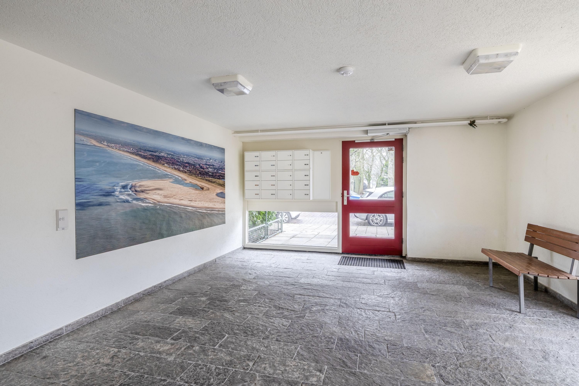 Afgesloten, gemeenschappelijke entreehal op de begane grond met bellen- en brievenbussen tableau, lift of trap naar de 1e verdieping.