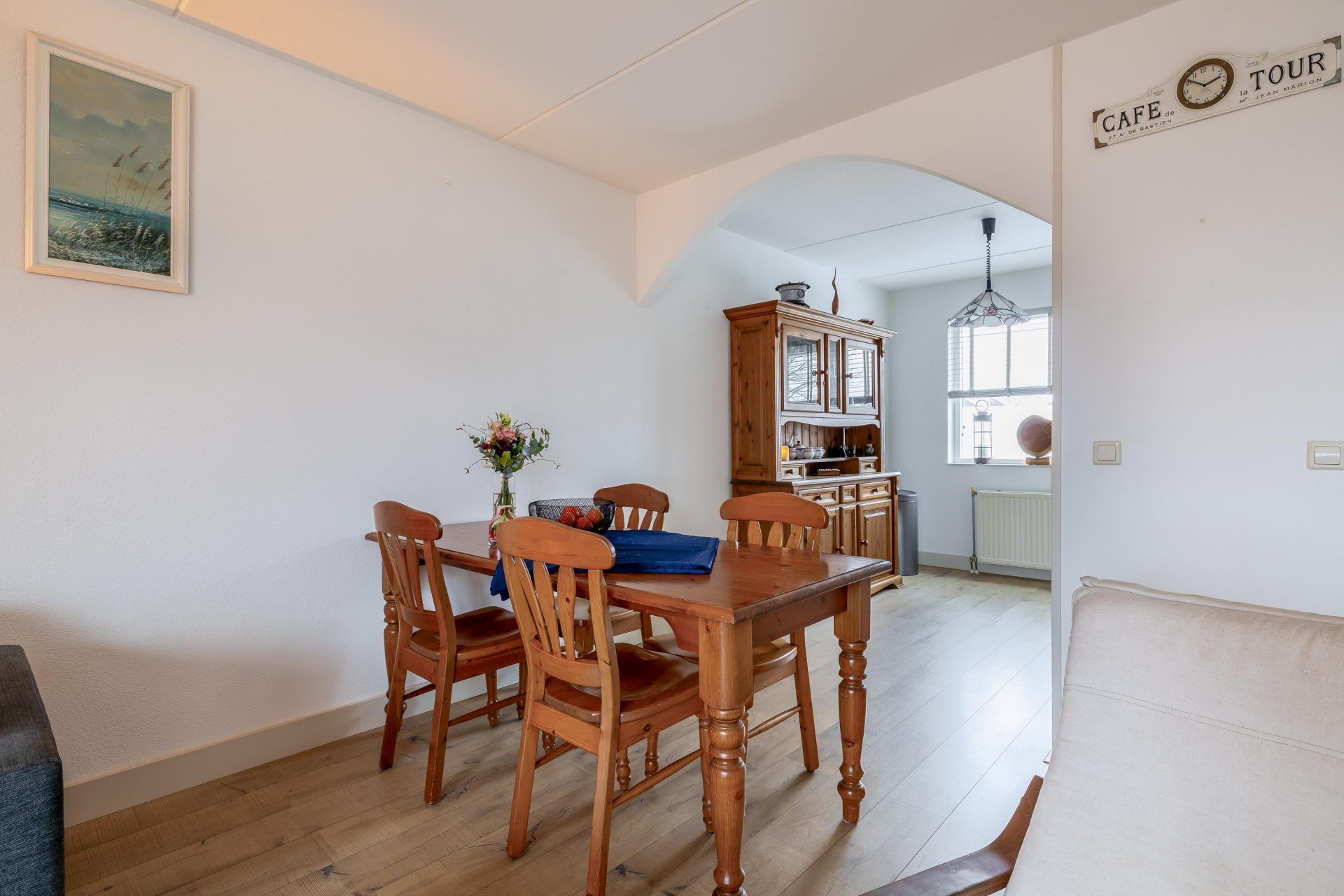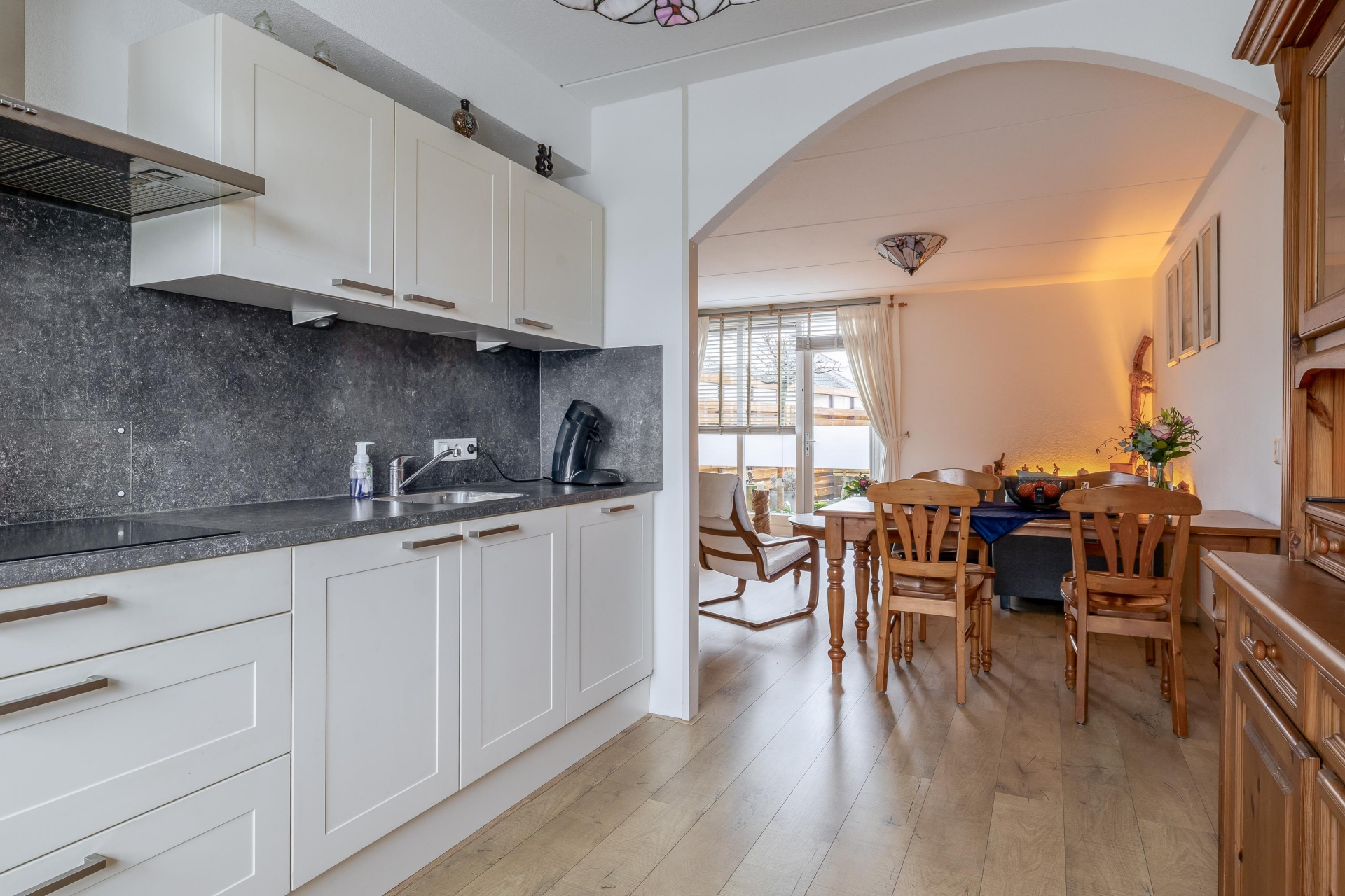 Aan de voorzijde van de woning ligt de halfopen keuken, die op een fijne manier in verbinding staat met de woonkamer. Deze is netjes afgewerkt en voorzien van diverse inbouwapparatuur. De landelijke stijl met neutrale kleuren sluit goed aan op de rest van het huis. Vanuit het raam kijk je uit over de rustige straat en speeltuin aan de voorzijde.