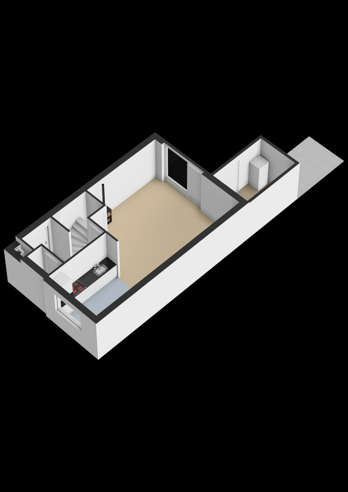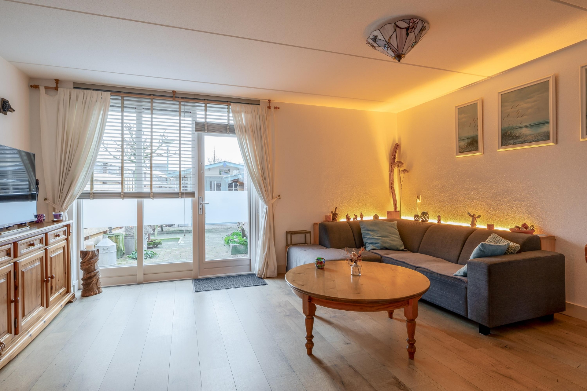Bij binnenkomst stap je via de hal met toilet en trapopgang de woonkamer in, waar je direct de warme sfeer voelt. De grote raampartijen aan de tuinzijde zorgen voor veel natuurlijk licht. Centraal in de woonkamer staat een sfeervolle houtkachel, perfect voor knusse avonden op de bank.