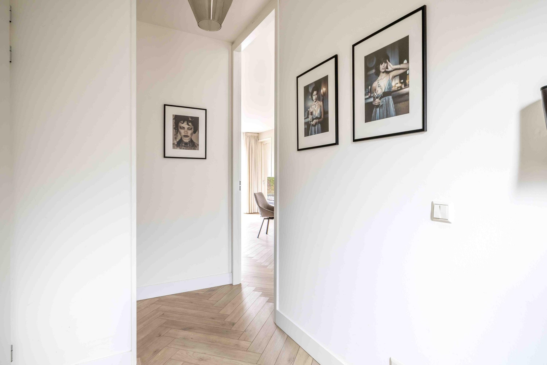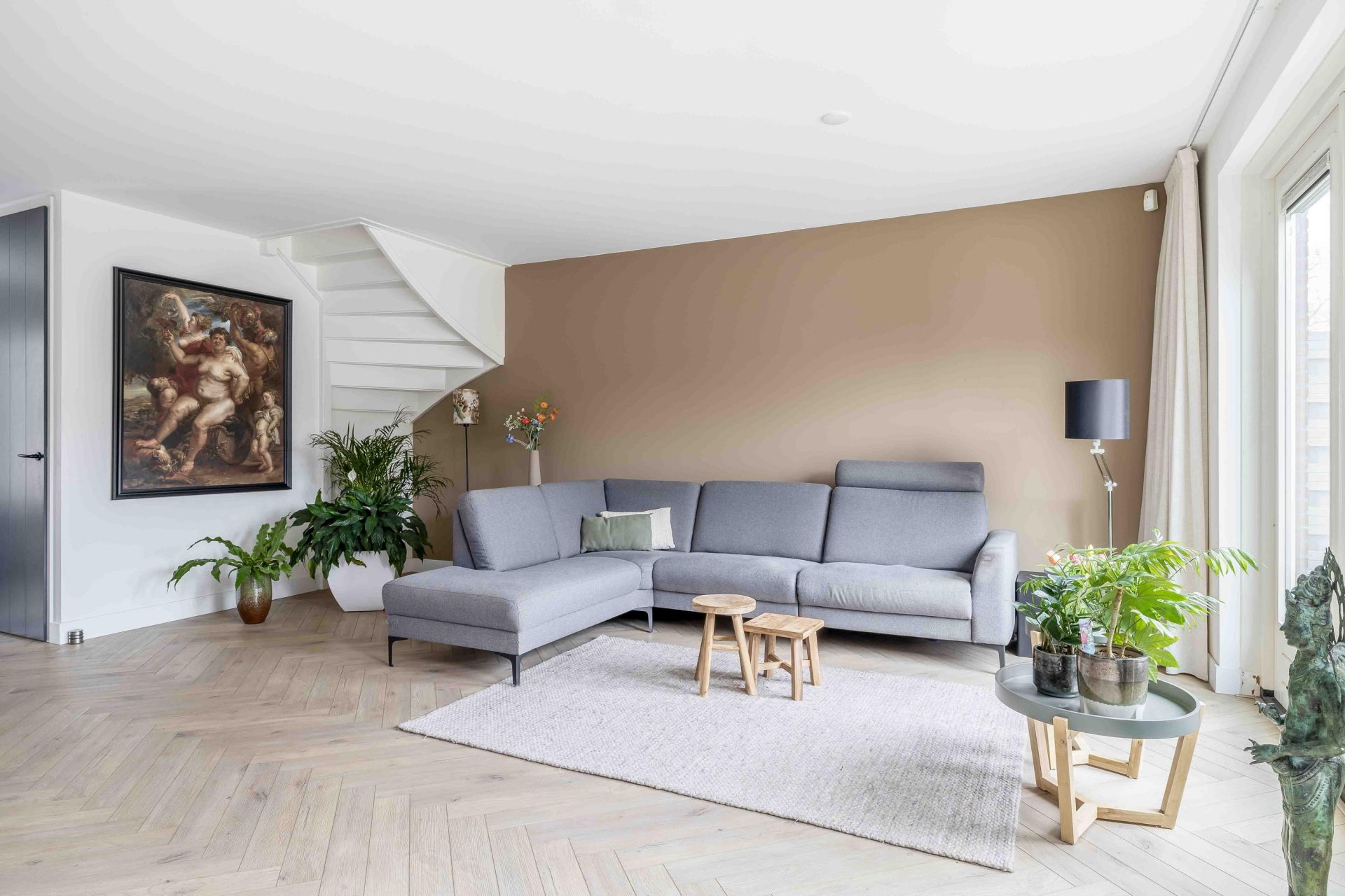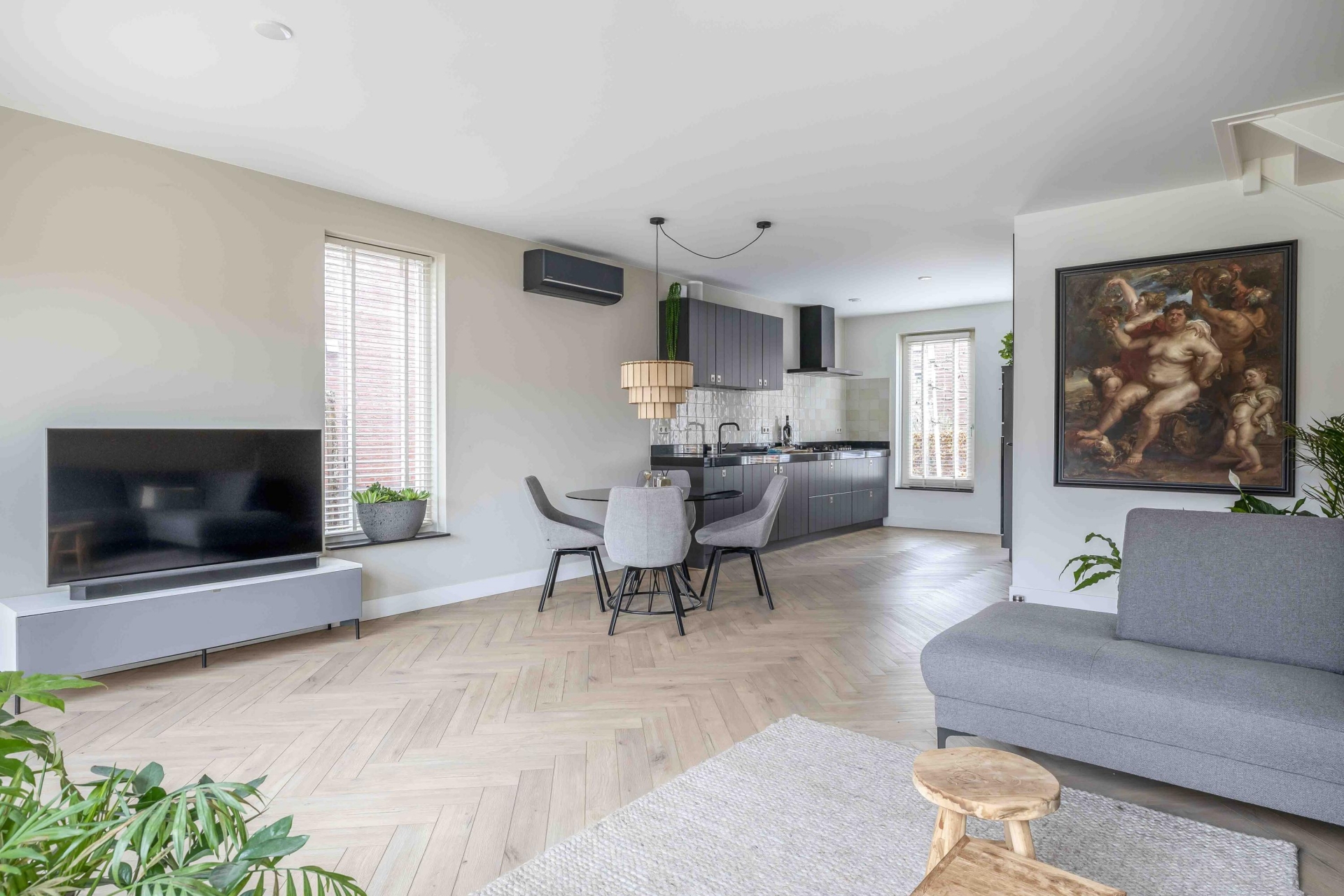 De klik-PVC vloer in visgraatmotief geeft de woonkamer een moderne, rustige uitstraling. Door de vloerverwarming voelt deze verdieping bovendien heerlijk comfortabel aan. De zithoek is ruim opgezet en goed in te delen, terwijl er aan de voorzijde plek is voor een grote eettafel waar je met gemak met familie en vrienden aanschuift. Het geheel oogt verzorgd en eigentijds, precies zoals je graag ziet in een huis dat echt af is.