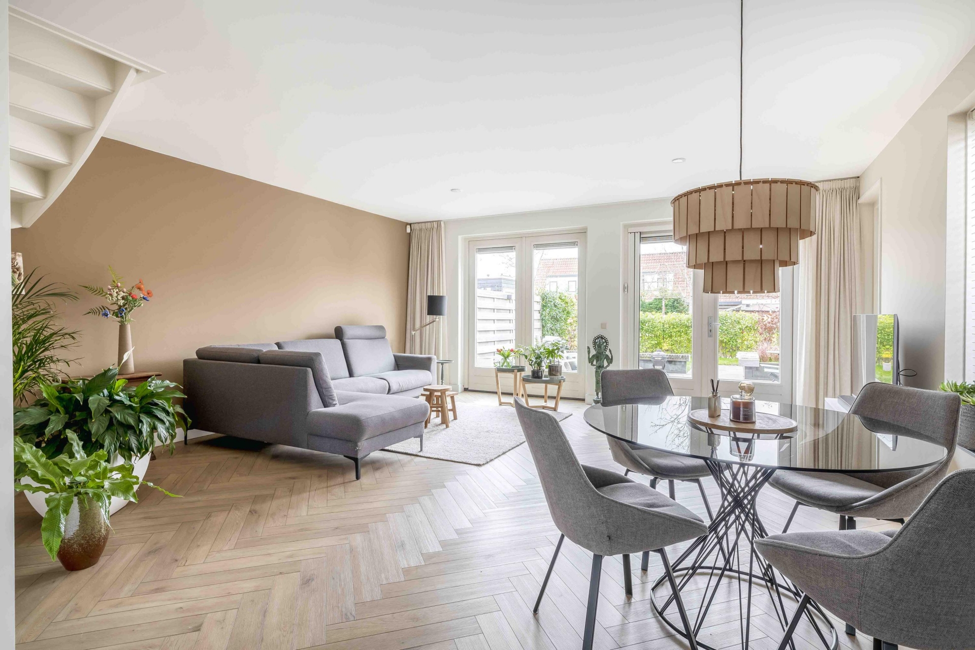 Zodra je binnenkomt valt direct op hoe ruim en licht de begane grond is. De woonkamer strekt zich uit over de volle breedte van het huis, waardoor je een royale leefruimte hebt die ideaal is voor gezinnen en iedereen die graag de ruimte om zich heen heeft. De grote ramen en openslaande deuren zorgen voor een fijne verbinding met de achtertuin en brengen veel daglicht naar binnen.