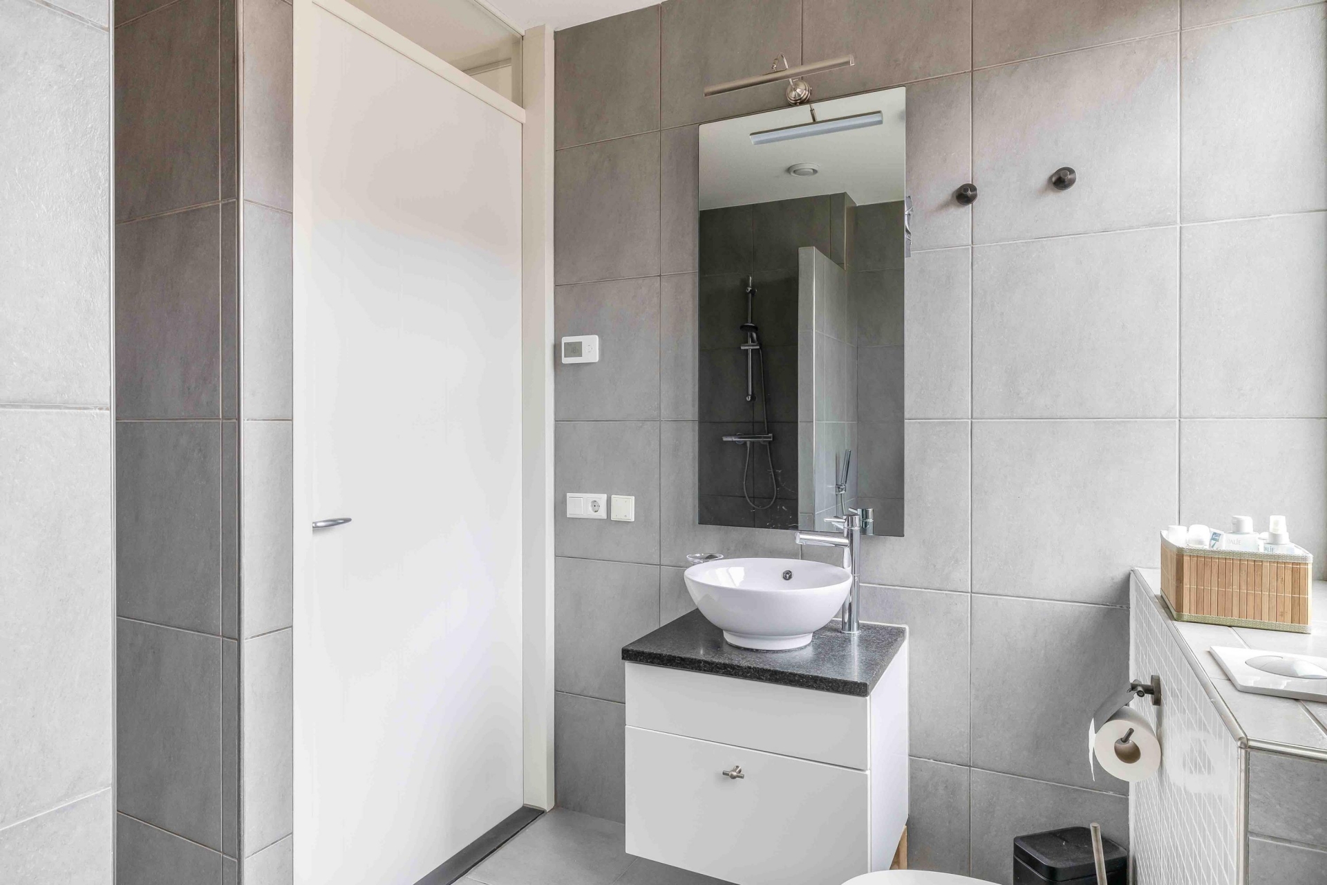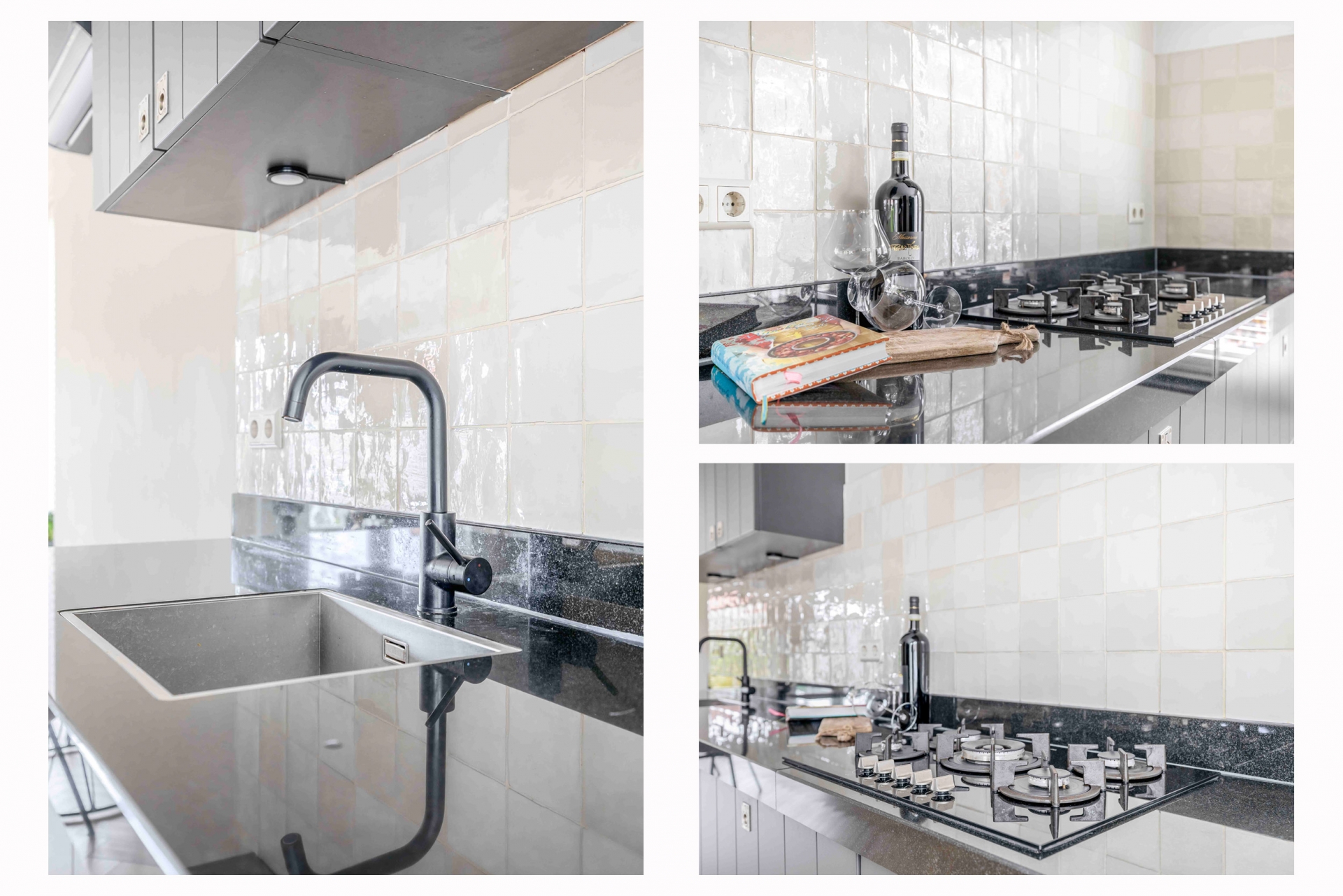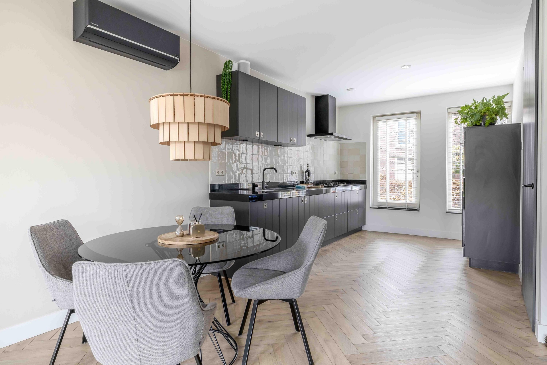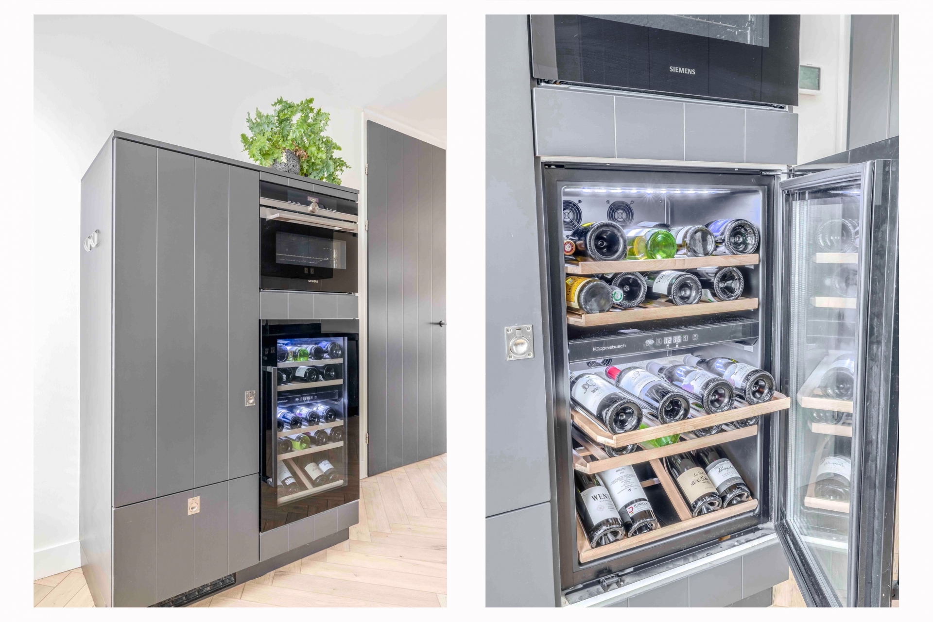 De keuken sluit perfect aan bij deze stijl. Het is een moderne, strakke keuken voorzien van alle benodigde inbouwapparatuur: een 5-pits kookplaat, oven, vaatwasser, koelkast én – als luxe extra – een wijnklimaatkast. Hierdoor is dit dé plek waar je met gemak een snelle maaltijd maakt of juist uitgebreid kookt voor een etentje.