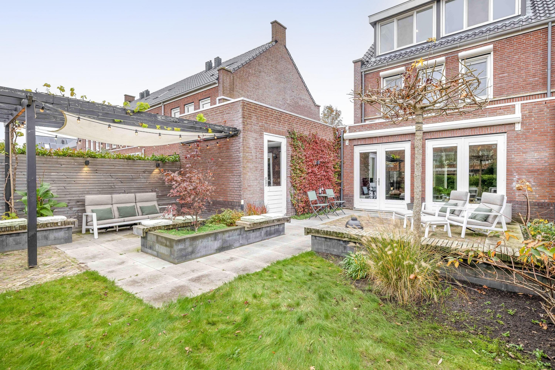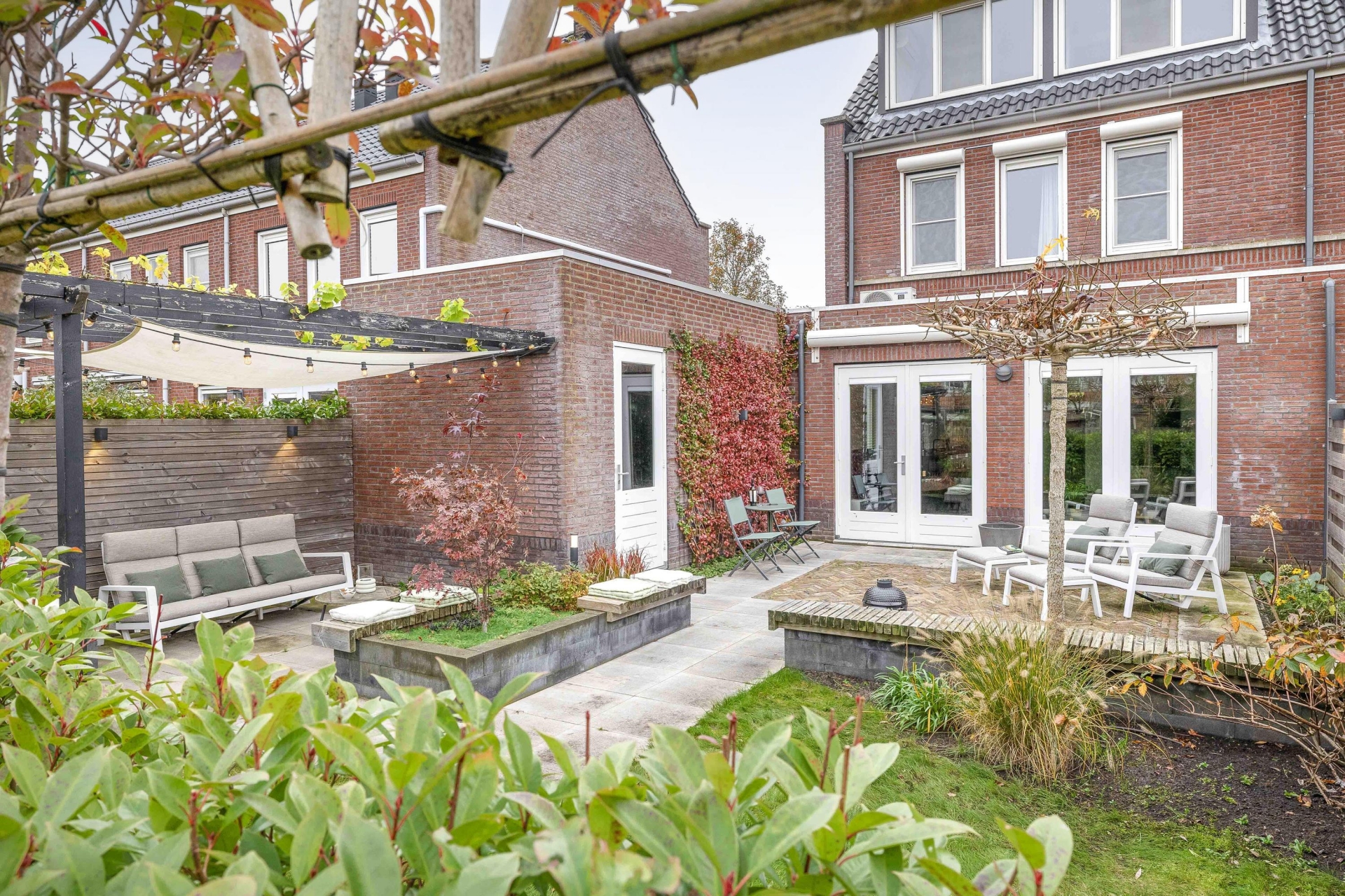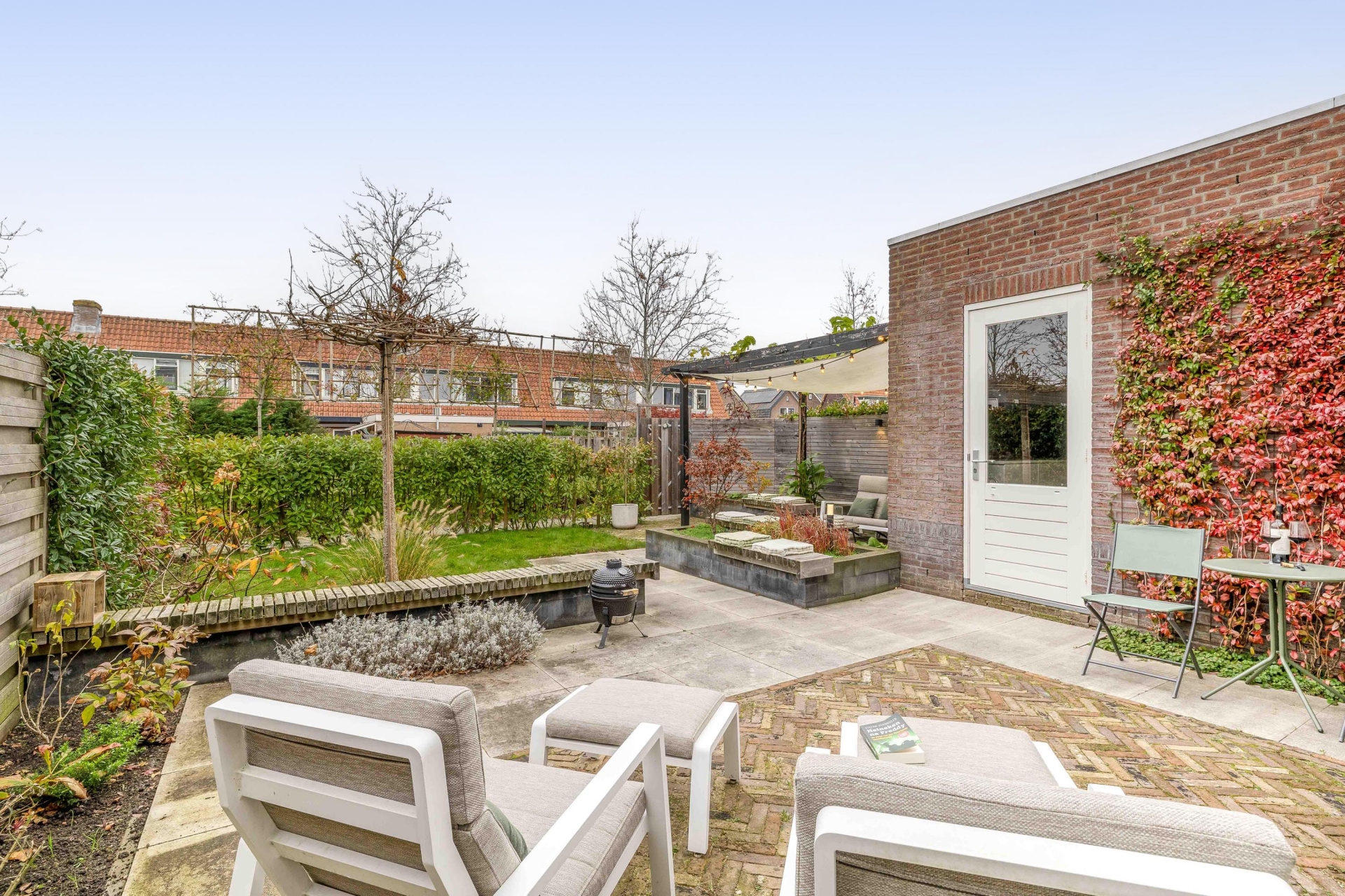 De achtertuin ligt op het noordwesten en er is de gehele dag wel een plekje in de de zon. De tuin is verzorgd aangelegd met meerdere fijne zitplekken, zodat je altijd wel ergens een zonnig of juist schaduwrijk plekje vindt. Het geheel voelt groen en ruim aan, met veel privacy. Dat maakt de tuin een heerlijke plek om te ontspannen, te barbecueën of de kinderen vrij te laten spelen.