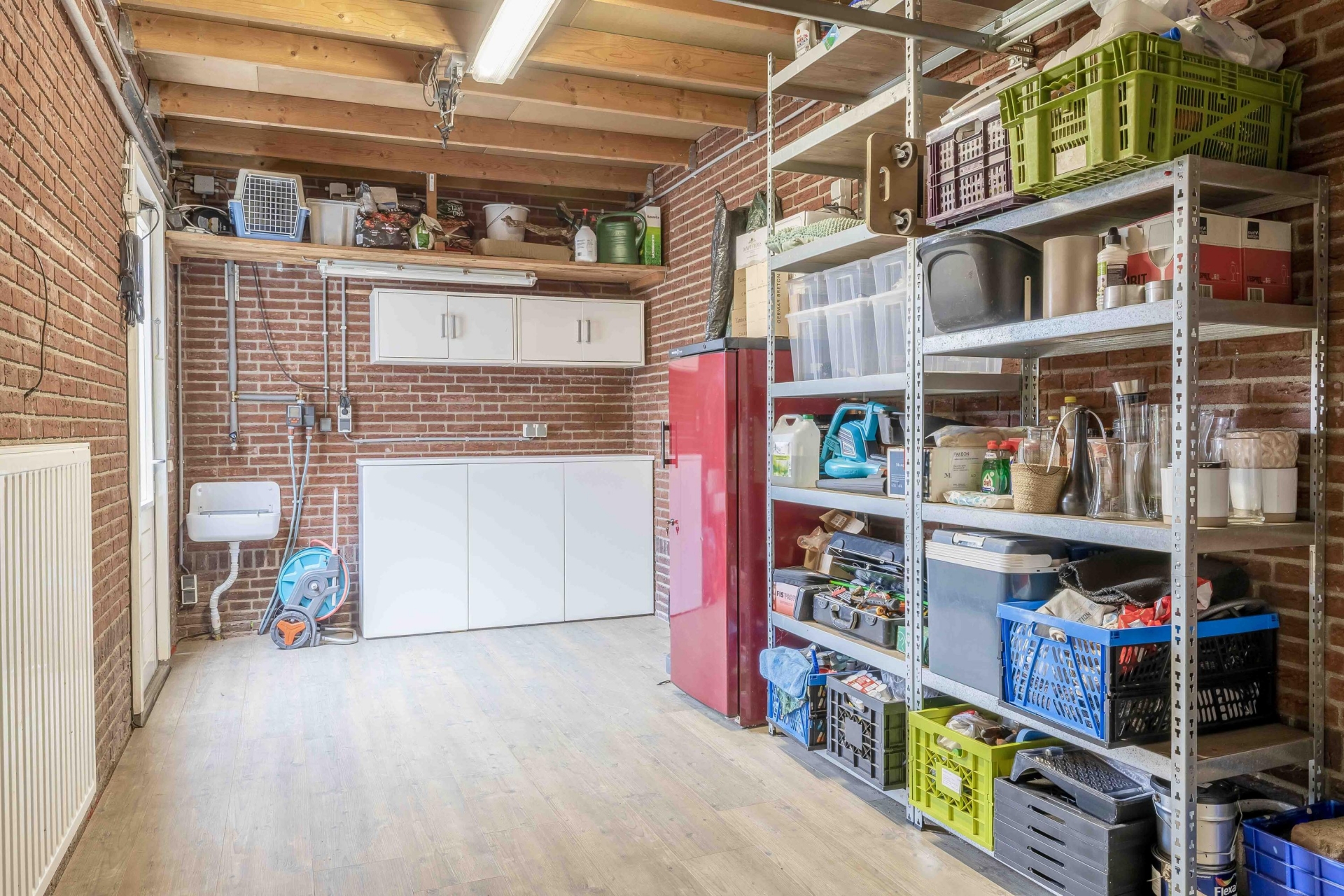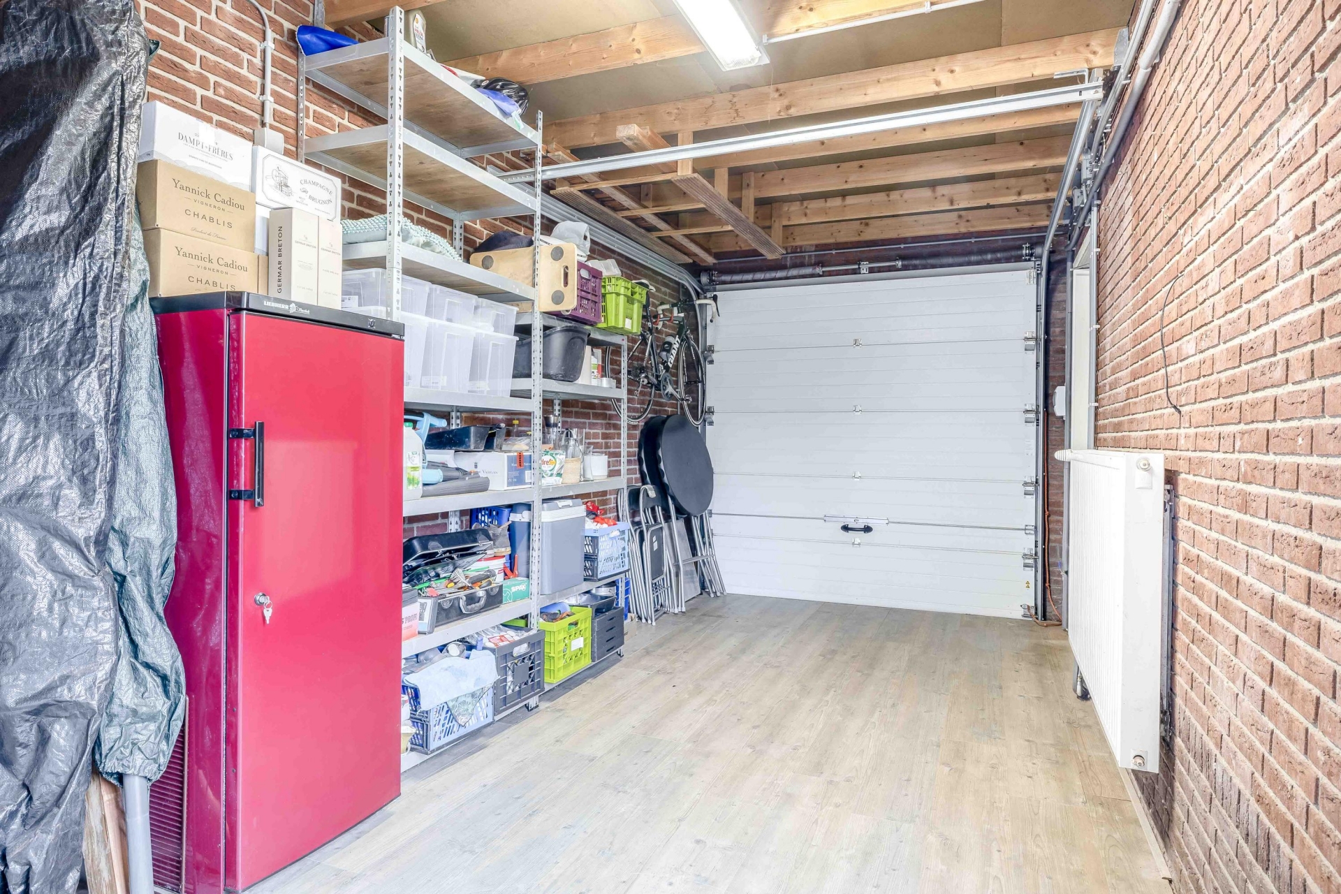 Aan de zijkant van het huis bevindt zich de aangebouwde stenen garage, die via een deur in de woonkamer bereikbaar is. Deze is volledig voorzien van verwarming, water en elektra, waardoor het niet alleen een ideale plek is voor auto of fietsen, maar ook voor klussen, opslag of hobby’s of wellicht als verlengstuk van de woonkamer. De oprit biedt plek voor twee auto’s achter elkaar. Aan de gevel hangt bovendien een laadpaal, perfect voor wie elektrisch rijdt.