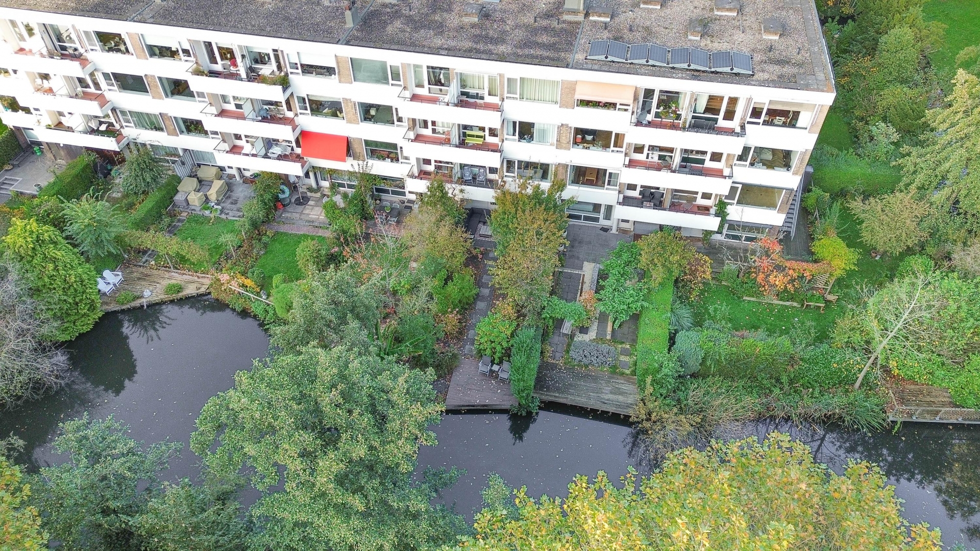 Aan de achterzijde ligt de ruime tuin van circa 10 meter diep en gelegen op het zuiden. Hier geniet je volop van de zon. De vlonder is recent vervangen en vormt een prettige basis voor een terras of loungeplek. De tuin is bereikbaar via het pad aan de overkant, wat praktisch is voor onderhoud of het aan- en afvoeren van spullen. Er is zelfs gedacht aan slimme oplossingen zoals een piepschuim vlot voor tuinonderhoud via het water. Met deze diepte en ligging op het zuiden heb je hier echt een volwaardige buitenruimte die het huis compleet maakt.