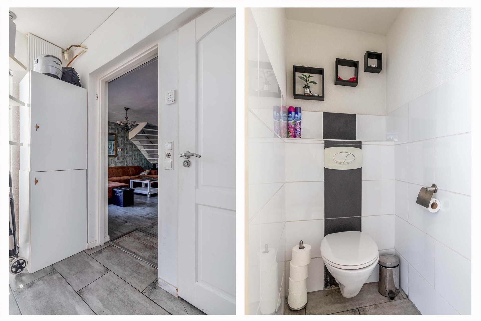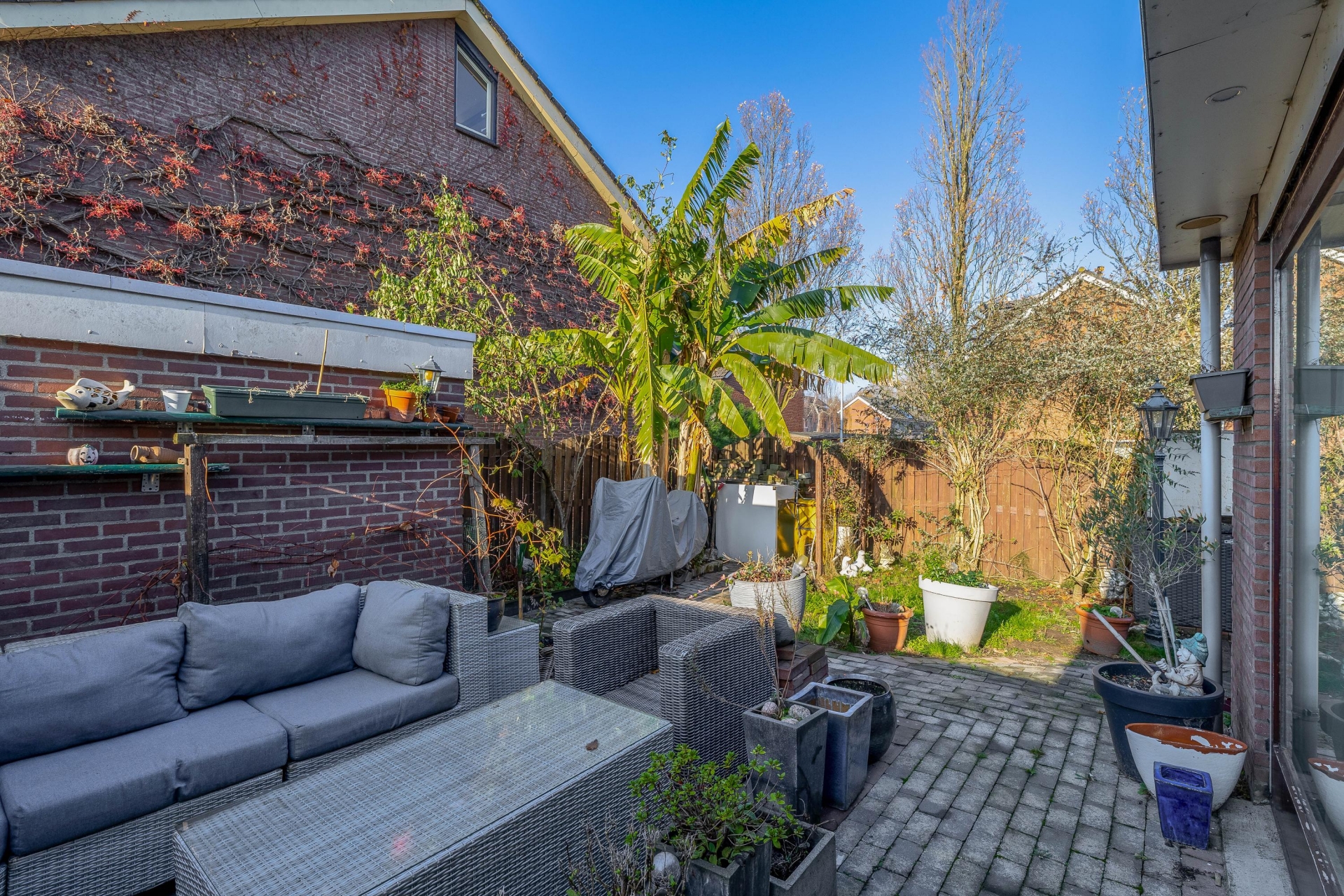 De achtertuin ligt op het westen, wat betekent dat je hier vooral in de middag en avond van de zon geniet. Een heerlijke plek om buiten te eten of lekker te ontspannen. De tuin is grotendeels bestraat en dus onderhoudsvriendelijk. Achterin de tuin staat een berging en via de zijkant heb je directe toegang tot de ruime garage. Aan de voorzijde biedt de oprit plek voor meerdere auto’s op eigen terrein, geen gedoe met parkeren dus. De ligging op de hoek zorgt bovendien voor extra privacy en een vrijer gevoel.