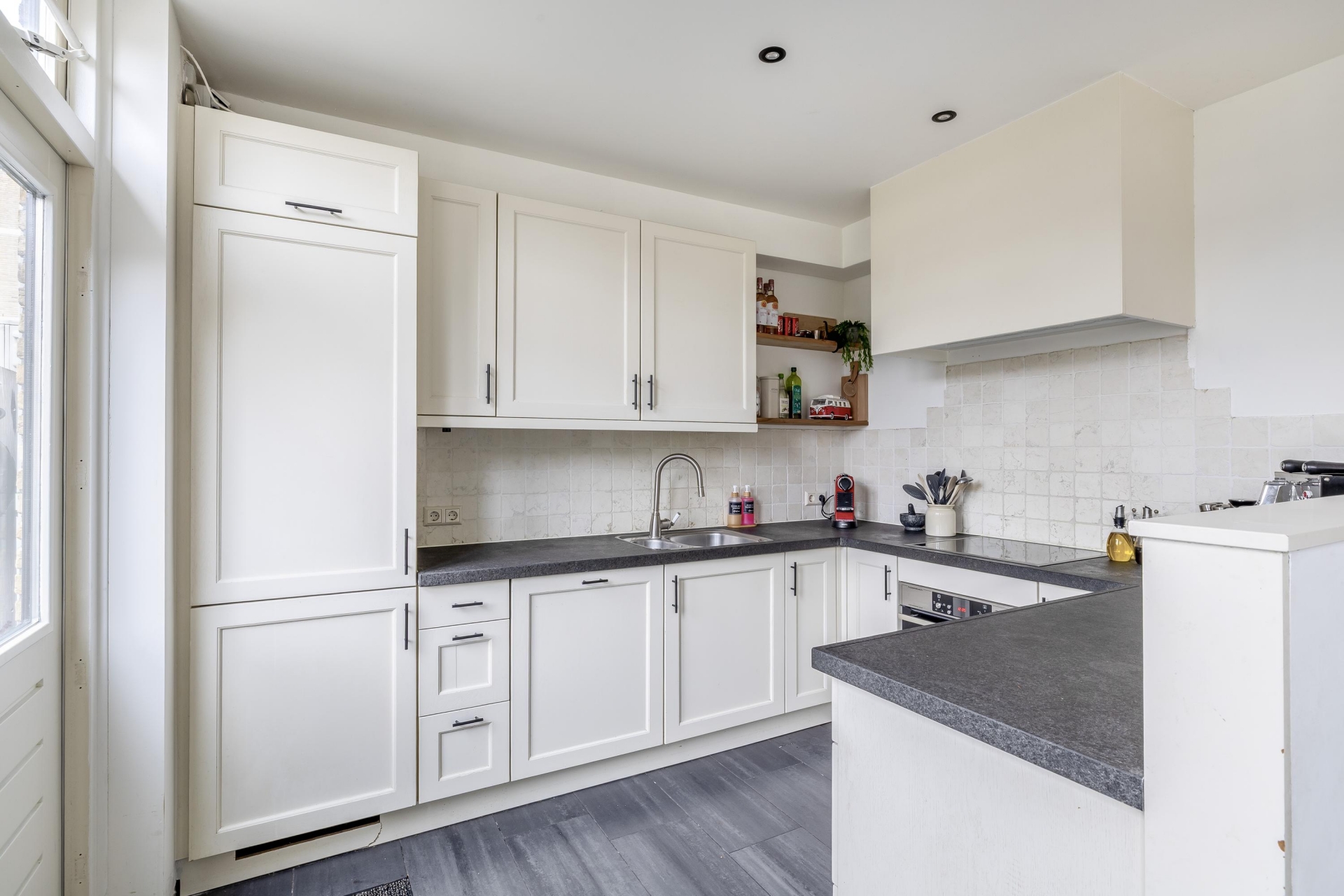 Bij binnenkomst valt direct de prettige indeling op. De woonkamer aan de voorzijde heeft een grote erker dat zorgt voor veel daglicht en een vrij uitzicht over de straat. Hierdoor voelt de ruimte licht en open aan. Het is een fijne plek om een comfortabele zithoek te creëren waar je samenkomt na een lange dag. Aan de achterzijde van het huis bevindt zich de open keuken. Deze is netjes uitgevoerd in een lichte kleurstelling en heeft een ruime opstelling met voldoende werkruimte en kastruimte. Dankzij de open verbinding met het eetgedeelte blijf je altijd in contact met je gasten of gezin tijdens het koken.