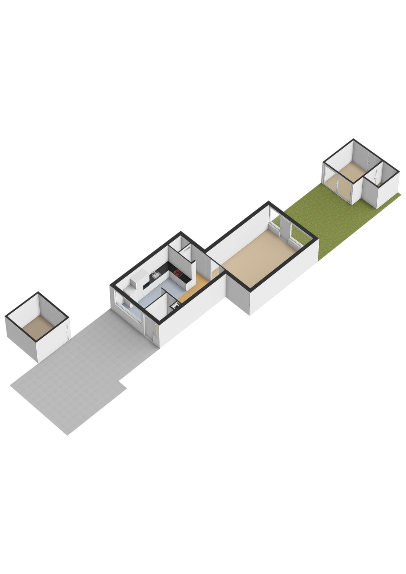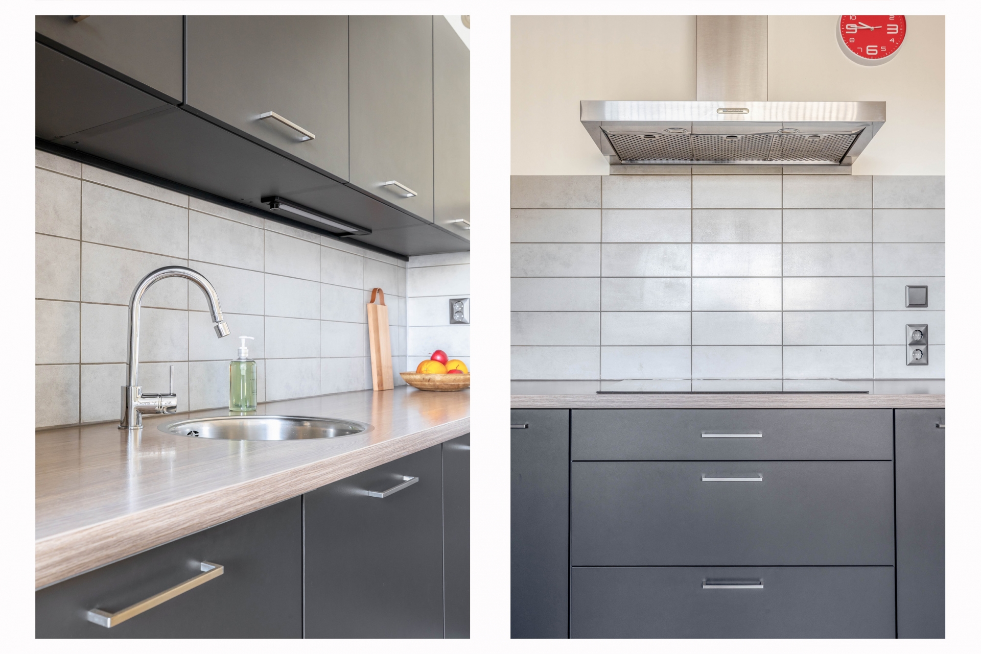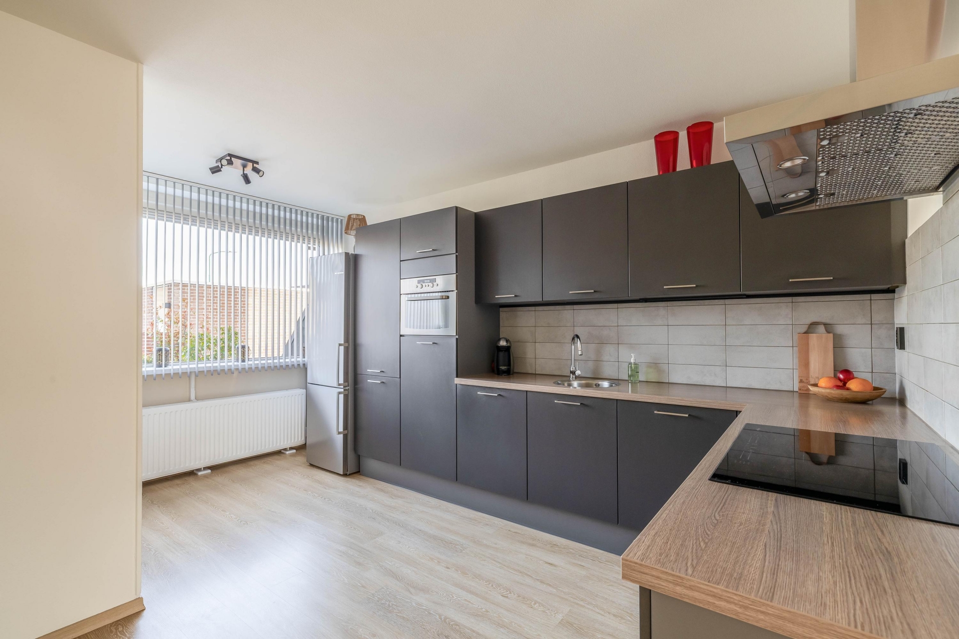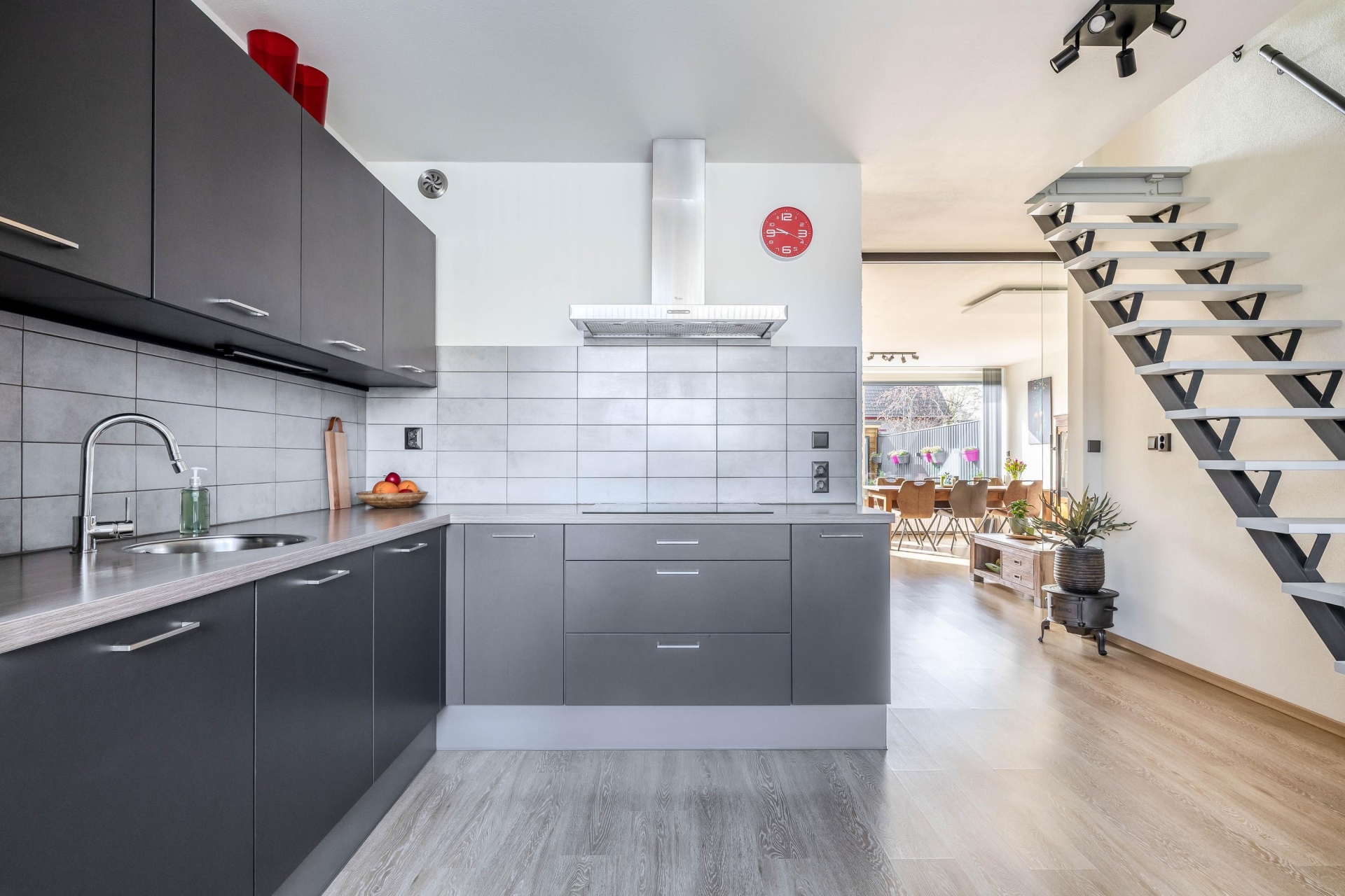 Aan de voorzijde van het huis ligt de keuken. Deze is modern uitgevoerd met strakke fronten en een praktisch werkblad. Je hebt hier alle ruimte om te koken en voldoende kastruimte voor al je spullen. Door de opstelling blijft de verbinding met de rest van het huis prettig en open.