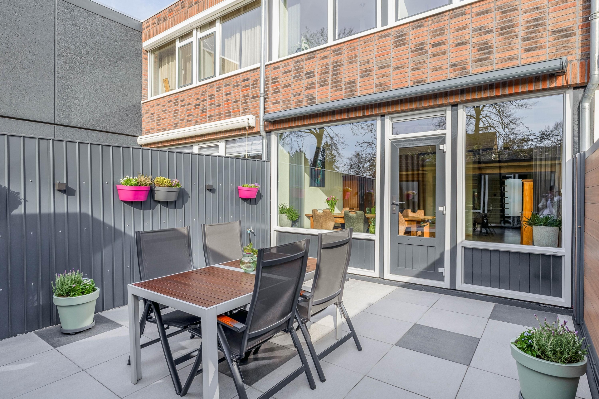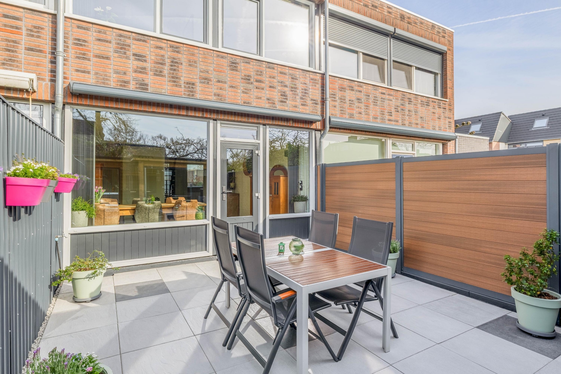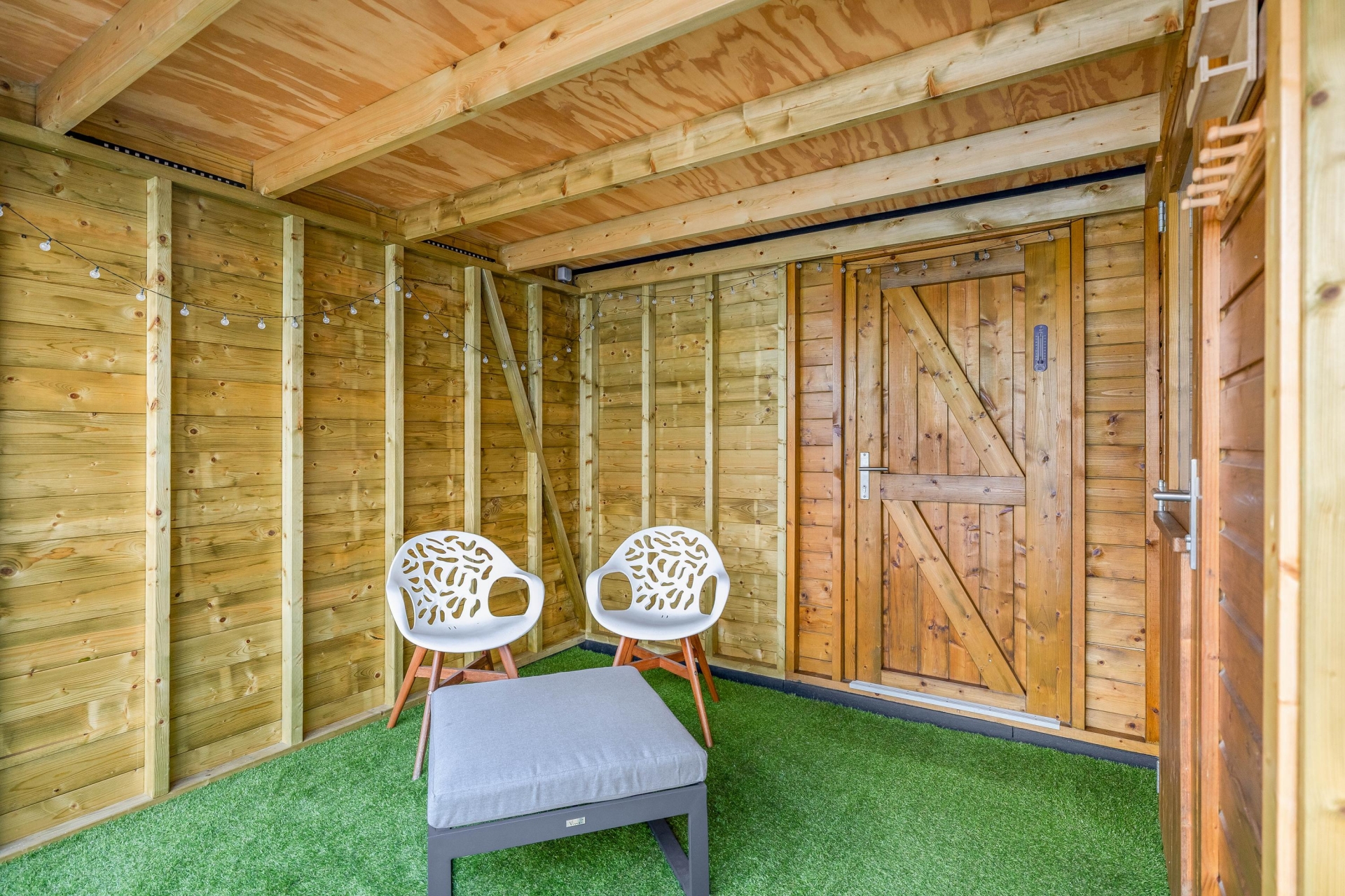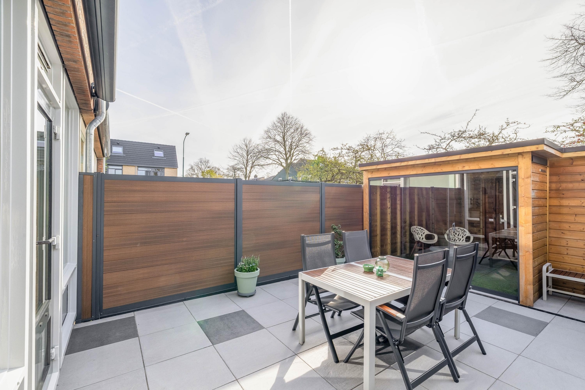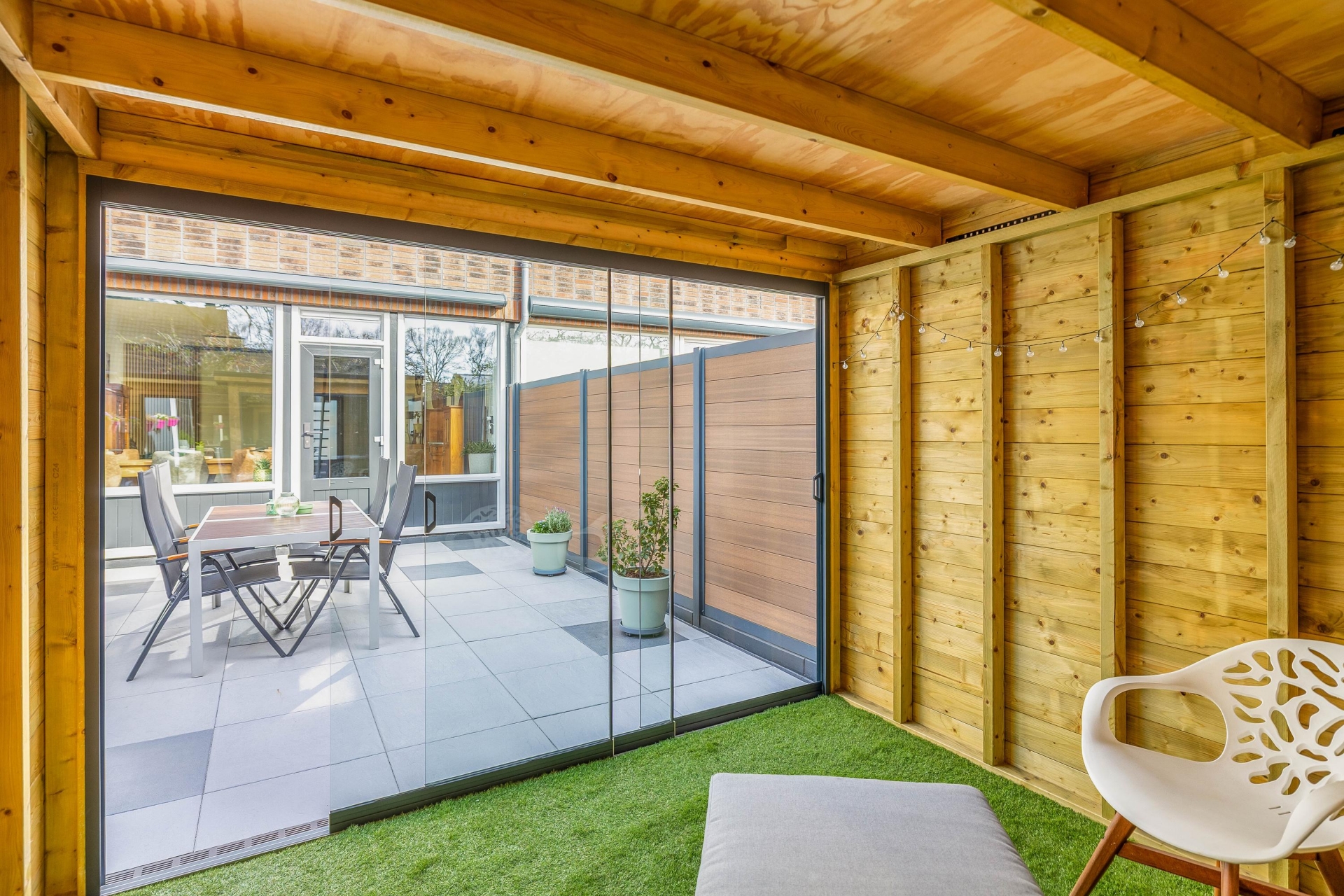 Aan de achterzijde stap je zo de tuin in. En dat is er eentje waar je blij van wordt. Gelegen op het zuiden, dus de hele dag zon, en netjes aangelegd met een groot terras waar je met gemak een ruime eettafel kwijt kunt. Achterin de tuin vind je een fraai tuinhuis met berging, ideaal als extra zitplek, hobbyruimte of om spullen netjes op te bergen. De achterom maakt het geheel extra praktisch.