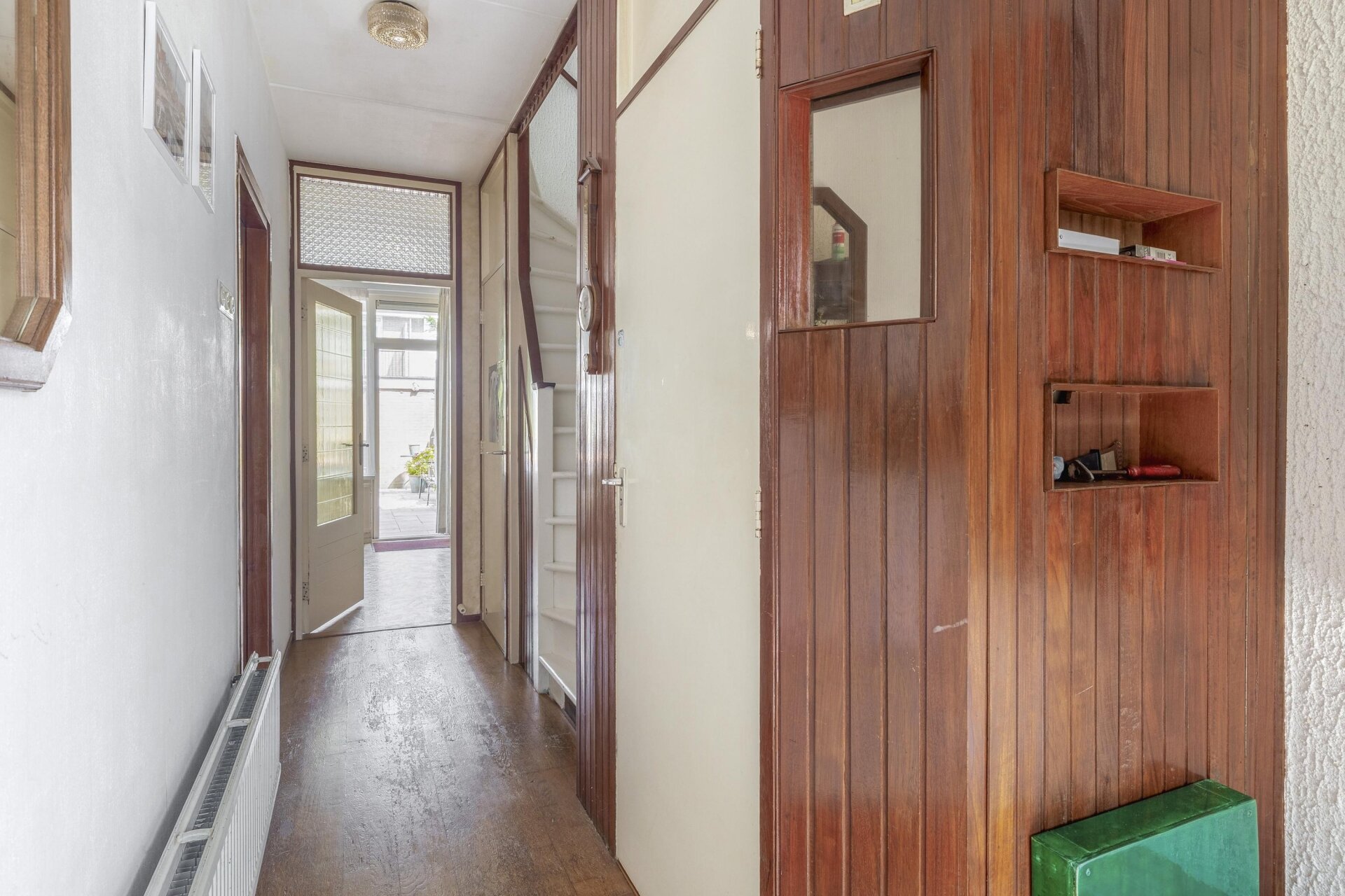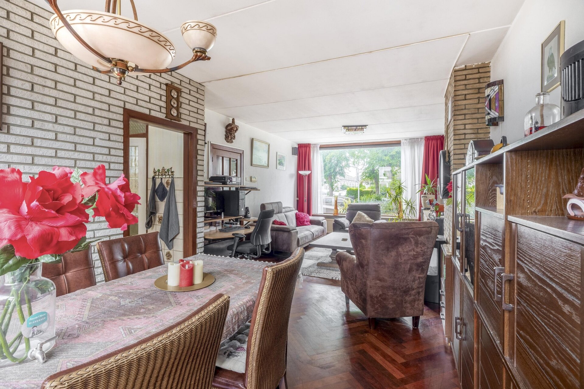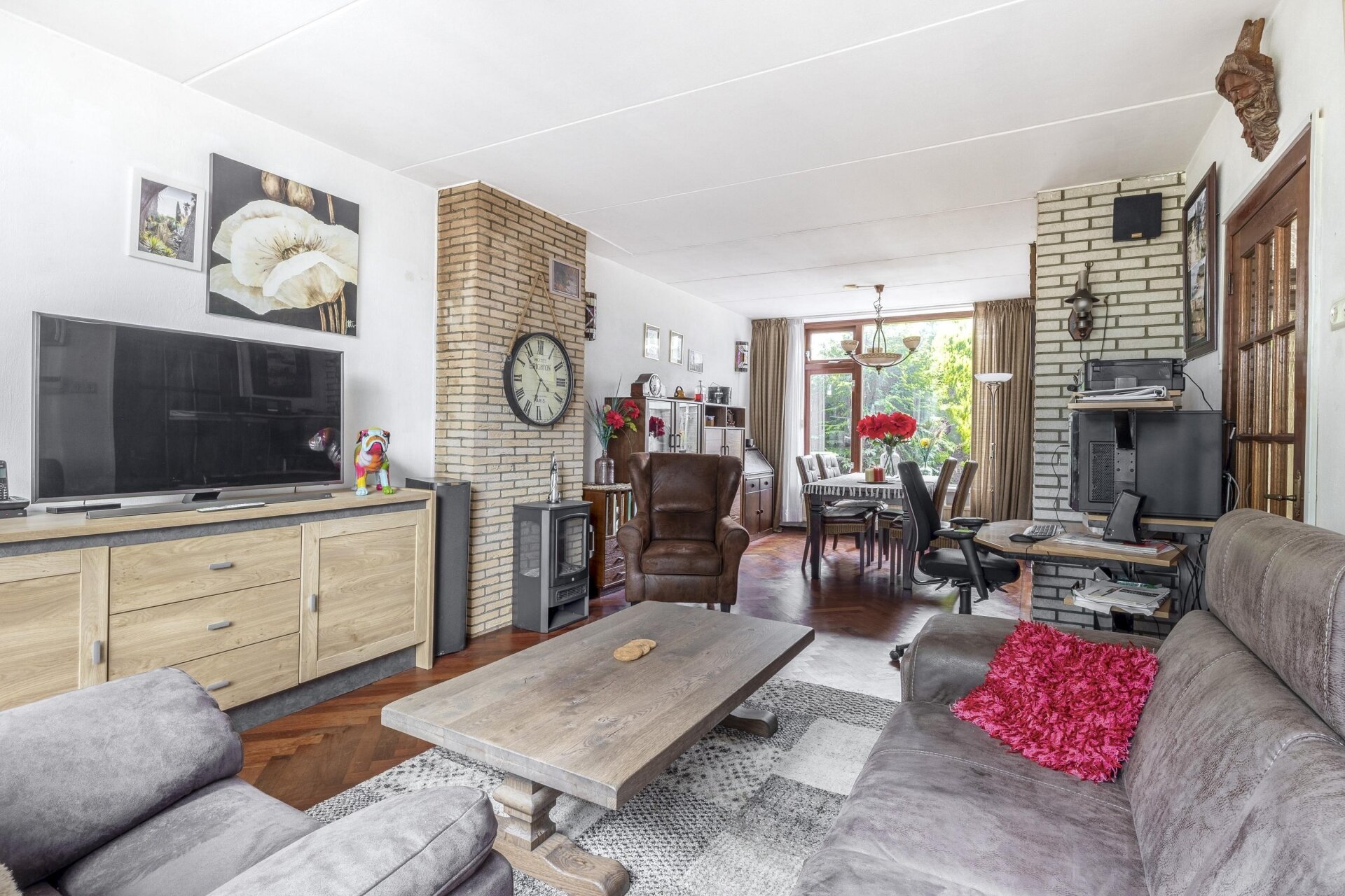 Je stapt het huis binnen via de onderhoudsvriendelijke voortuin, die direct een verzorgde indruk maakt. De hal biedt toegang tot een net toilet, een trapkast en de woonkamer. De doorzonwoonkamer is verrassend licht dankzij de grote raampartijen aan beide zijden. Hier is voldoende ruimte voor een comfortabele zithoek aan de voorzijde en een grote eettafel richting de tuin. De woonkamer is afgewerkt met een warme parketvloer en heeft een gezellige elektrische kachel.