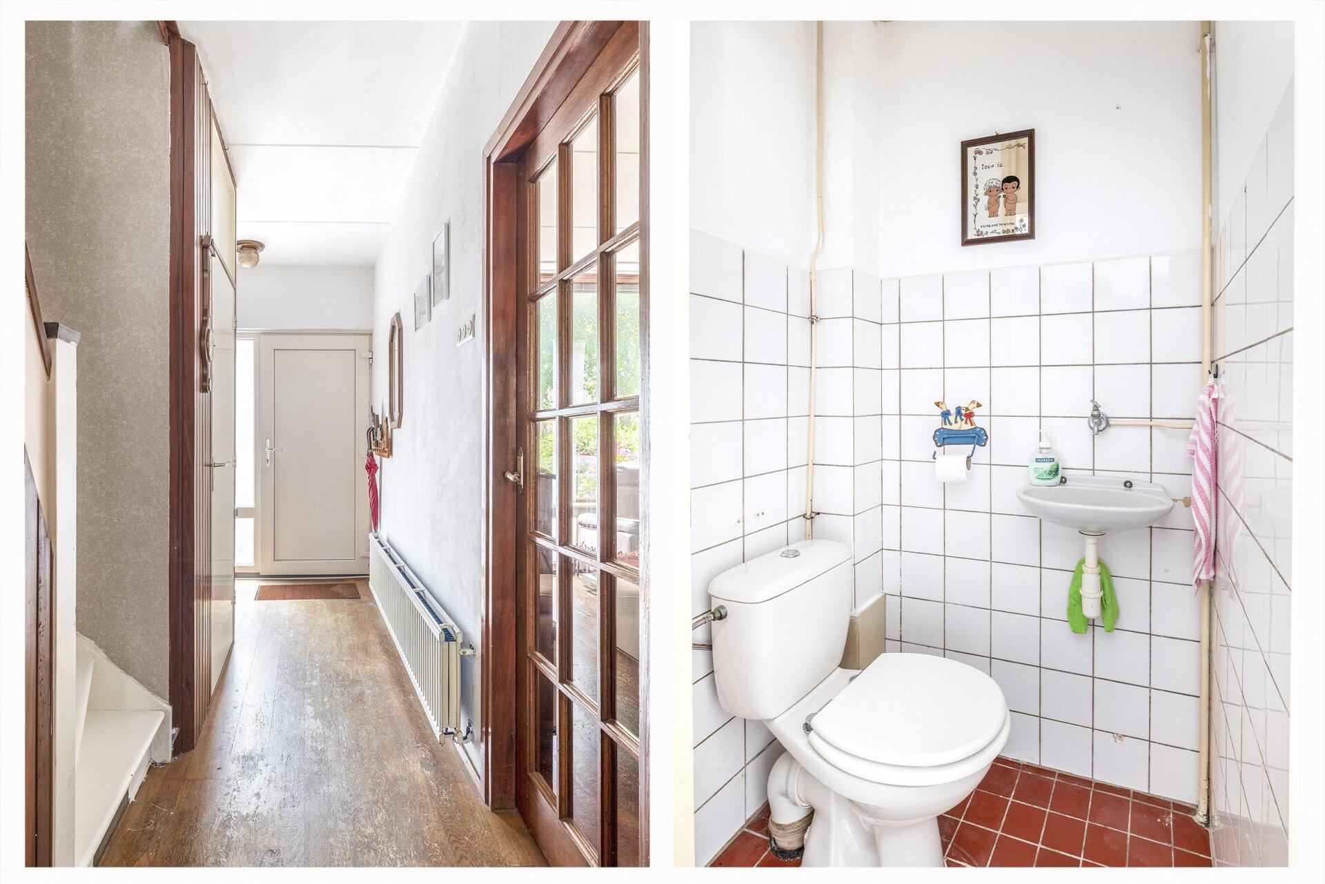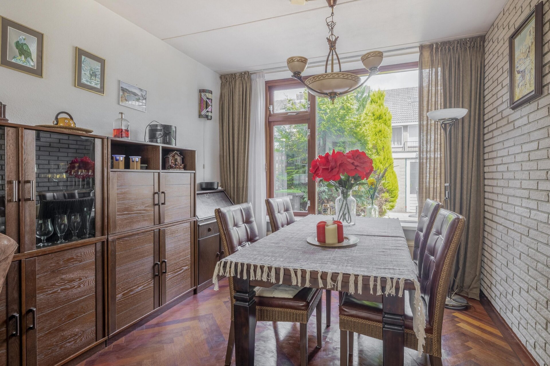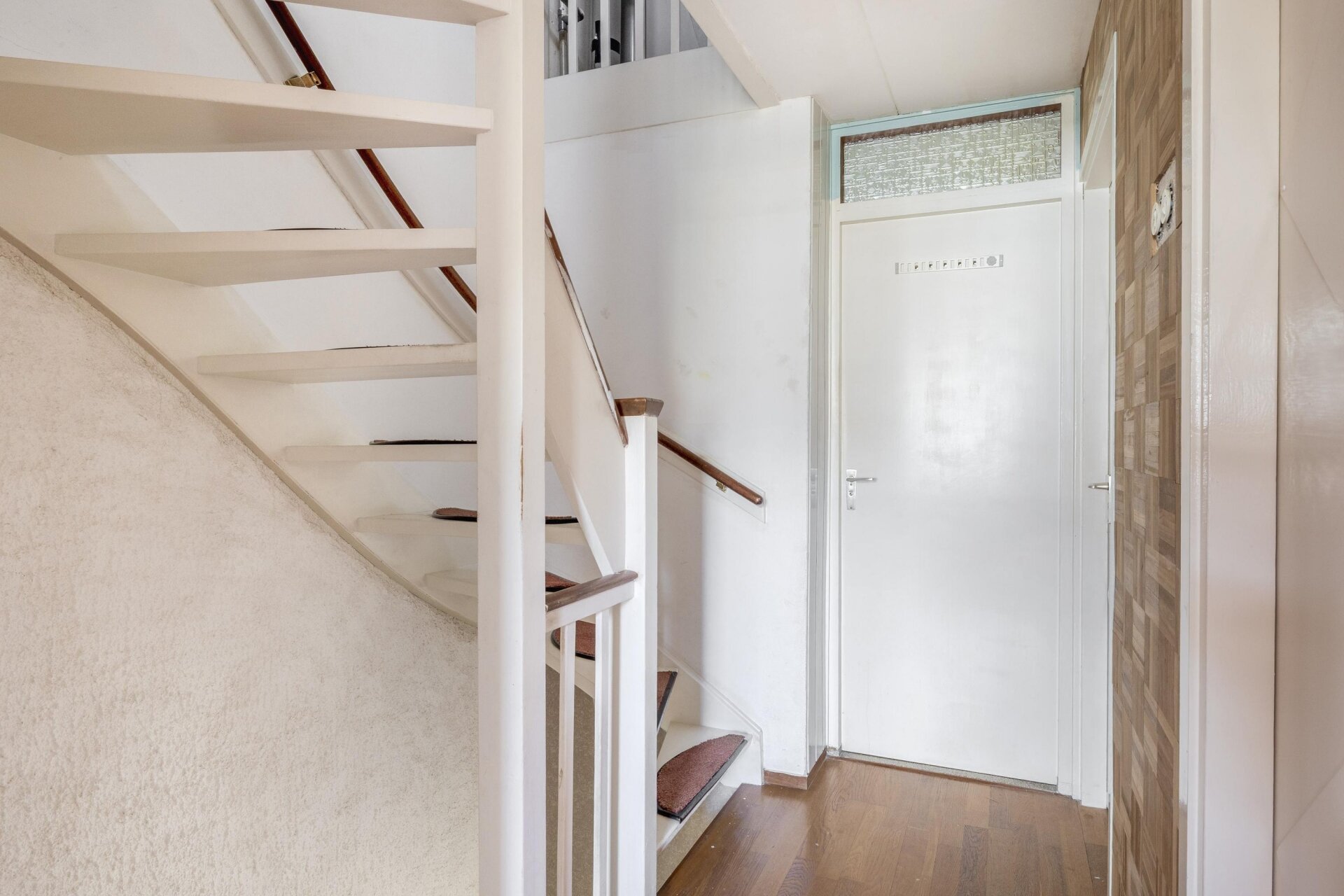 Je stapt het huis binnen via de onderhoudsvriendelijke voortuin, die direct een verzorgde indruk maakt. De hal biedt toegang tot een net toilet, een trapkast en de woonkamer. De doorzonwoonkamer is verrassend licht dankzij de grote raampartijen aan beide zijden. Hier is voldoende ruimte voor een comfortabele zithoek aan de voorzijde en een grote eettafel richting de tuin. De woonkamer is afgewerkt met een warme parketvloer en heeft een gezellige elektrische kachel.