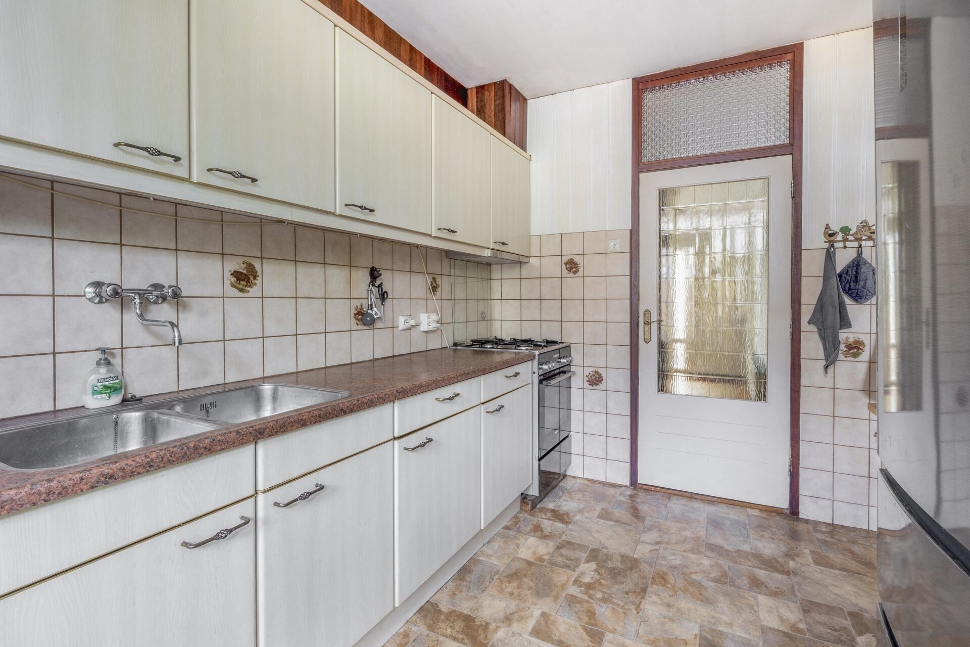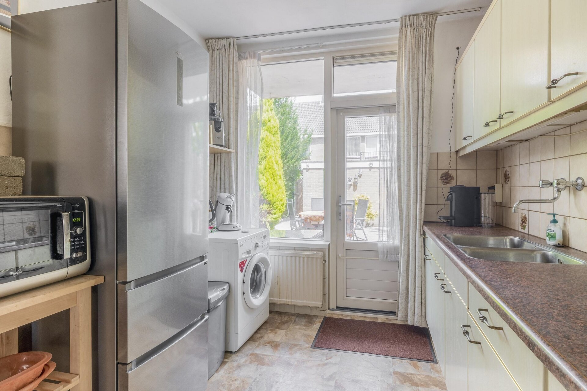 De keuken is geplaatst aan de achterzijde van de woning en kijkt uit op de tuin. Deze is netjes onderhouden en biedt alle ruimte voor de dagelijkse kookbehoeften. Vanuit de keuken heb je direct toegang tot het terras, handig als je buiten wilt eten of even snel iets uit de berging moet pakken.