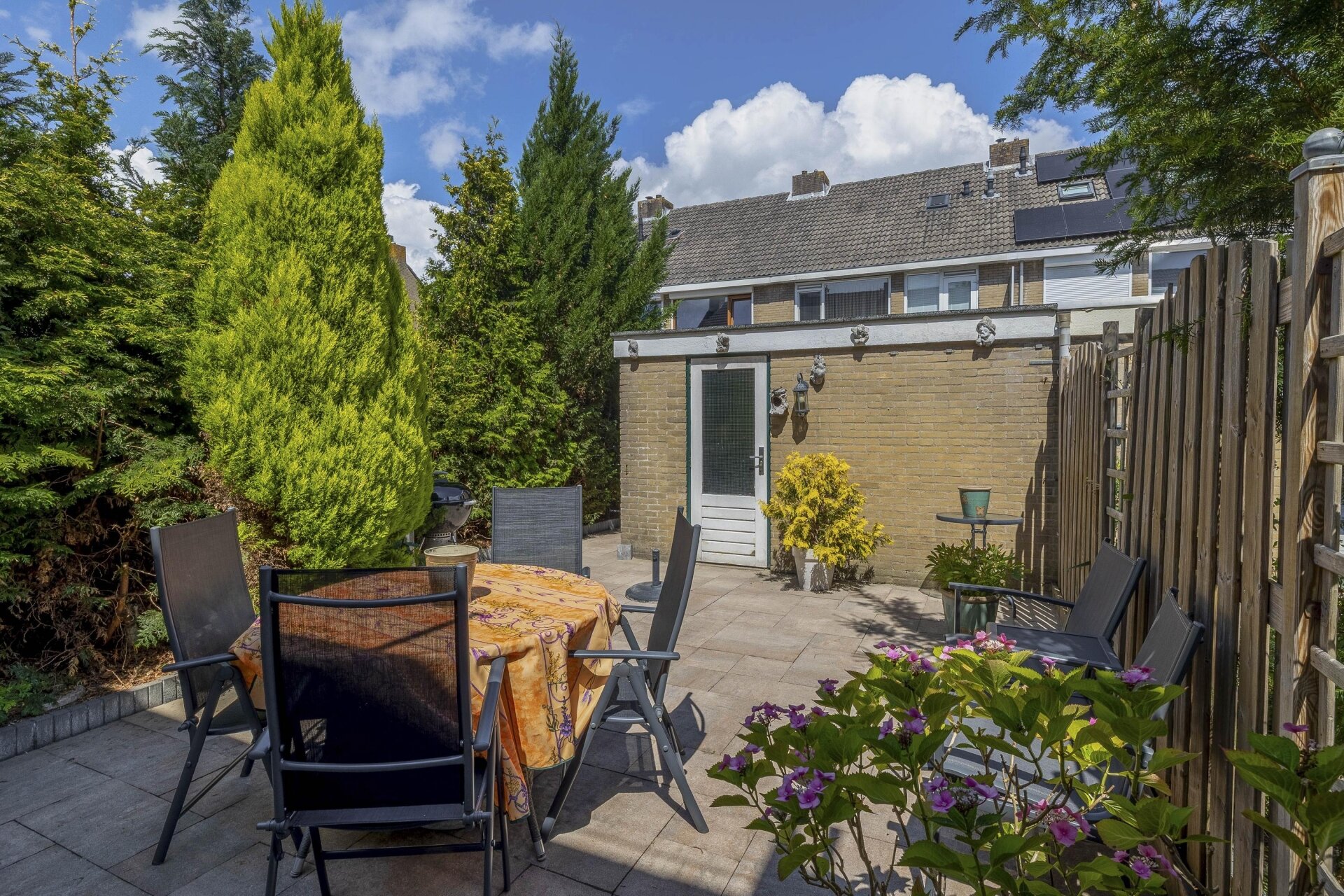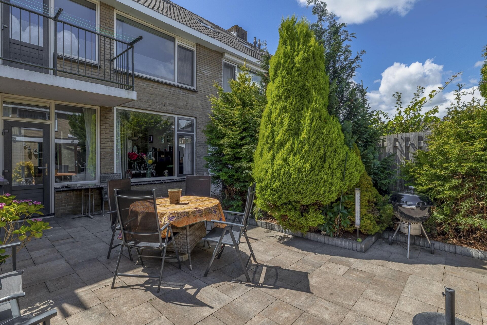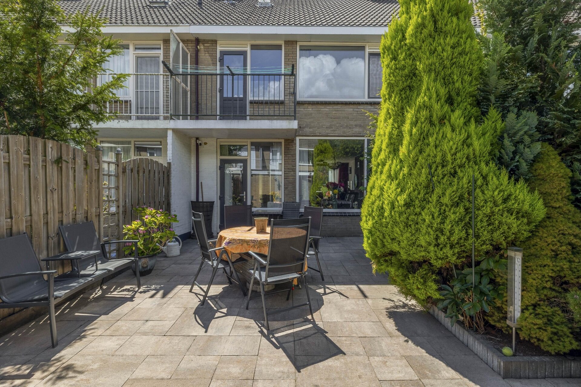 De achtertuin is strak aangelegd met sierbestrating, borders en volwassen groen. Dankzij de diepte van de tuin kun je hier op verschillende momenten van de dag van de zon genieten. De grote stenen berging van circa 10 m² achterin is ideaal voor fietsen, gereedschap of hobbyspullen. De tuin is via een achterom bereikbaar, wat praktisch is voor bijvoorbeeld containers of een motorfiets.