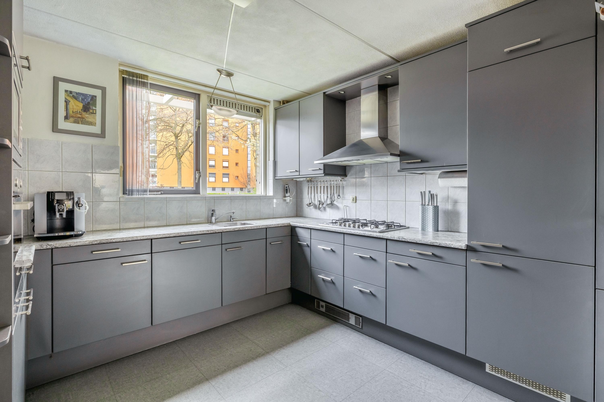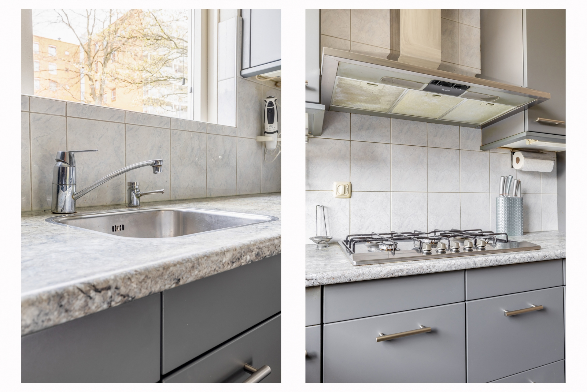 De keuken is uitgevoerd in een neutrale kleurstelling en heeft een praktische U-opstelling, waardoor je beschikt over veel werk- en bergruimte. Hier kun je gemakkelijk koken, terwijl je alles binnen handbereik hebt. De keuken is voorzien van diverse inbouwapparatuur en biedt voldoende plek voor het dagelijks gebruik, maar ook wanneer je uitgebreid wilt koken.