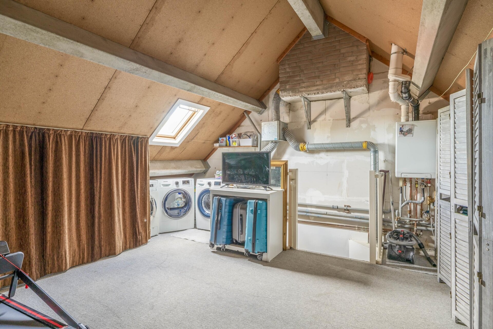 De zolderverdieping is nu in gebruik als bergzolder, maar met een vaste trap en dakraam is hier eenvoudig een derde slaapkamer te realiseren. Hier vind je ook de cv-opstelling uit 2022 en de wasmachineaansluiting.