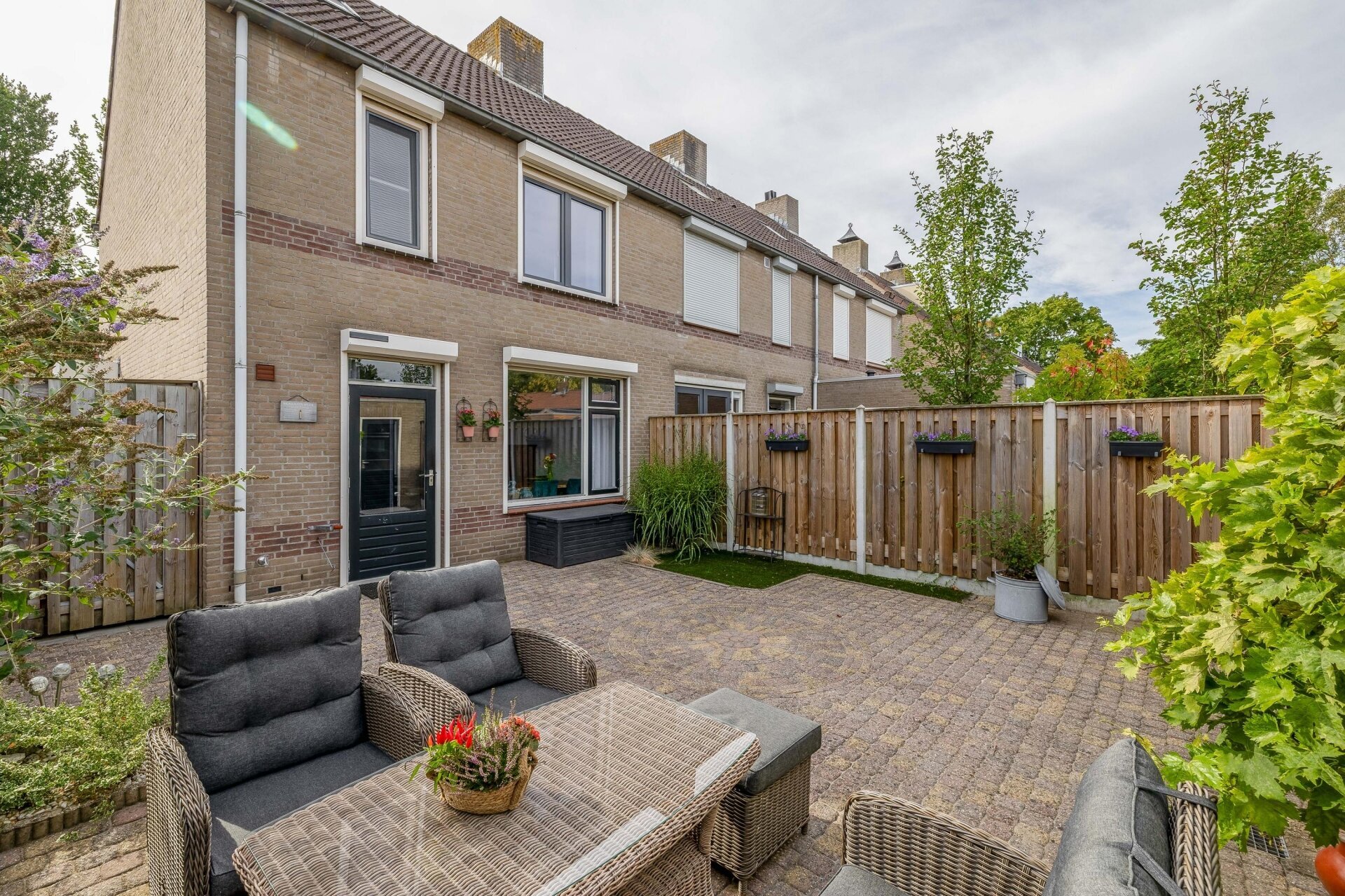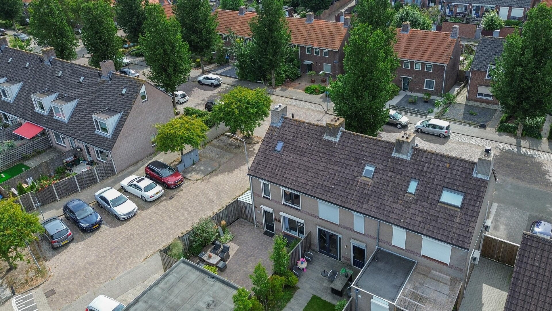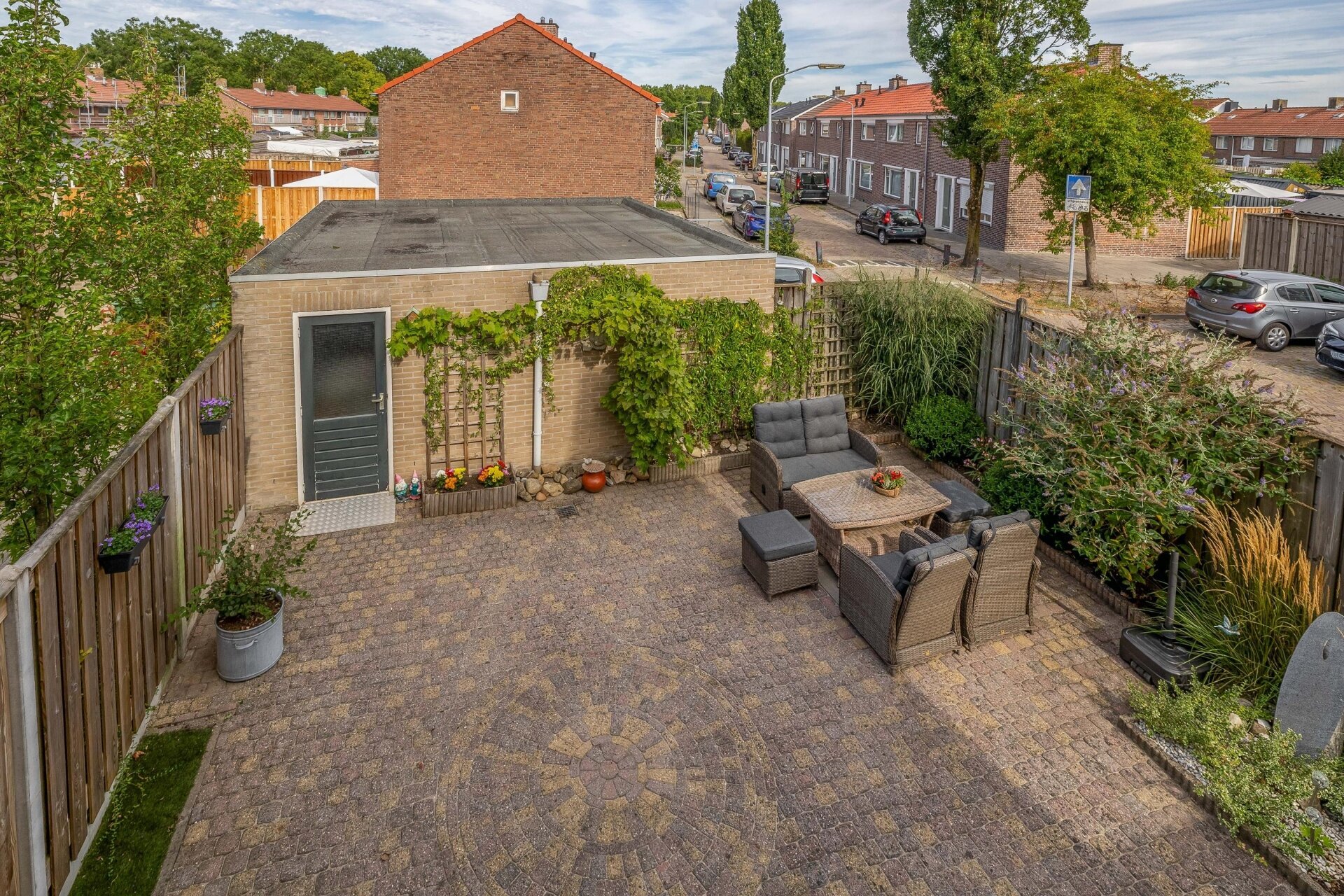 De achtertuin is strak aangelegd met sierbestrating, groenstroken en gezellige zitplekken. Door de ligging op het noorden kan je zelf kiezen of je in de zon of beschut wilt zitten wat ideaal is op warme dagen. Daarnaast beschikt het huis over een garage, bereikbaar via een loopdeur in de tuin, ideaal voor de fietsen, als hobbyruimte of extra opslag.