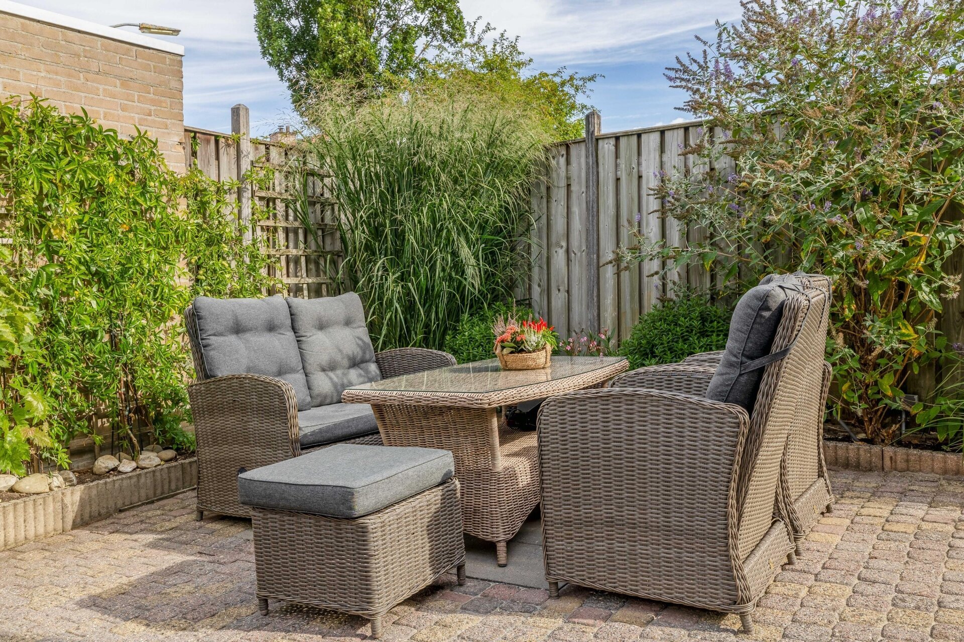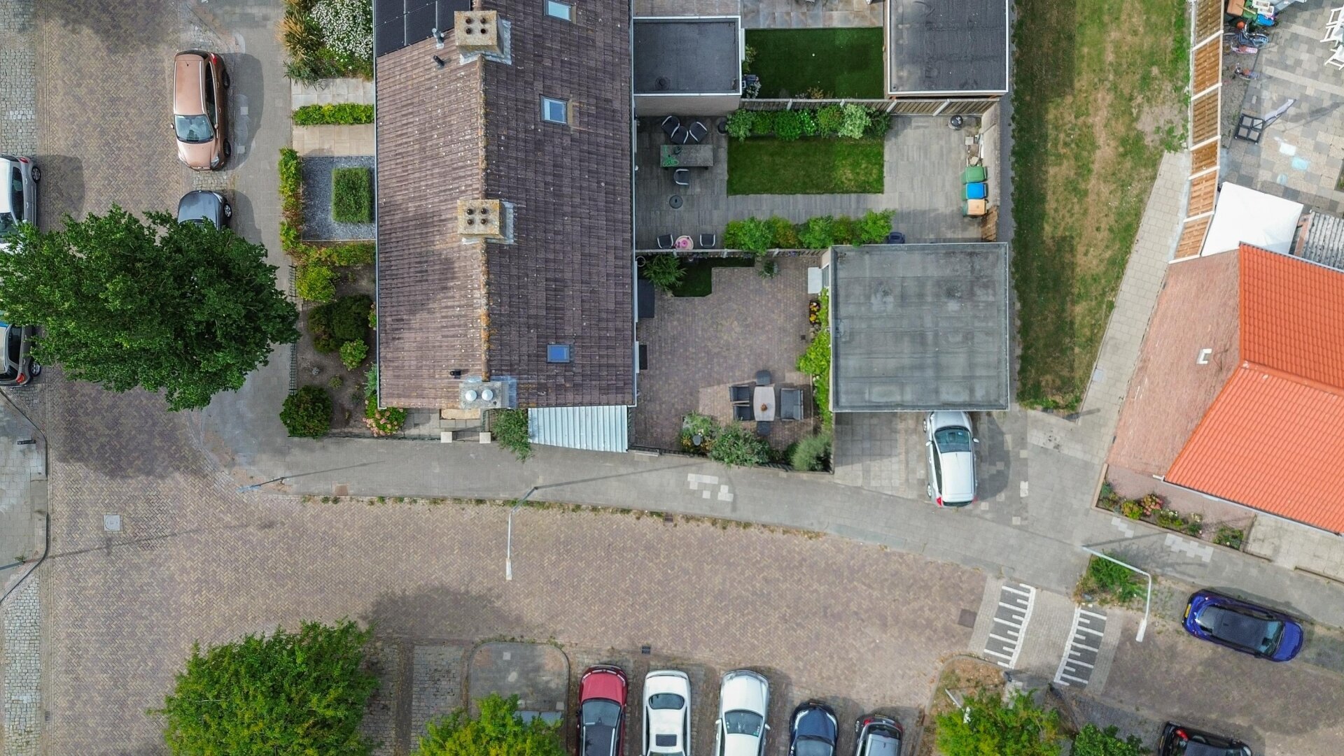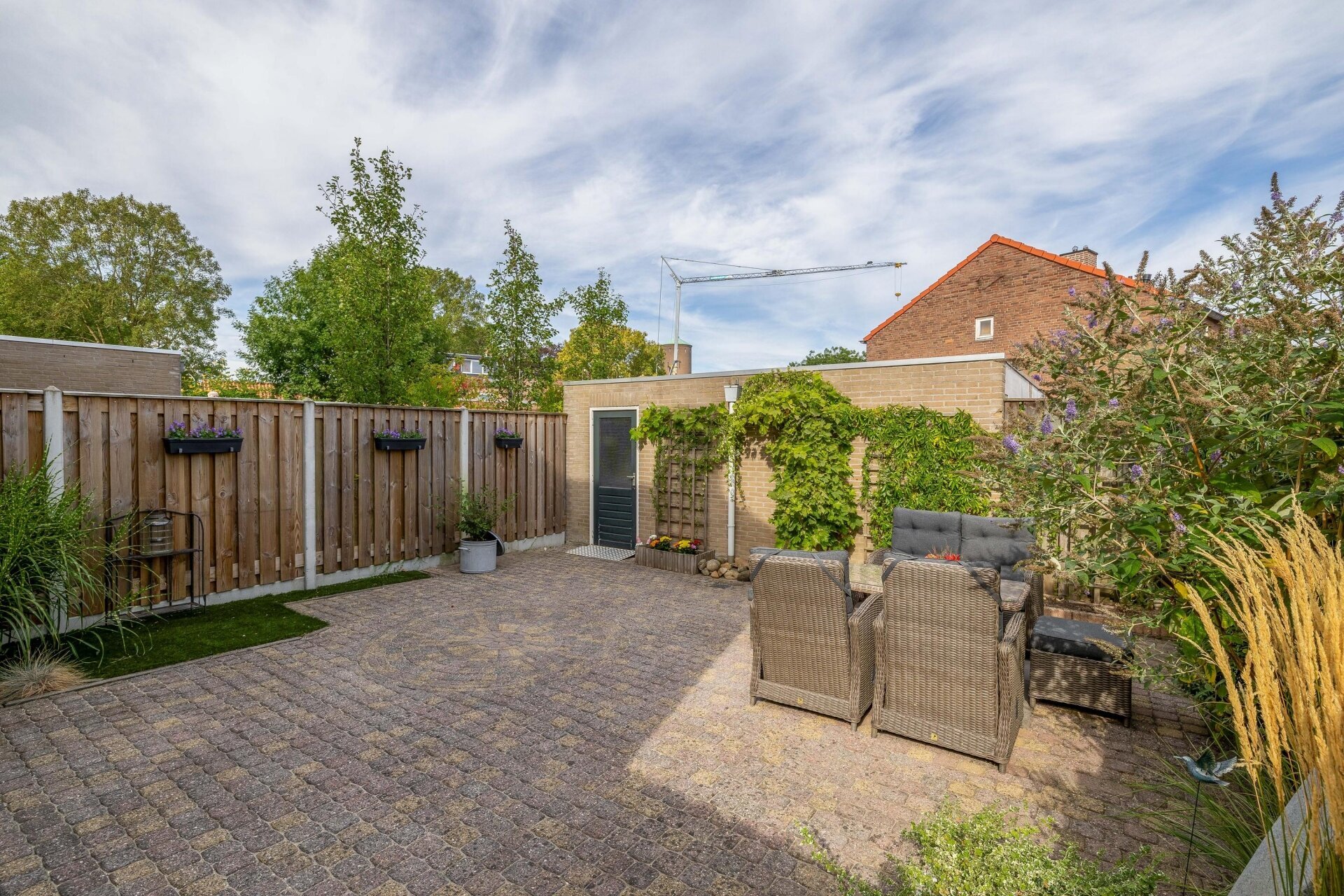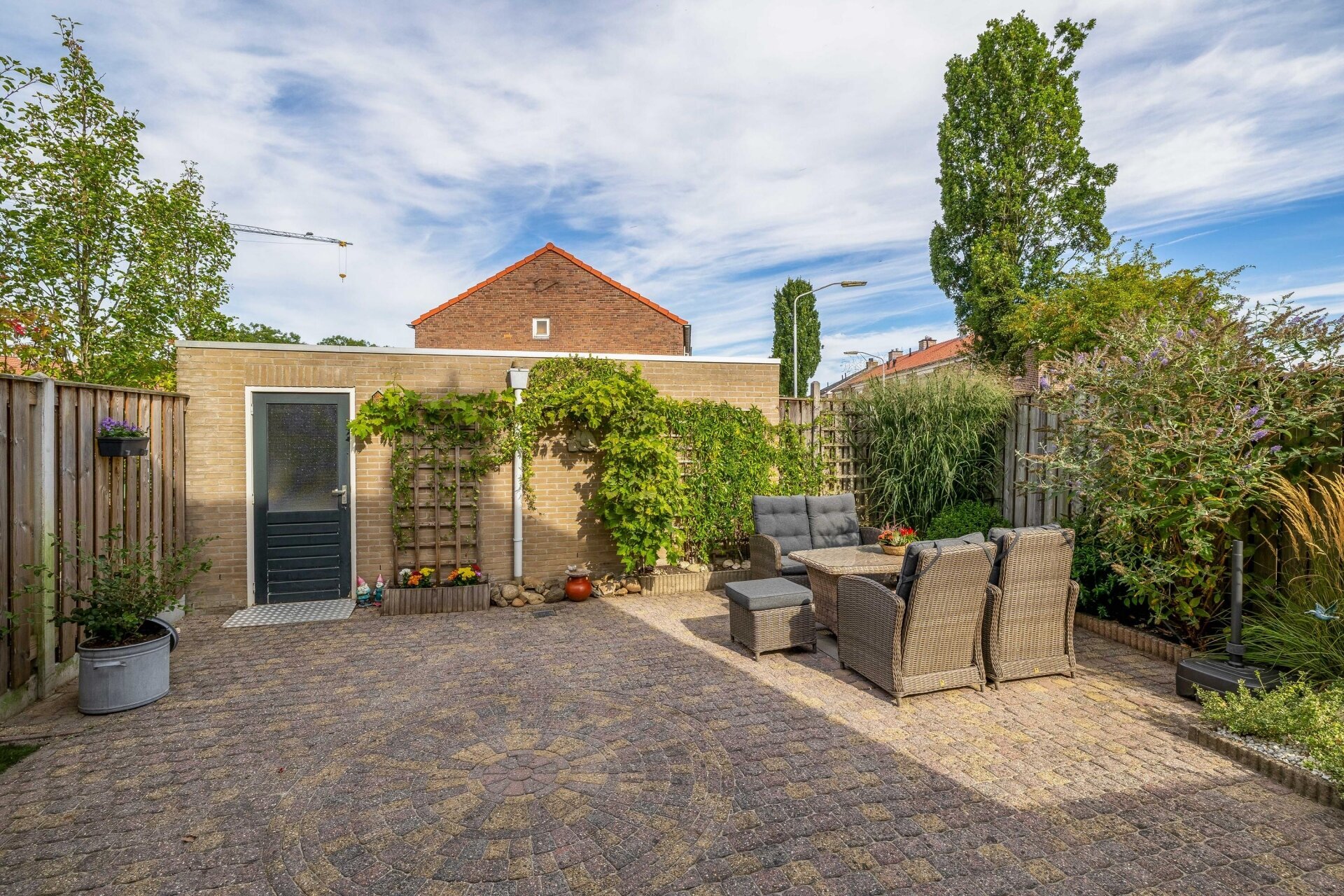 De achtertuin is strak aangelegd met sierbestrating, groenstroken en gezellige zitplekken. Door de ligging op het noorden kan je zelf kiezen of je in de zon of beschut wilt zitten wat ideaal is op warme dagen. Daarnaast beschikt het huis over een garage, bereikbaar via een loopdeur in de tuin, ideaal voor de fietsen, als hobbyruimte of extra opslag.