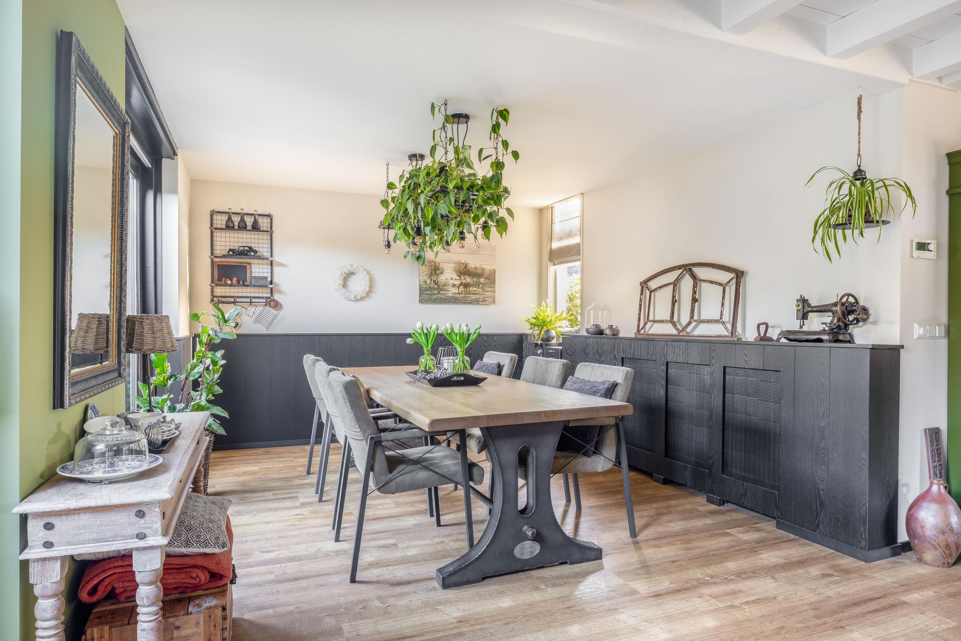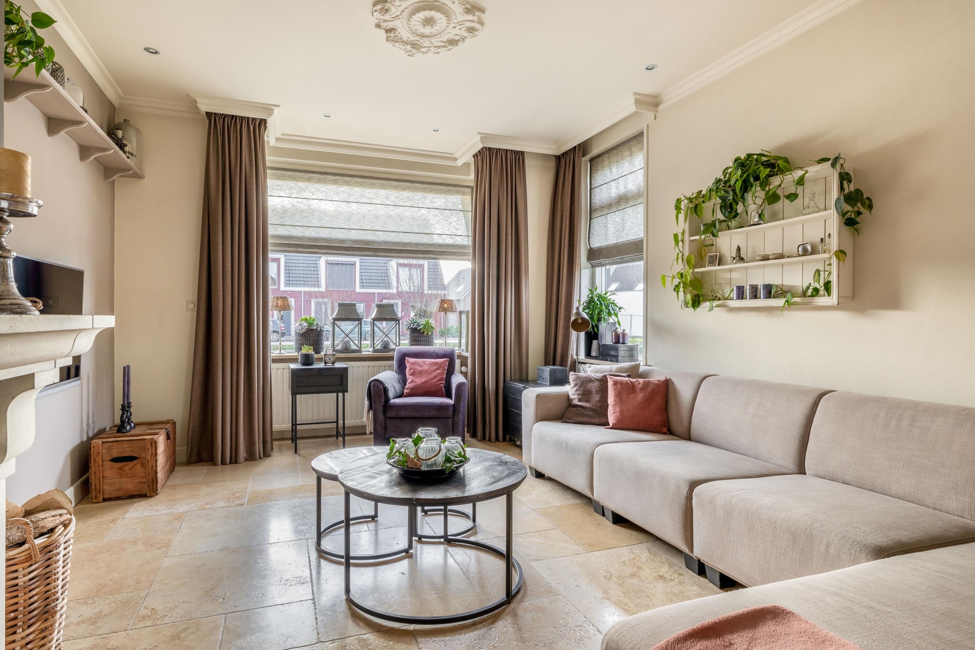 De woonkamer aan de voorzijde is sfeervol en comfortabel ingericht en beschikt over een gashaard, een lichte vloer met vloerverwarming, hoge plinten en een neutrale wandafwerking. Er is ruimte voor een grote zithoek én een eethoek, waardoor je volop kunt genieten van gezellige momenten met familie of vrienden.