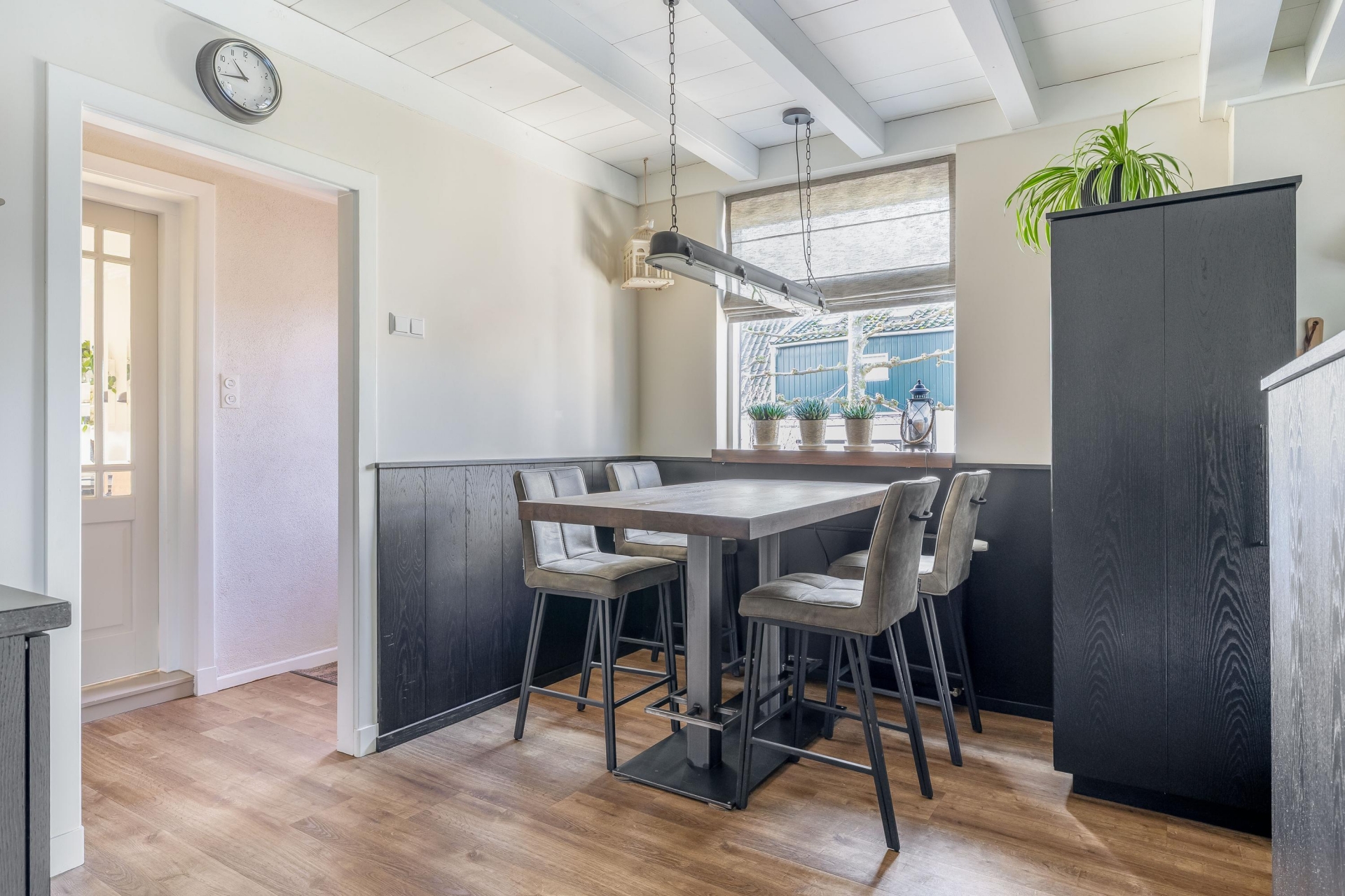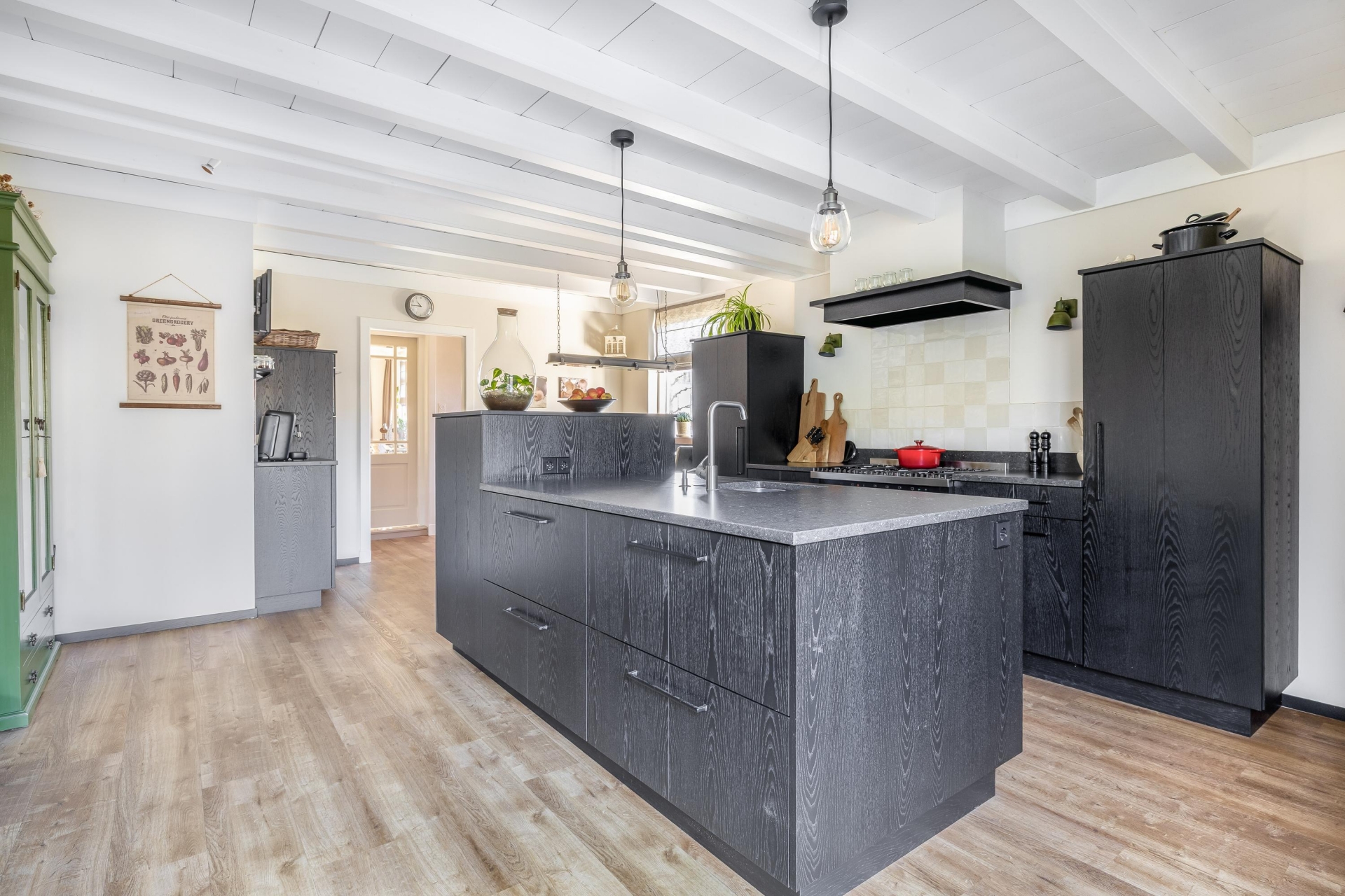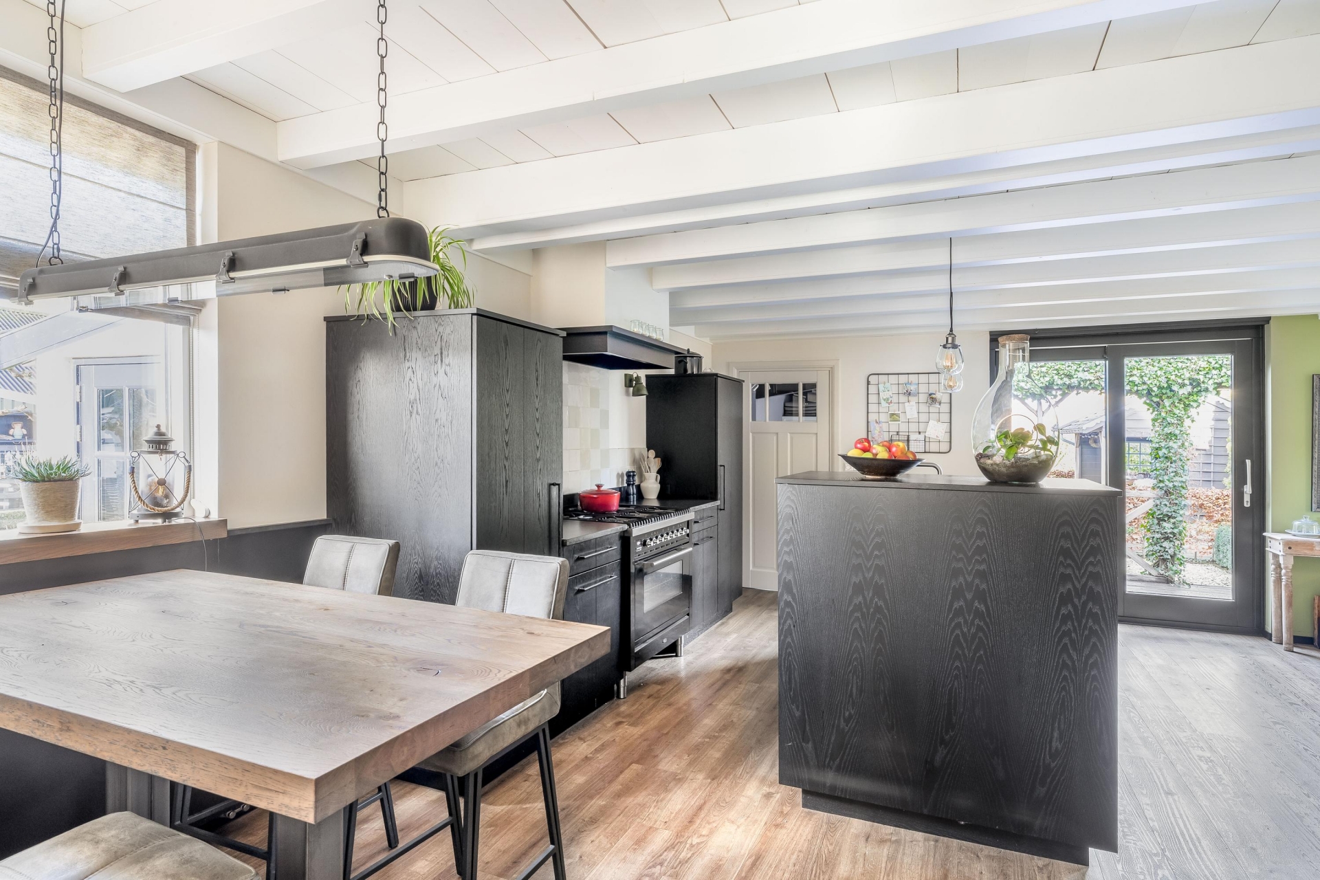 In het verlengde van de hal vind je de echte eyecatcher van dit huis: een ruime en stijlvolle woonkeuken, uitgevoerd in zwart hout. Het balkenplafond en de houten vloer geven de ruimte een landelijke, warme sfeer. Uiteraard is de keuken voorzien van moderne inbouwapparatuur.
