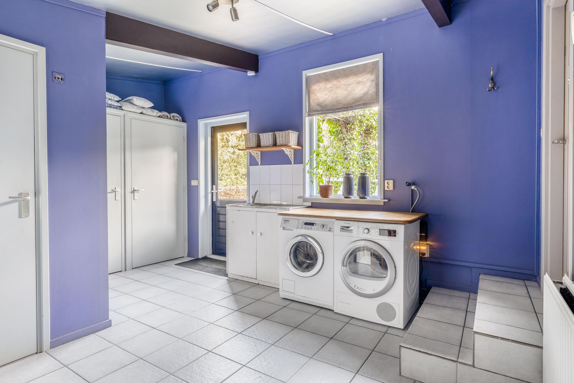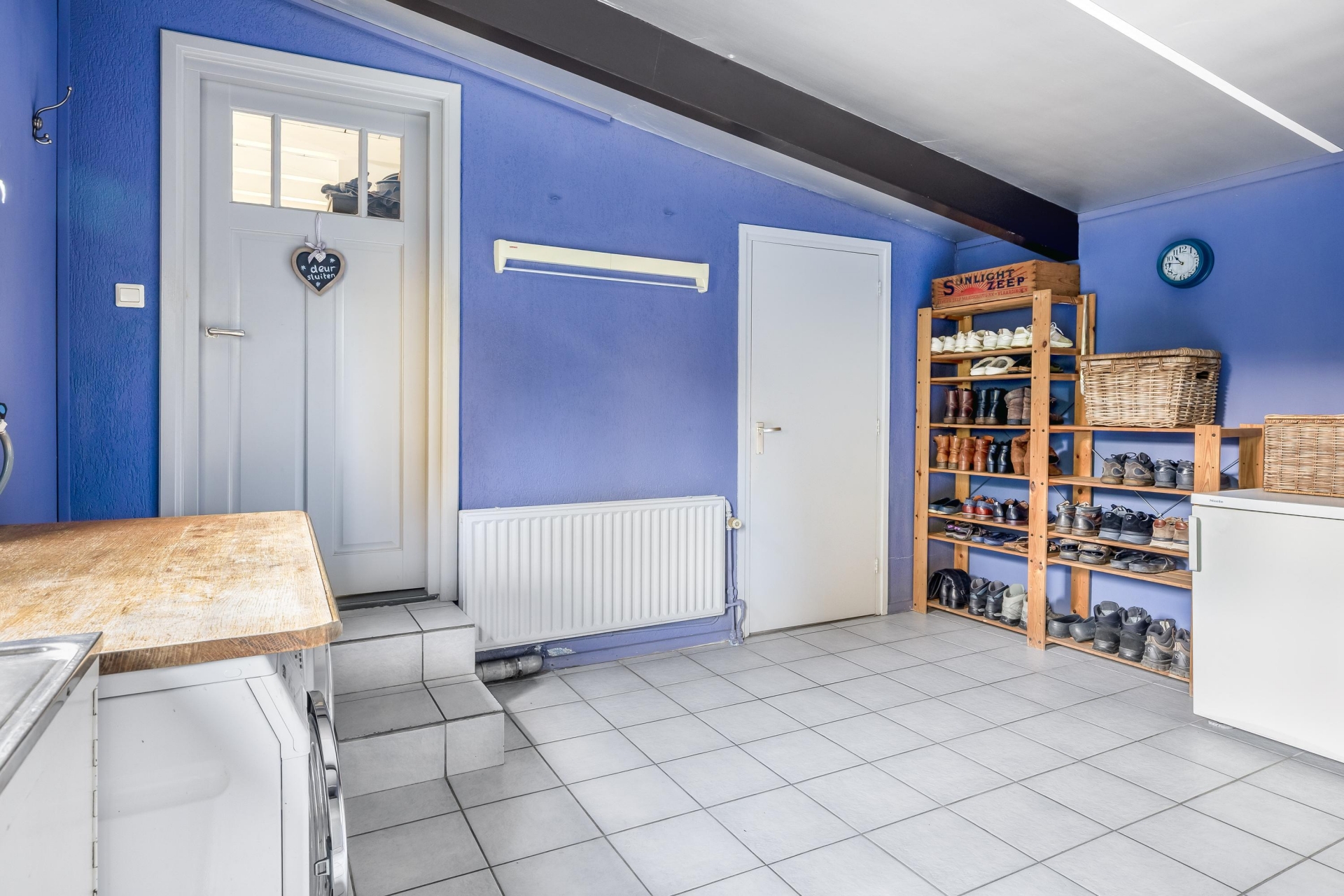 Aansluitend bevindt zich de bijkeuken, waar je extra opbergruimte, witgoedaansluitingen en toegang tot één van de bergingen hebt. De praktische indeling en hoeveelheid ruimte maken het geheel uitermate geschikt voor een gezin of iemand die graag wat meer leefruimte wenst.