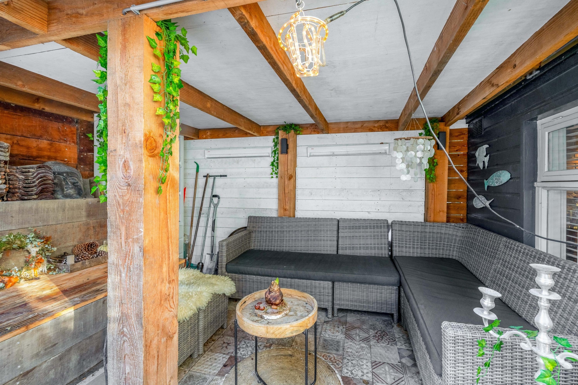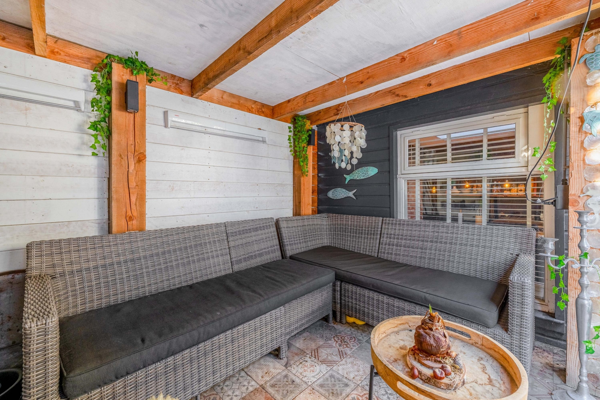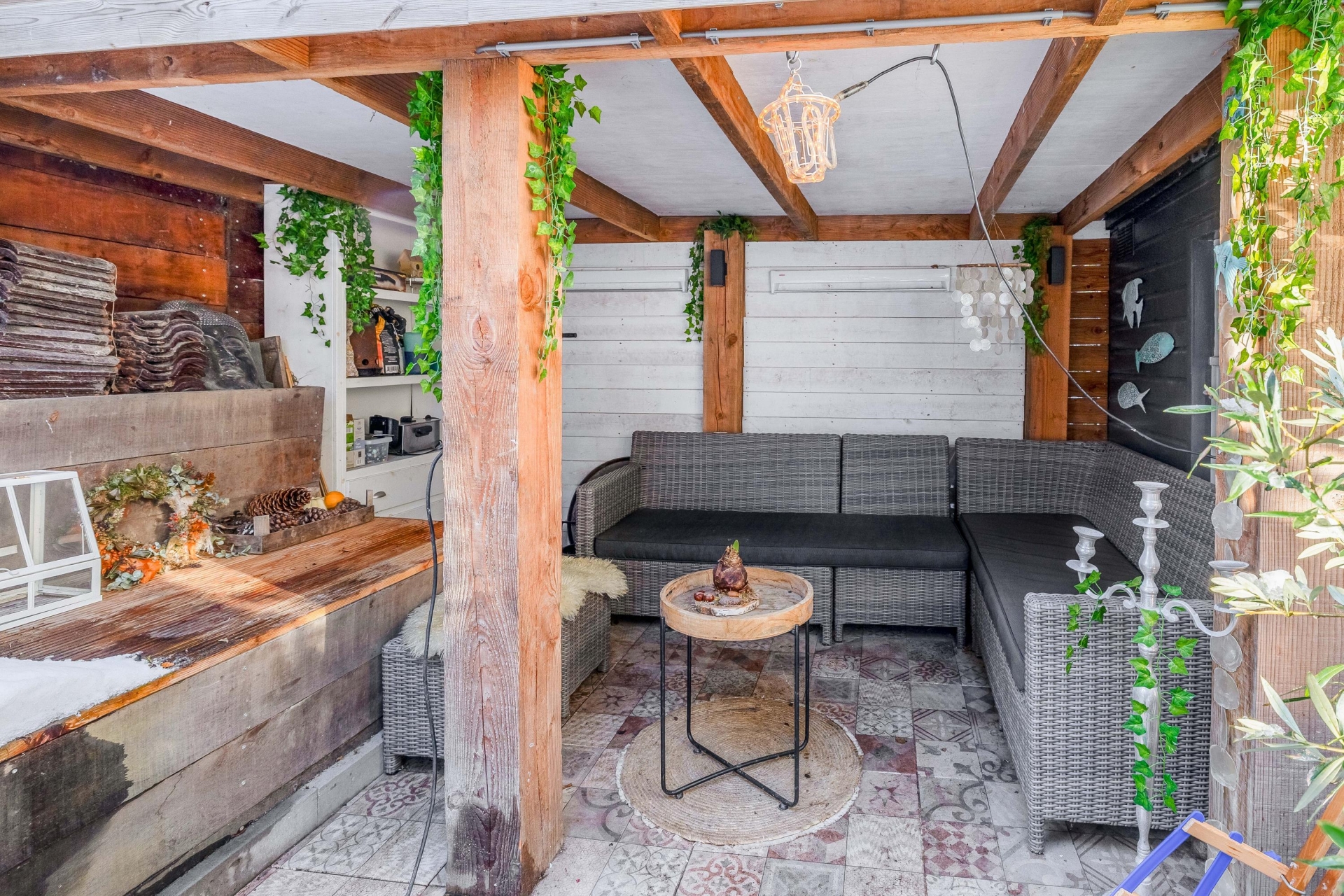 Aan de voorzijde van het huis vind je een verrassend gezellige buitenruimte. De voortuin is fraai aangelegd en beschikt over een sfeervolle houten overkapping waar je het hele jaar door kunt genieten van een kop koffie of een goed boek. Via een trapje kom je op het dakterras, dat direct aansluit op de dijk. Hier is een tweede zitje gemaakt. Daarnaast is er een houten berging voor afvalcontainers en plaats voor fietsen of scooters.