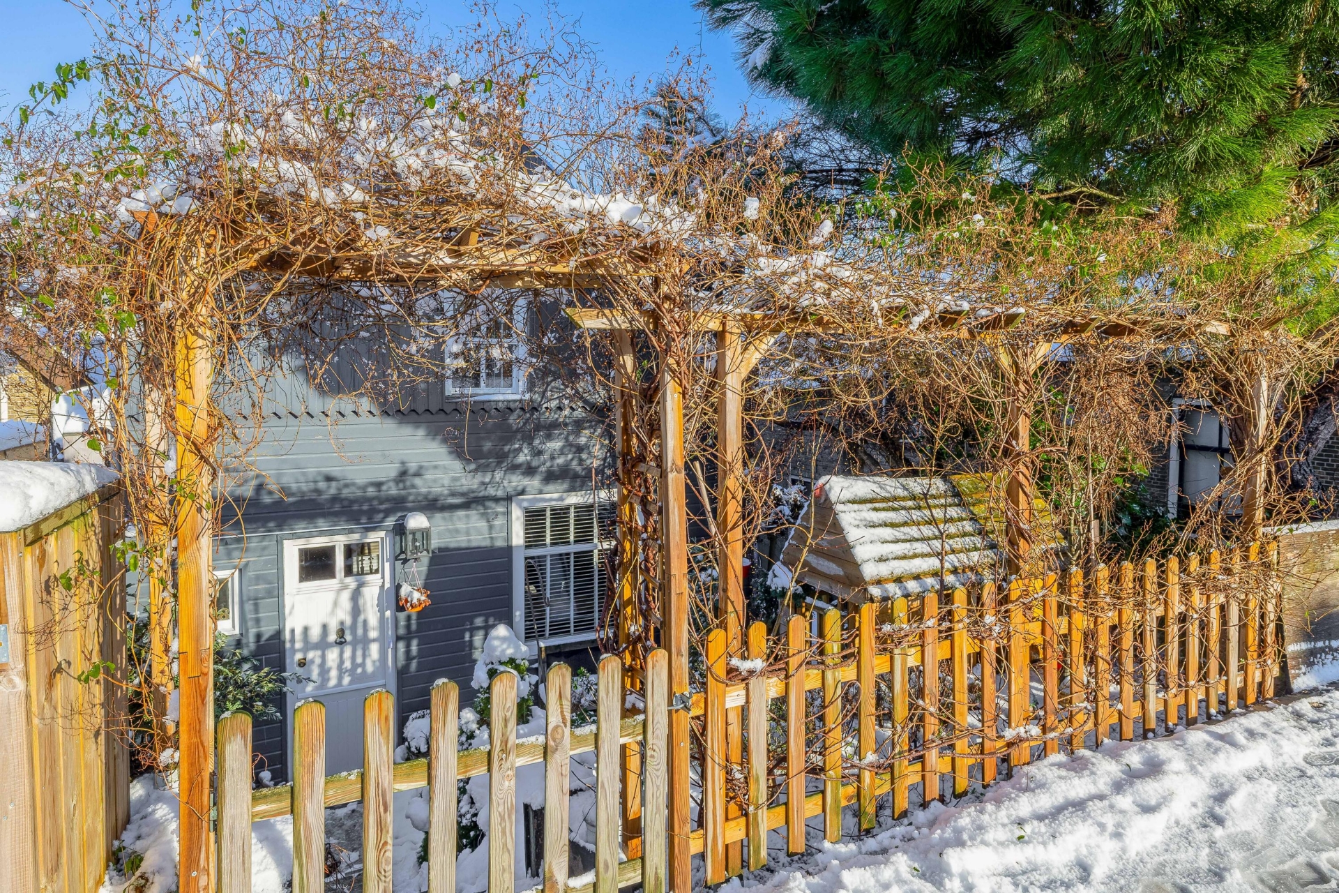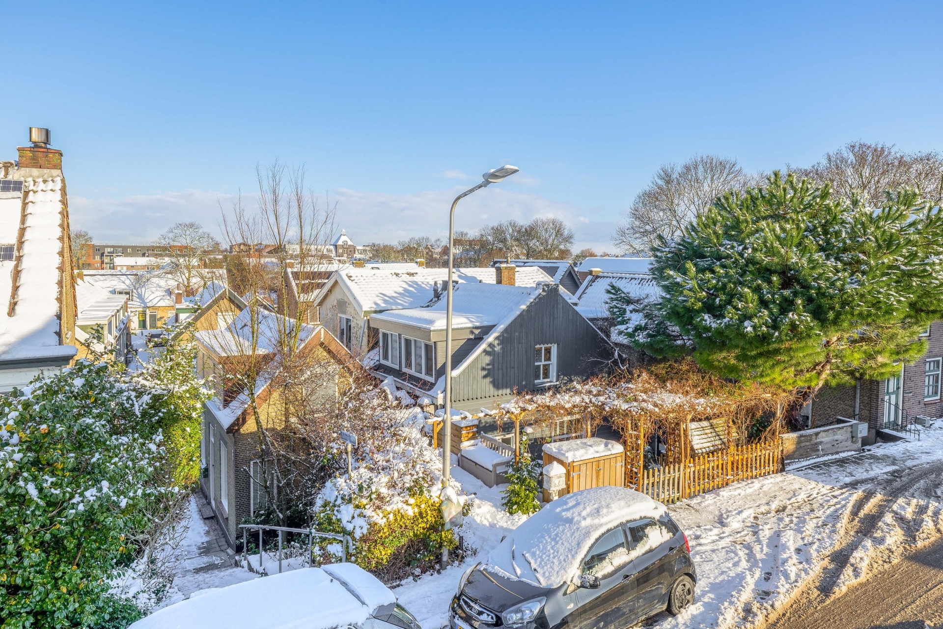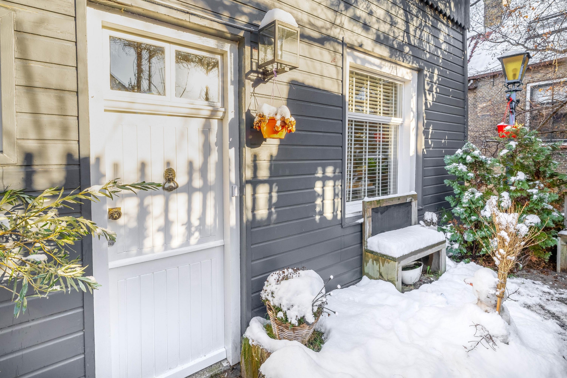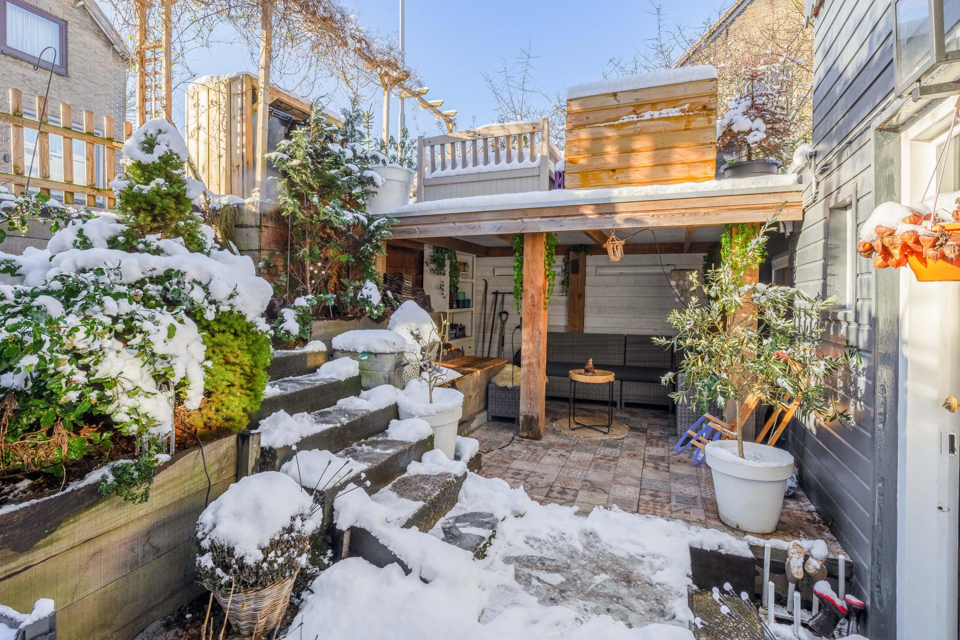 Aan de voorzijde van het huis vind je een verrassend gezellige buitenruimte. De voortuin is fraai aangelegd en beschikt over een sfeervolle houten overkapping waar je het hele jaar door kunt genieten van een kop koffie of een goed boek. Via een trapje kom je op het dakterras, dat direct aansluit op de dijk. Hier is een tweede zitje gemaakt. Daarnaast is er een houten berging voor afvalcontainers en plaats voor fietsen of scooters.