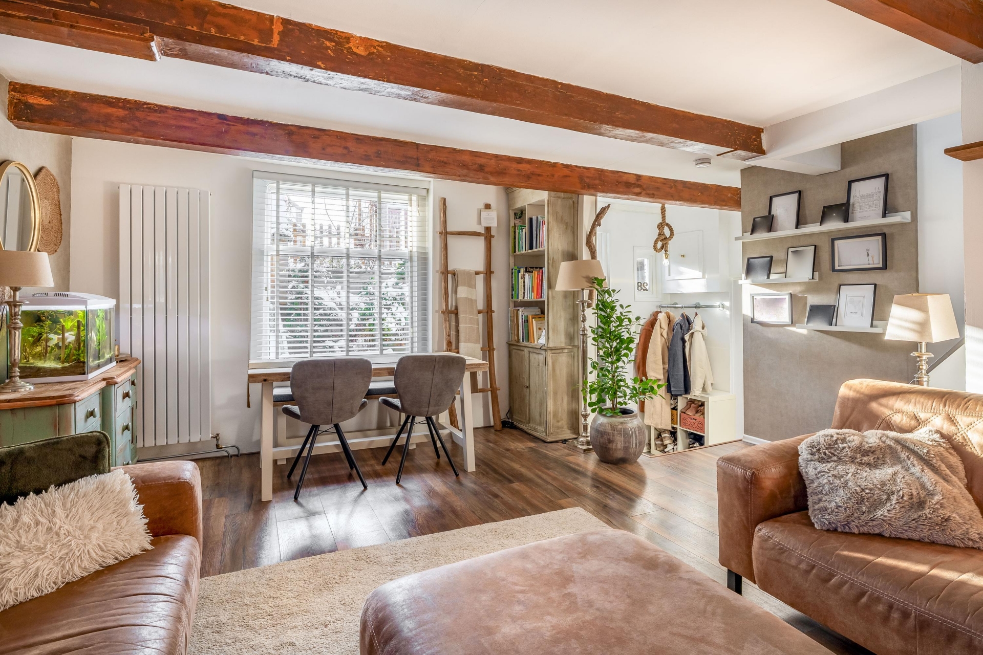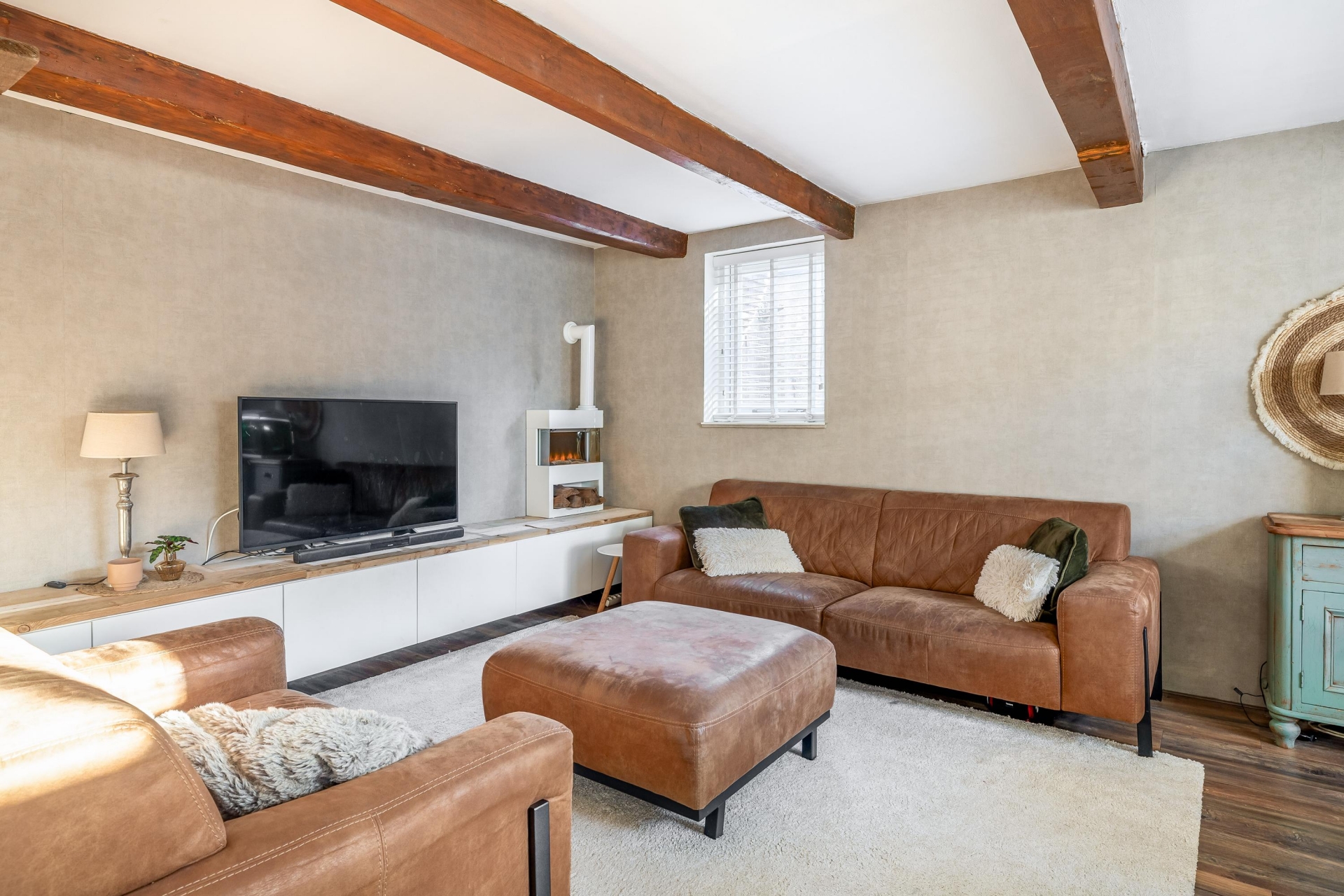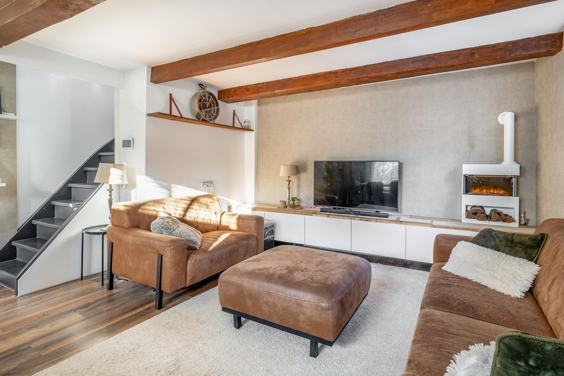 Je komt binnen en stapt meteen een warme sfeer binnen. De woonkamer is afgewerkt met een nette laminaatvloer en balkenplafond en een fijne lichtinval aan de voorzijde. Door de indeling is er ruimte voor een gezellige zithoek én een werk- of eethoek aan het raam. De trapopgang is sfeervol verwerkt in de ruimte.