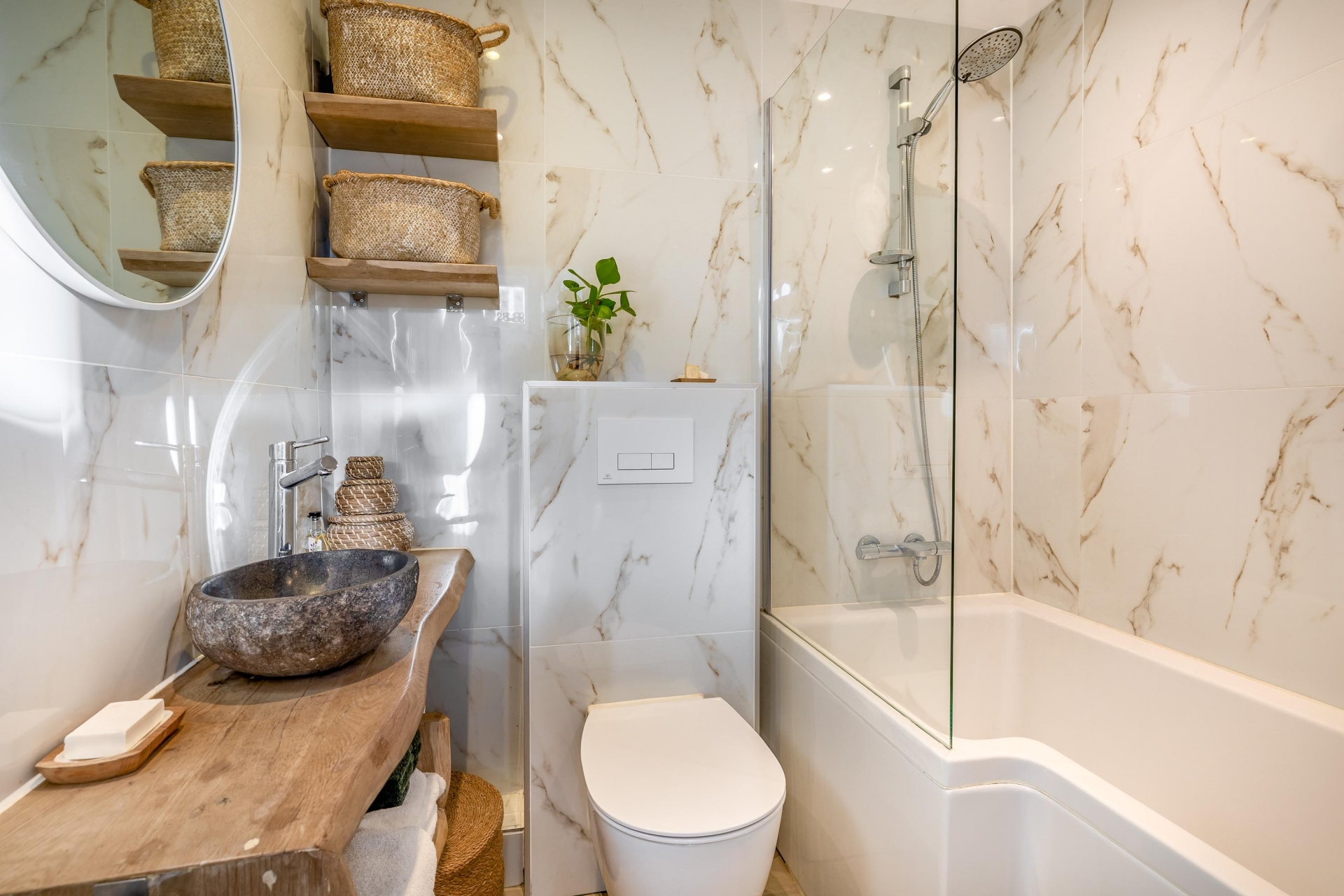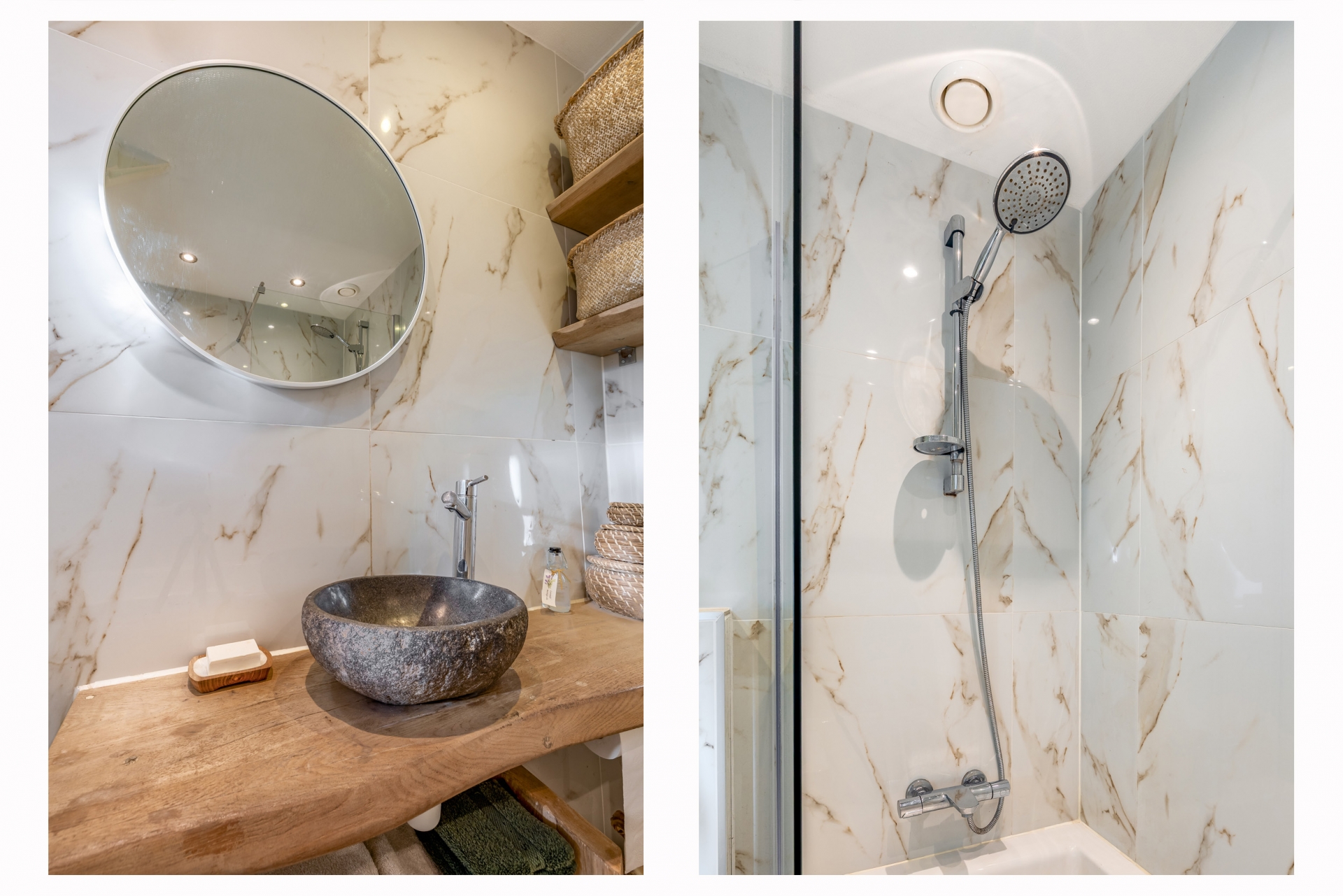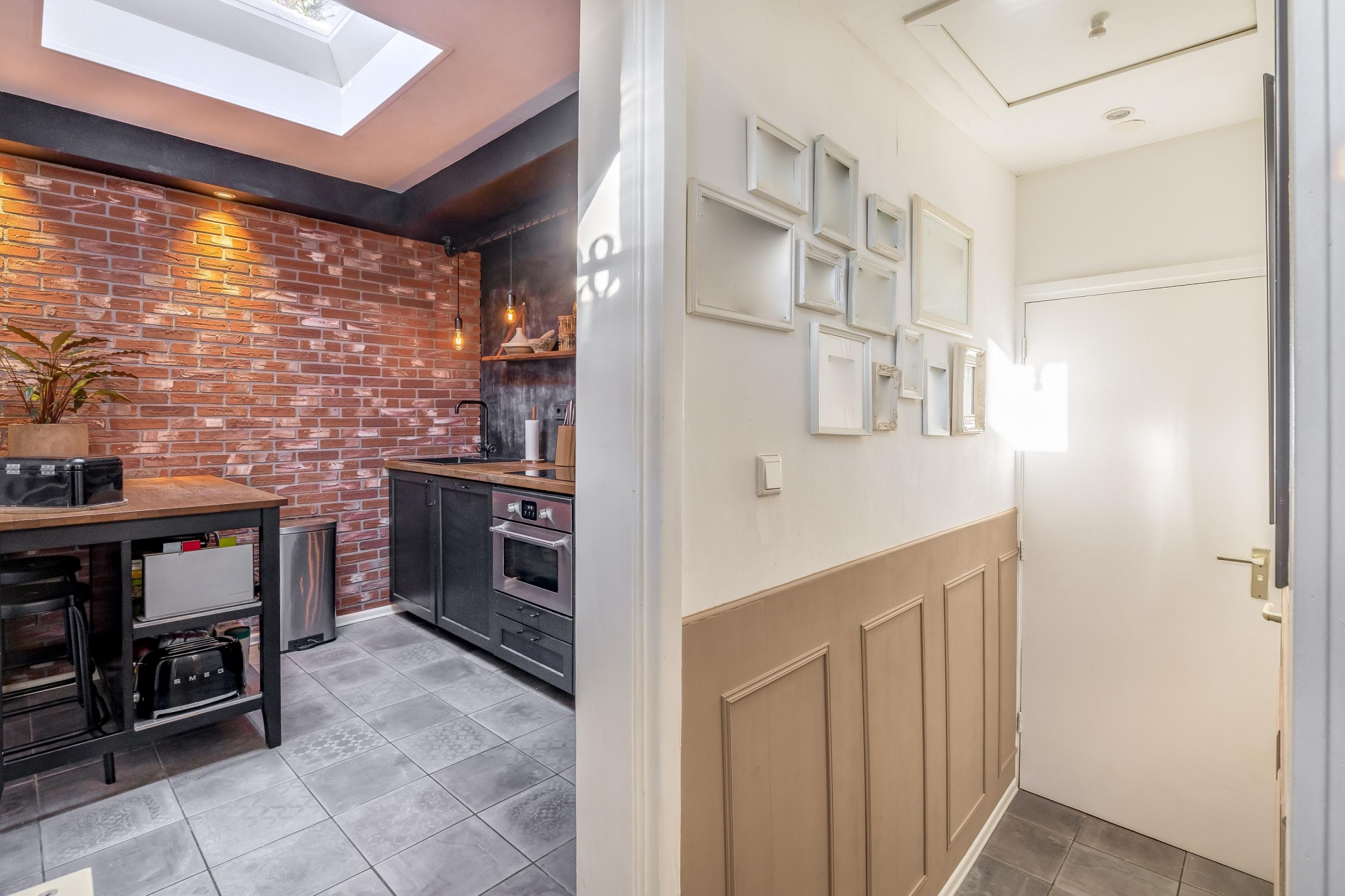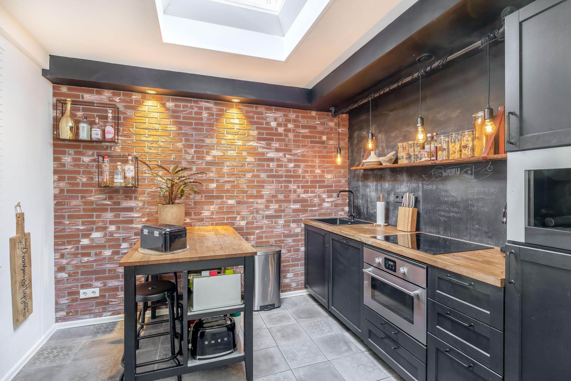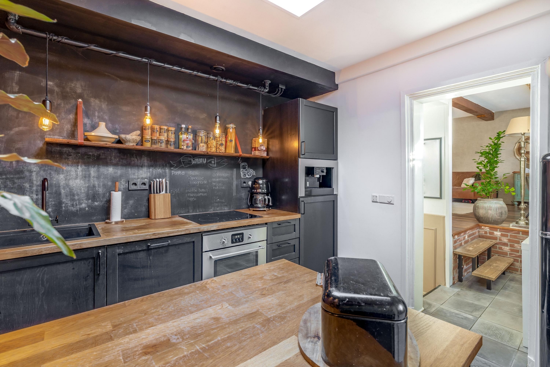 De keuken is in 2017 vernieuwd en past helemaal in de sfeer van het huis: robuust, industrieel en praktisch. Denk aan een donker keukenblok met houtaccenten, strakke inbouwapparatuur en een lichtkoepel die zorgt voor extra daglicht. Alles is aanwezig: een inductiekookplaat, vaatwasser, combi-oven en zelfs een koffiemachine. Aan de achterzijde vind je de badkamer, compleet vernieuwd in 2023. Deze straalt luxe uit met marmerlook tegels, een vrijstaand wastafelmeubel met natuurstenen waskom, een zwevend toilet en een comfortabel ligbad met douchewand.