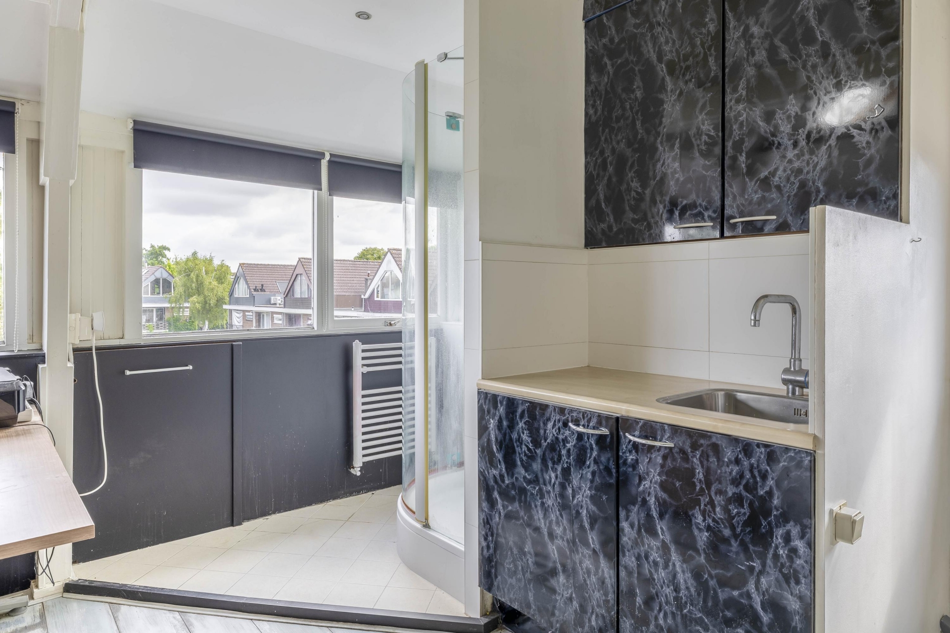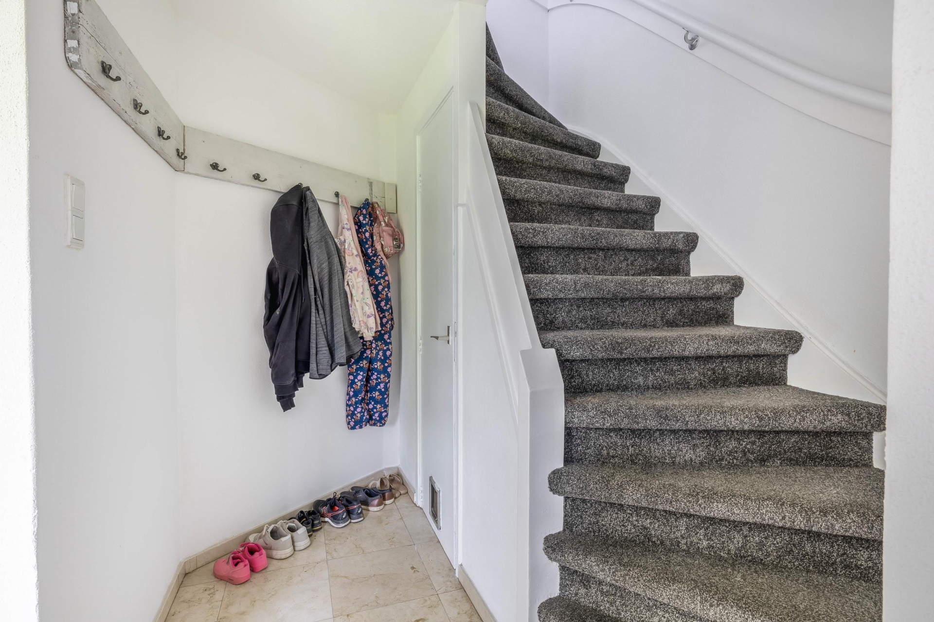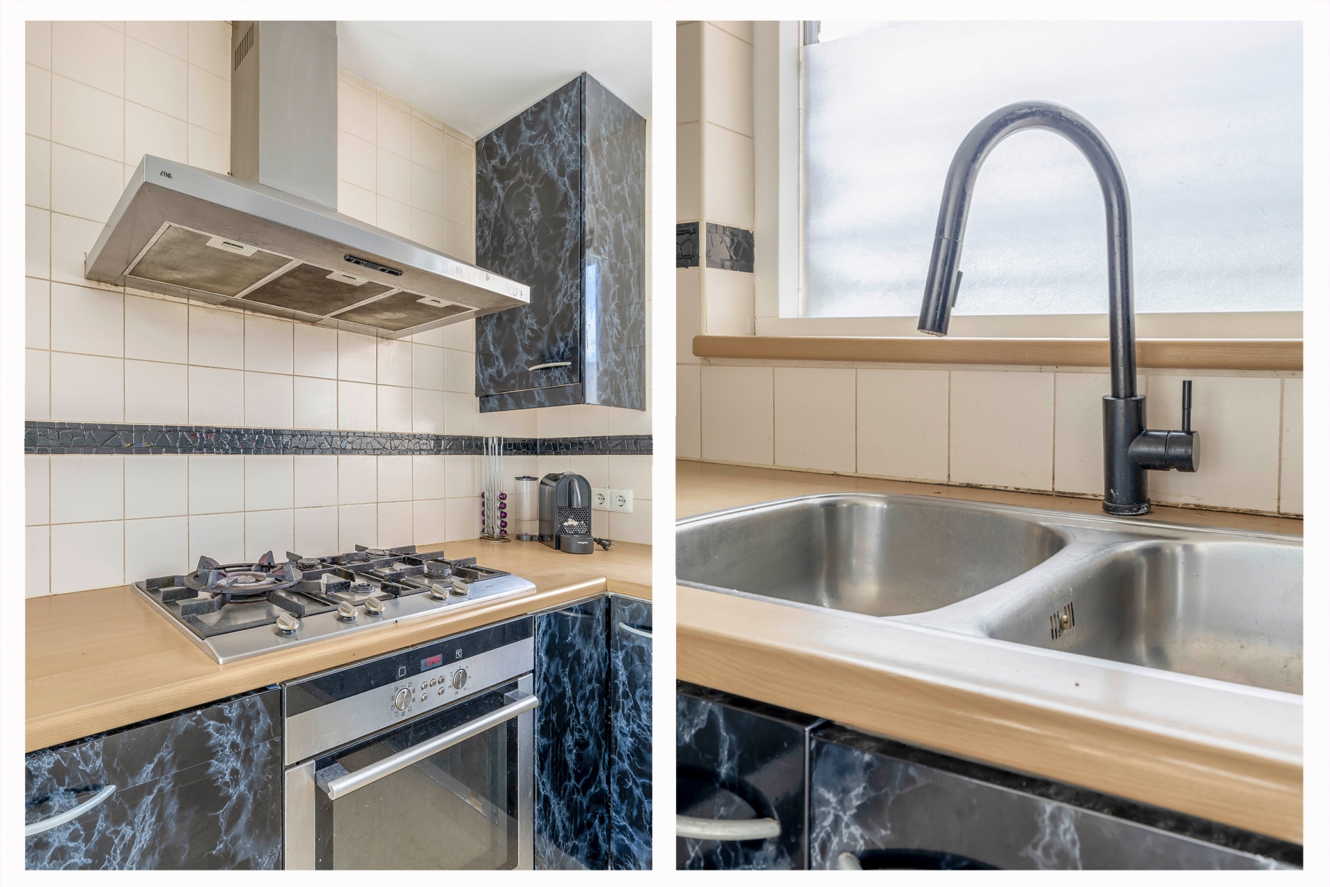 De keuken is praktisch geplaatst en biedt voldoende opbergruimte en werkblad. Ook op de begane grond bevindt zich een hal met trapopgang en een toiletruimte.