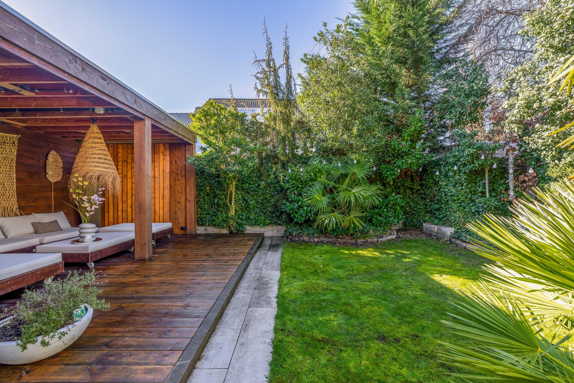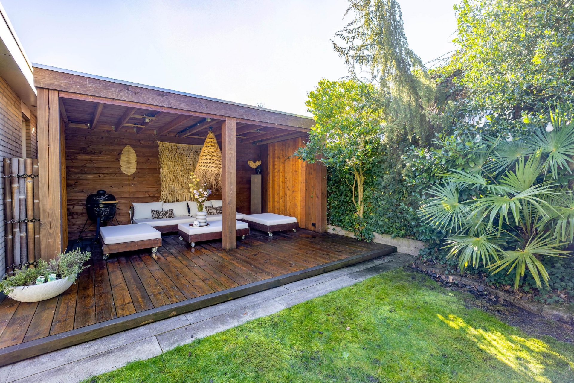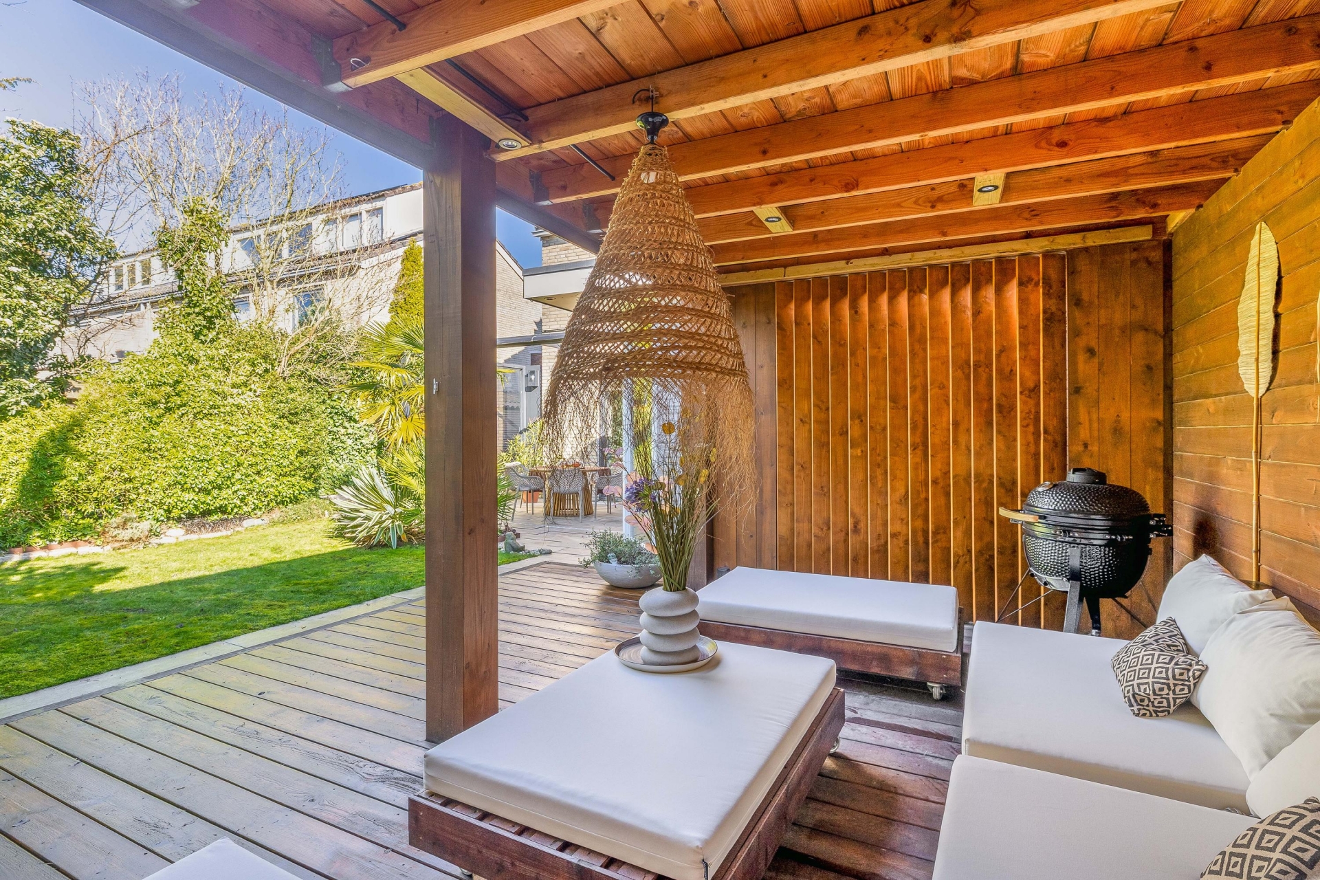 De achtertuin ligt op het zuidwesten, waardoor je hier volop van de zon kunt genieten. De sfeer doet denken aan Ibiza: veel groen, verschillende terrassen en een prachtige houten overkapping waar je heerlijk kunt loungen.