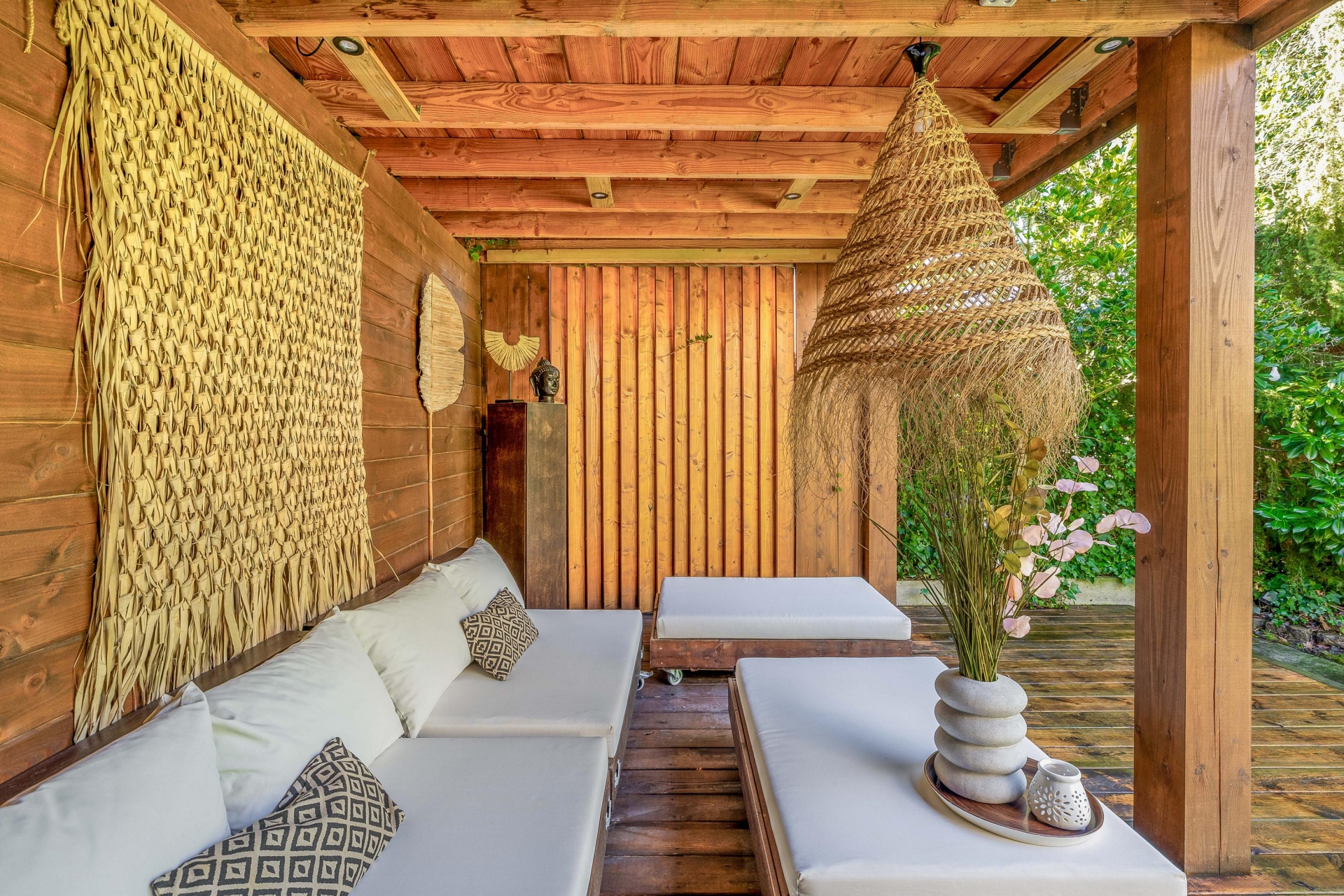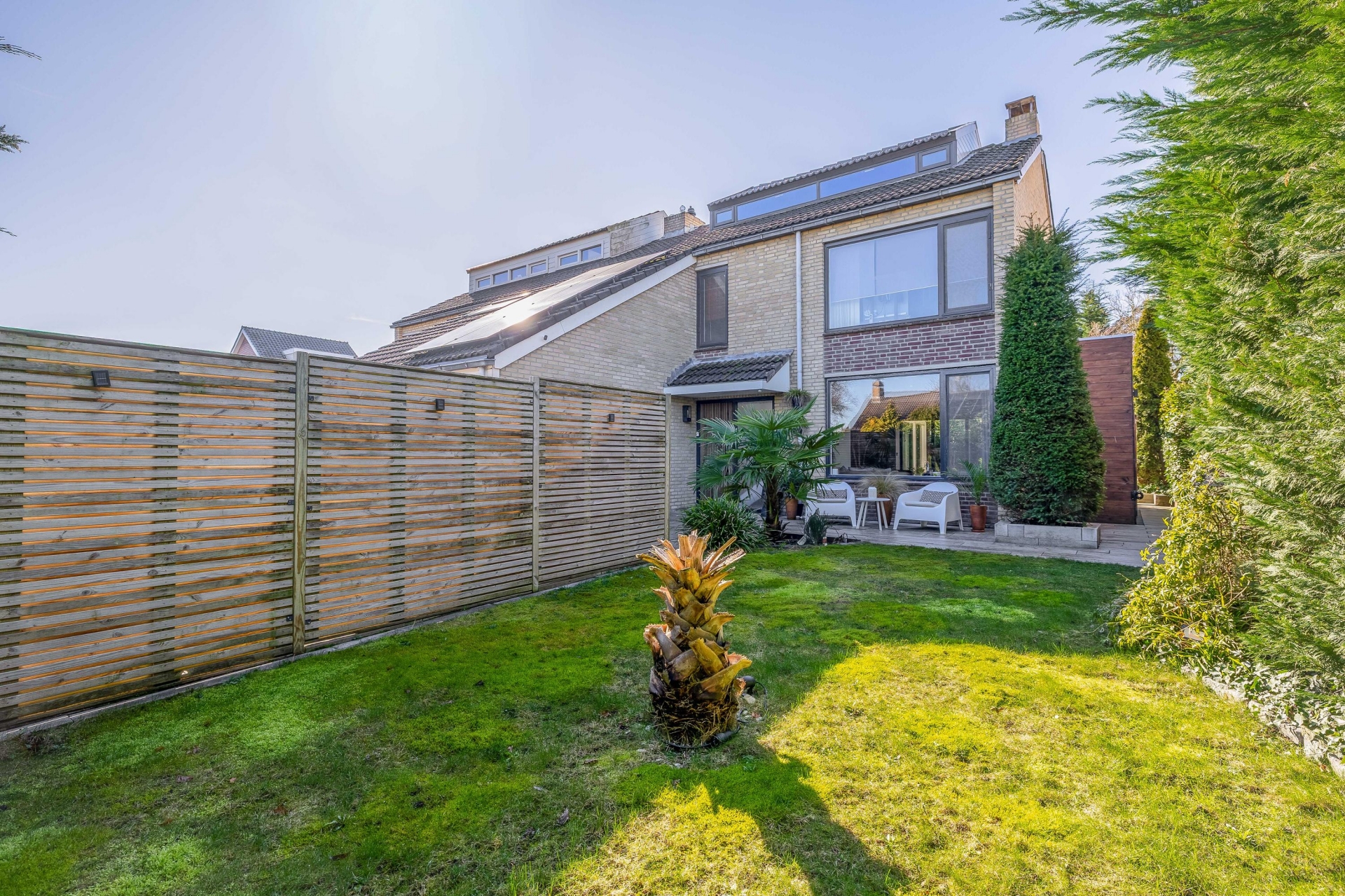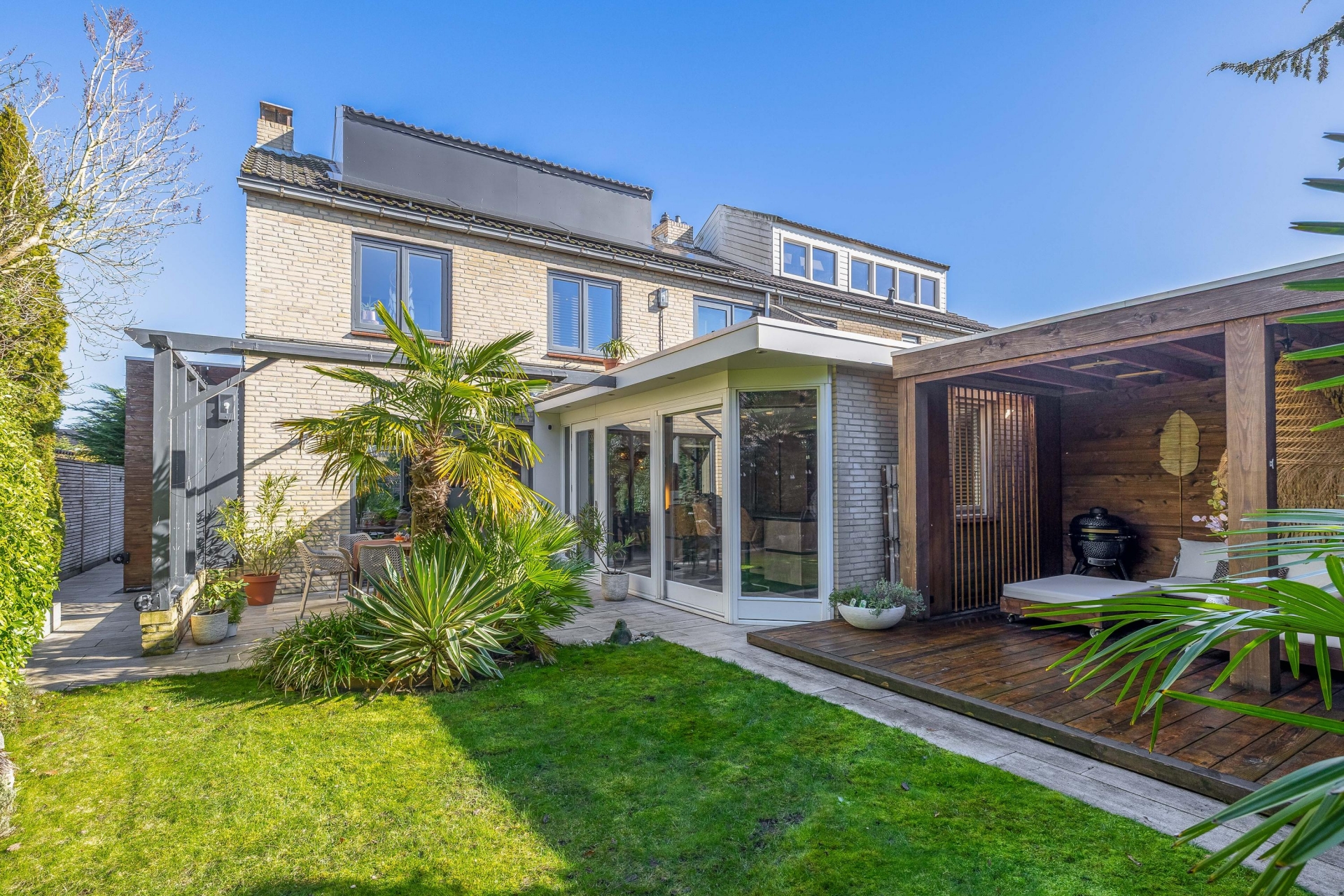 De achtertuin ligt op het zuidwesten, waardoor je hier volop van de zon kunt genieten. De sfeer doet denken aan Ibiza: veel groen, verschillende terrassen en een prachtige houten overkapping waar je heerlijk kunt loungen.