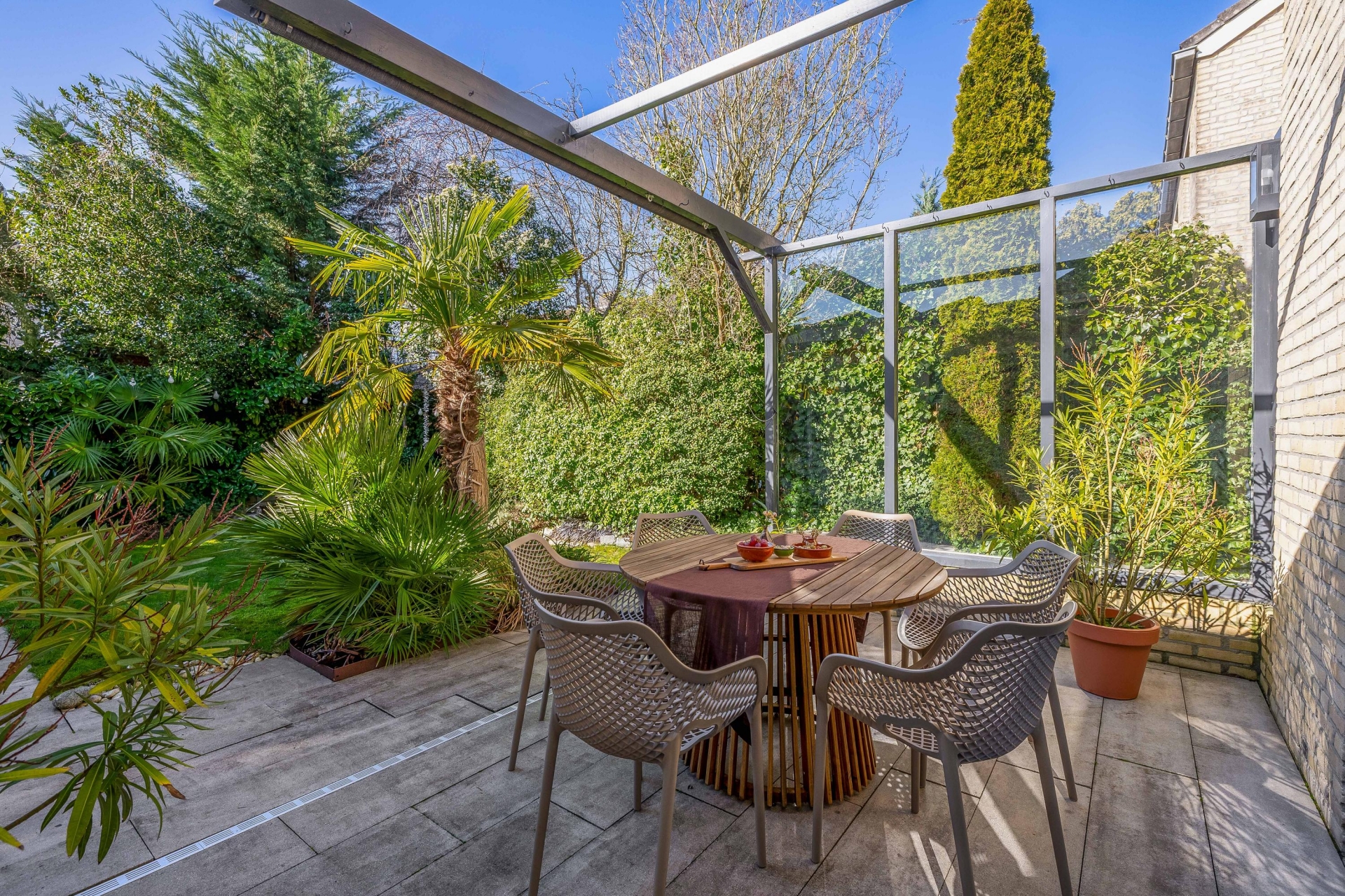 In de tuin staat bovendien een pergola met aan één kant een glazen afscheiding. Deze is voorzien van een schaduwdoek dat naar beneden kan worden uitgerold, zodat je ook op warme dagen comfortabel van de tuin kunt genieten.