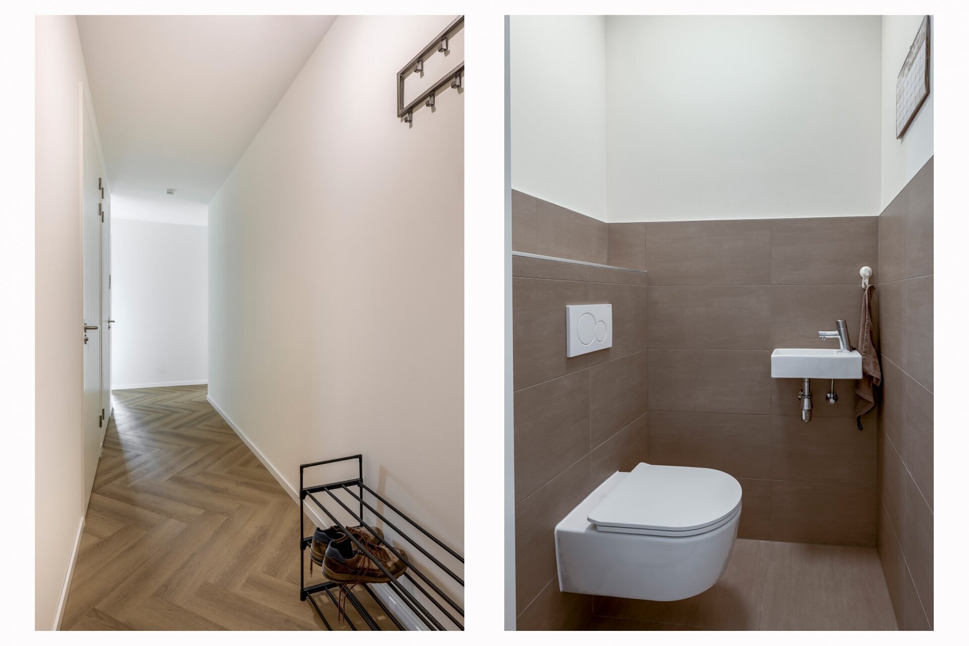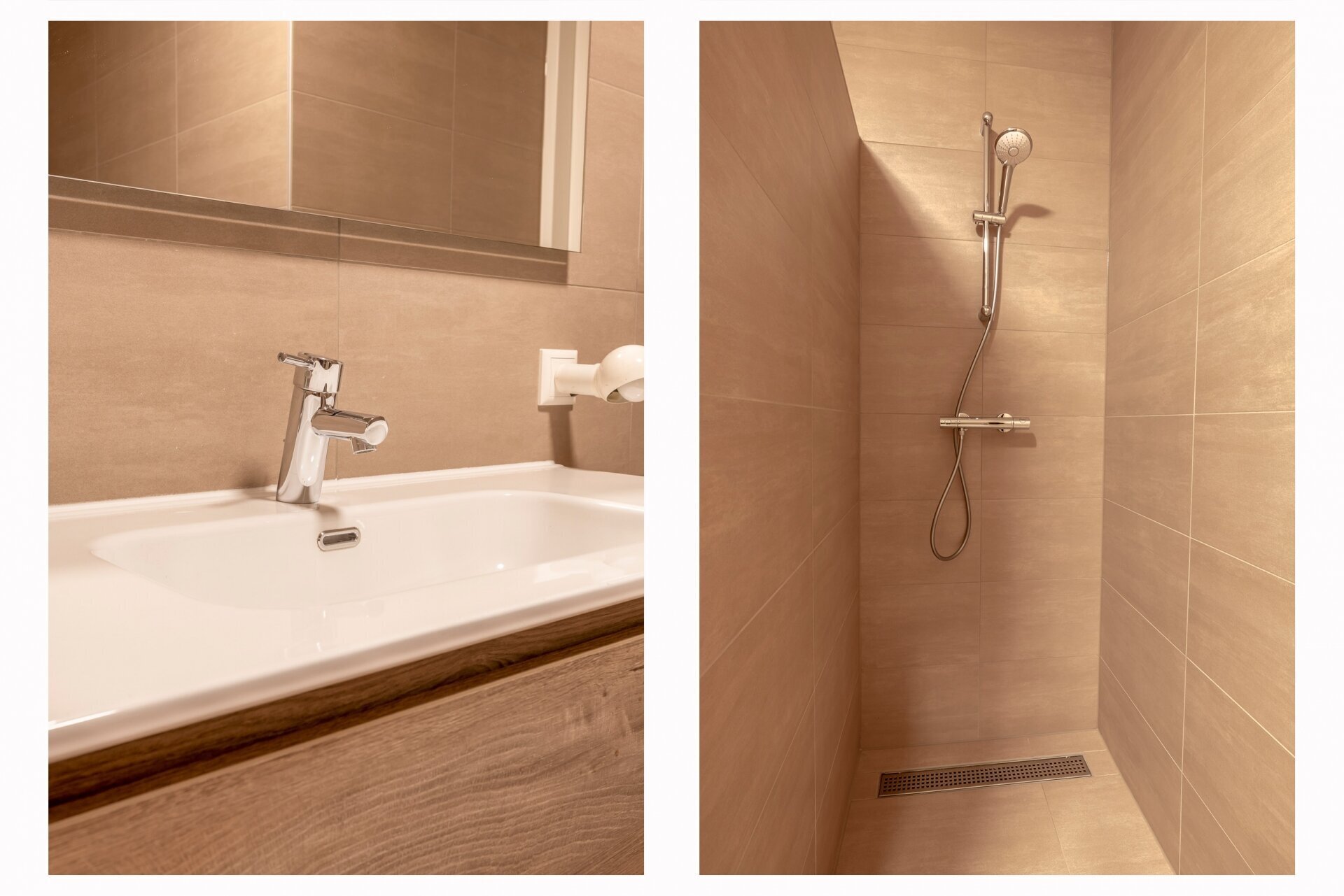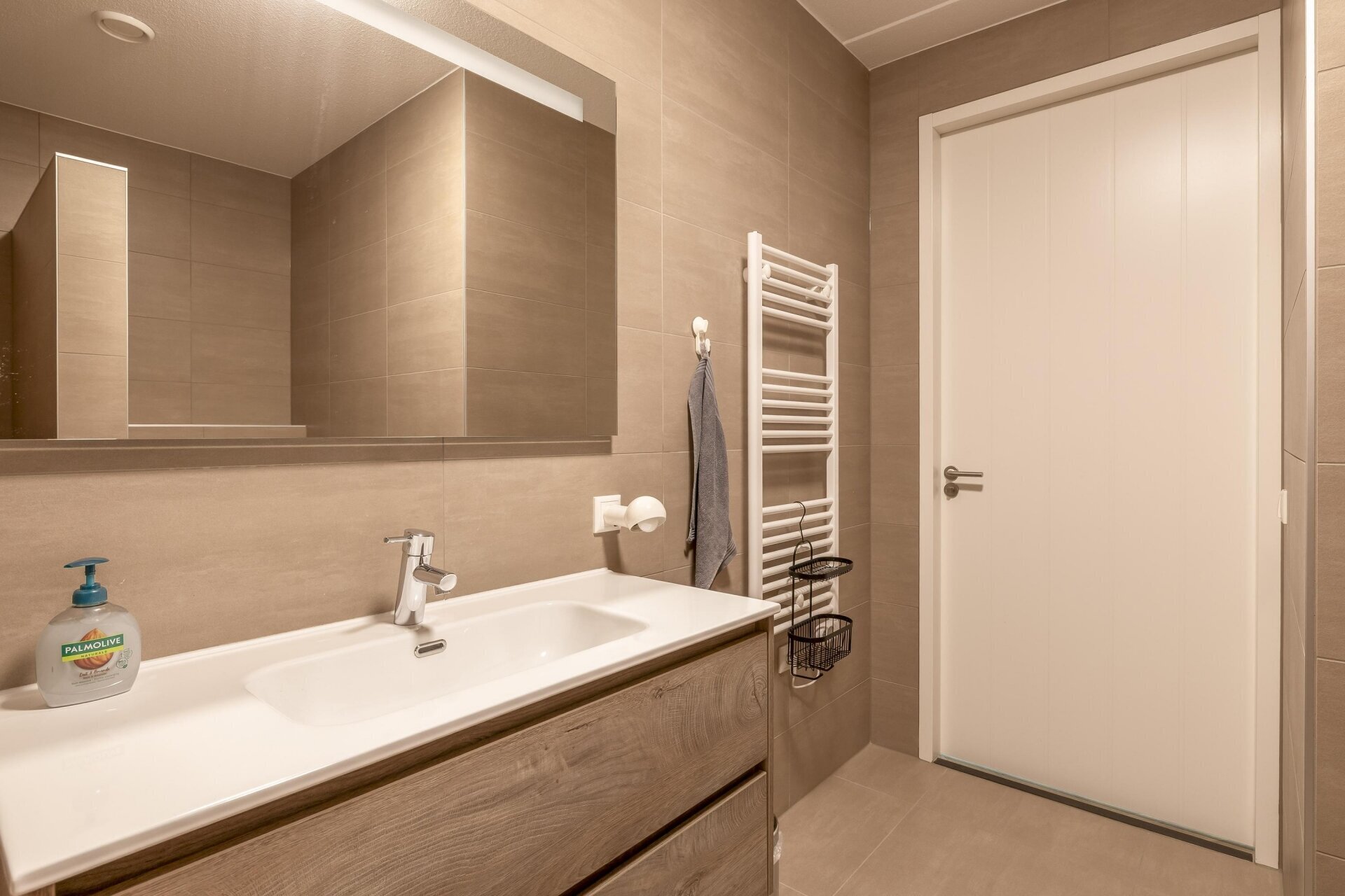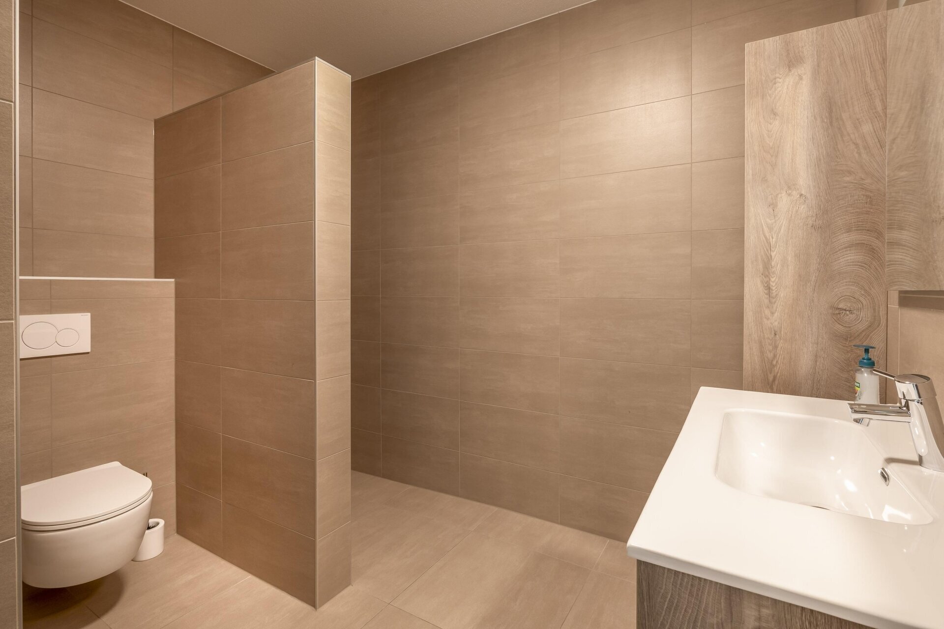 De badkamer is ruim opgezet en uitgevoerd in een moderne stijl, met een inloopdouche, wastafelmeubel en toilet. Uiteraard is er een separaat toilet aanwezig in dezelfde luxe afwerking. Alles is gelijkvloers en toekomstbestendig: een appartement waar je zonder zorgen oud kunt worden.