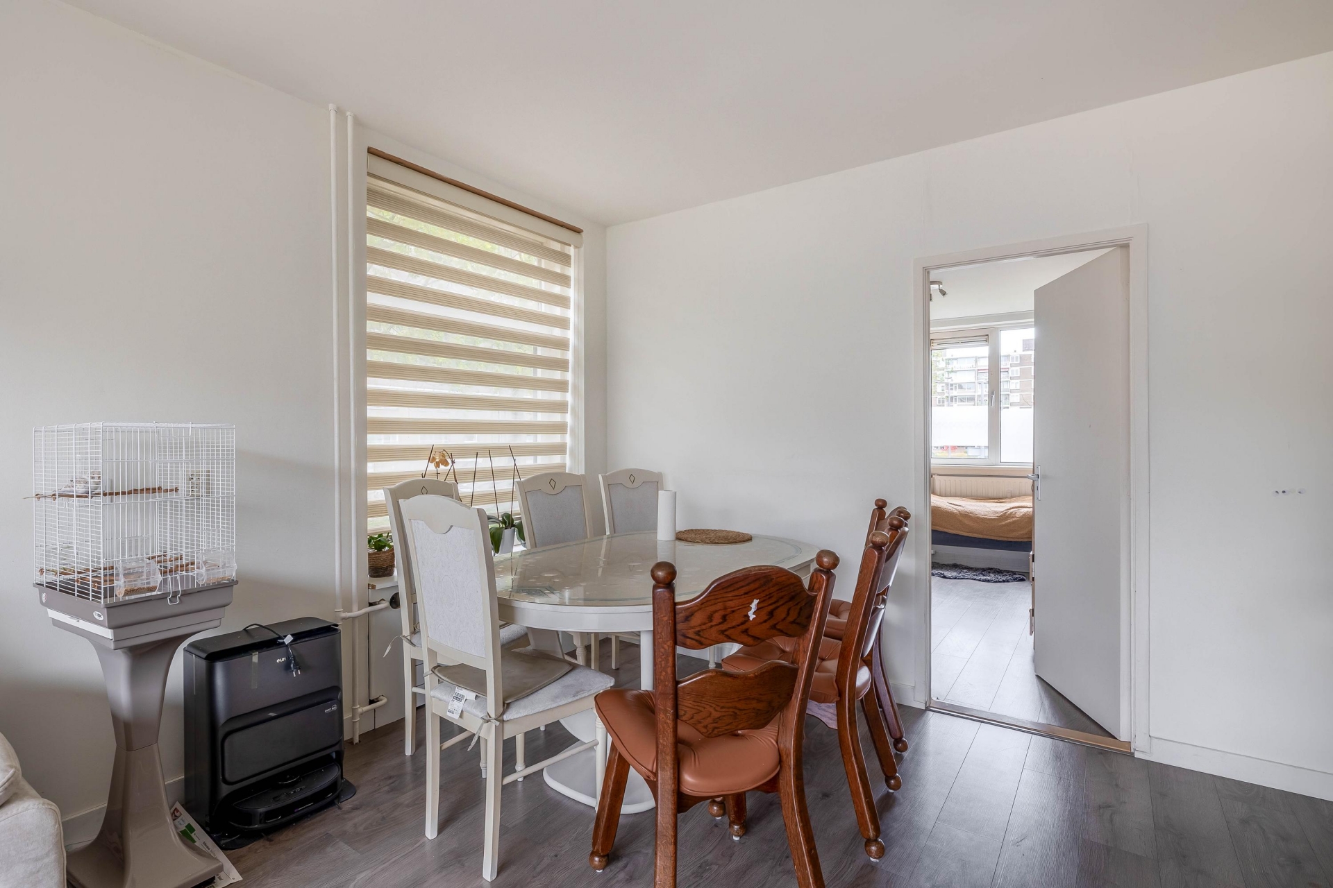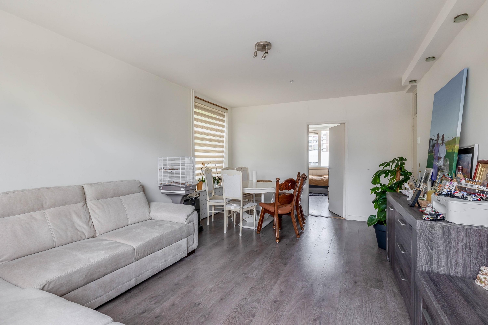 Het appartement ligt op de eerste verdieping van een goed onderhouden portiekflat. De woonkamer is licht dankzij de grote raampartijen en biedt voldoende ruimte voor een gezellige zithoek en een eettafel. De vloer is netjes afgewerkt en de witte wanden zorgen voor een frisse basis. Vanuit de woonkamer loop je zo het balkon op — heerlijk gelegen op het zuidoosten — waar je in de ochtend en vroege middag van de zon kunt genieten.