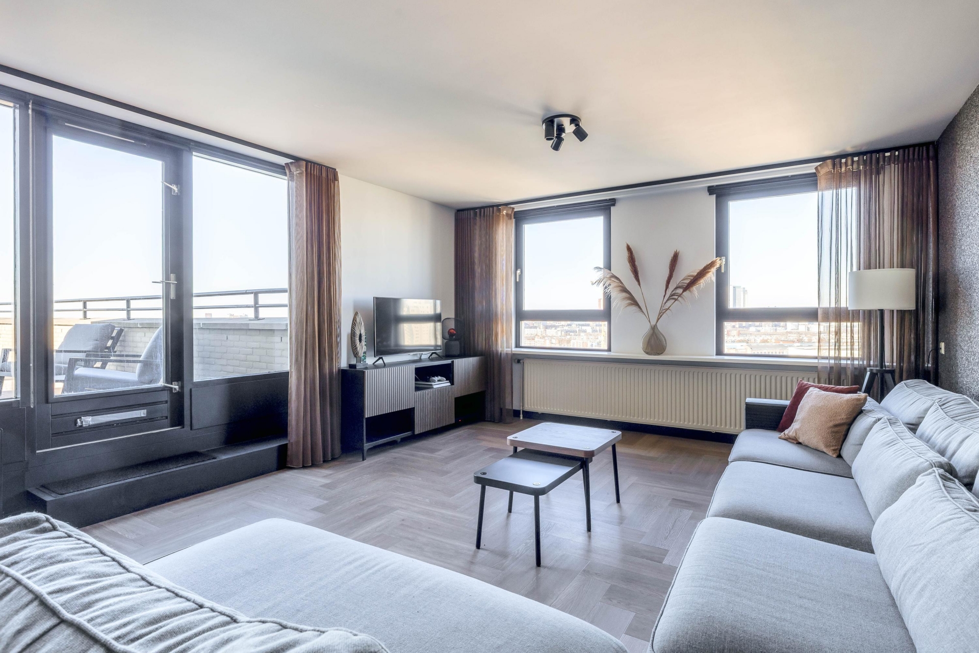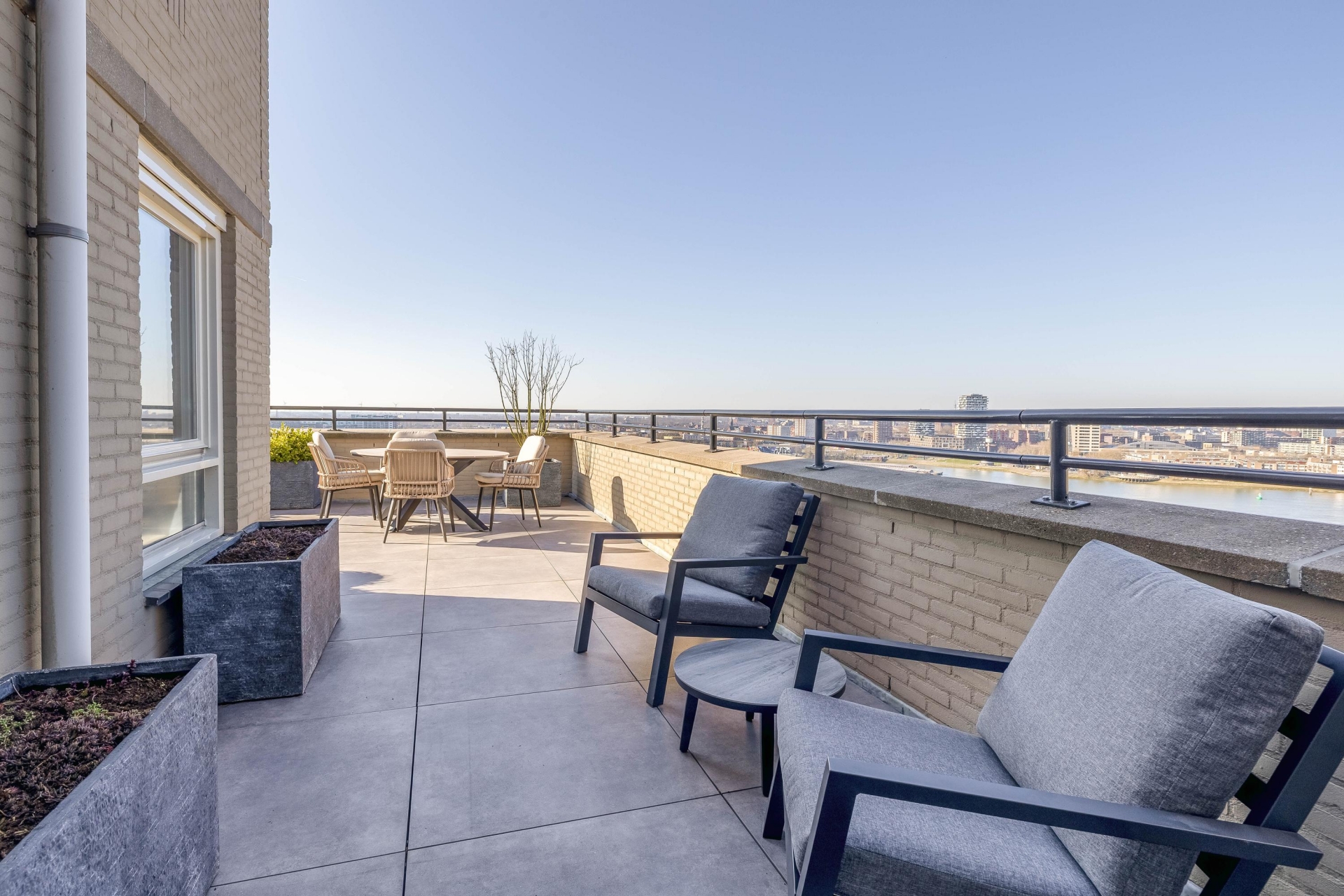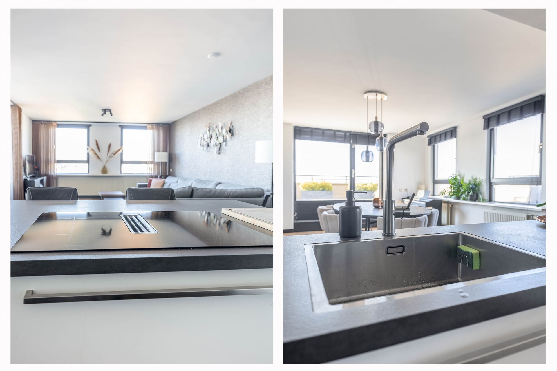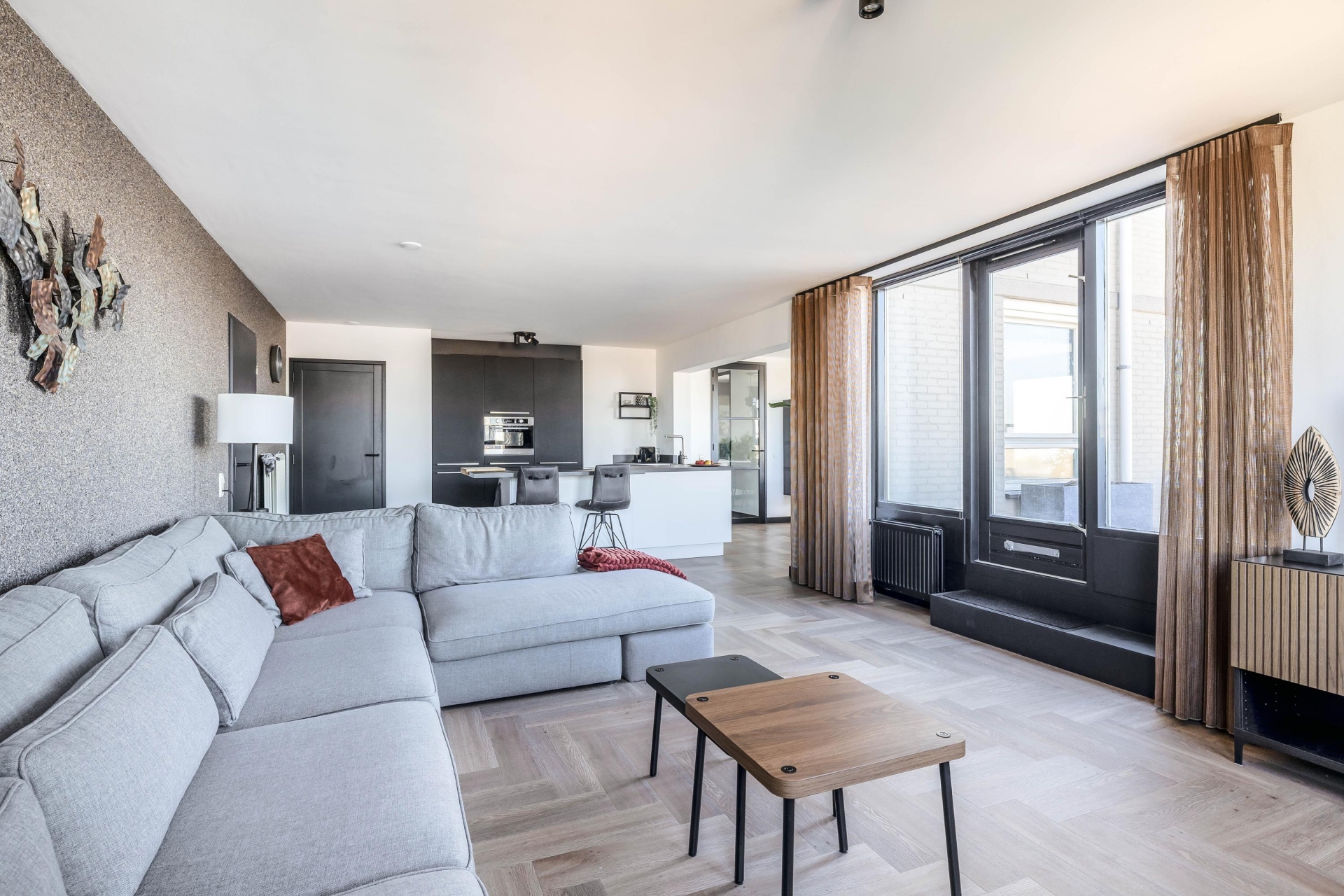 De woonkamer is een oase van licht dankzij de grote raampartijen en biedt toegang tot het fantastische loungeterras van ca. 60 m². Hier geniet je het hele jaar door van de dynamiek van de stad en de rust van het water. De open keuken – volledig vernieuwd in 2023 – is voorzien van luxe inbouwapparatuur en biedt alles voor de kookliefhebber.