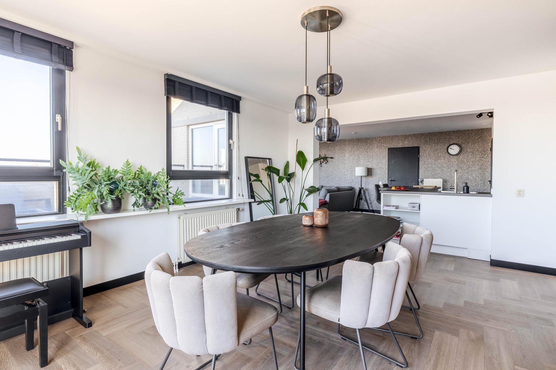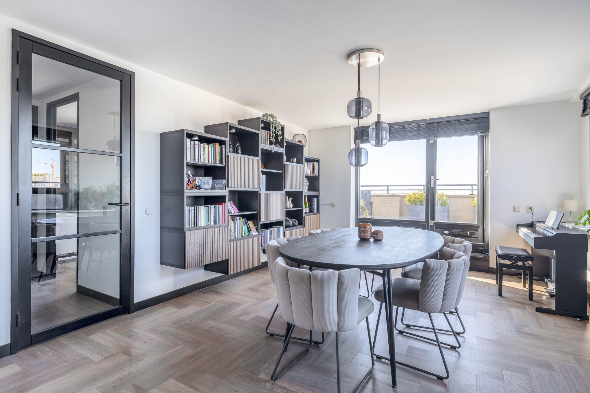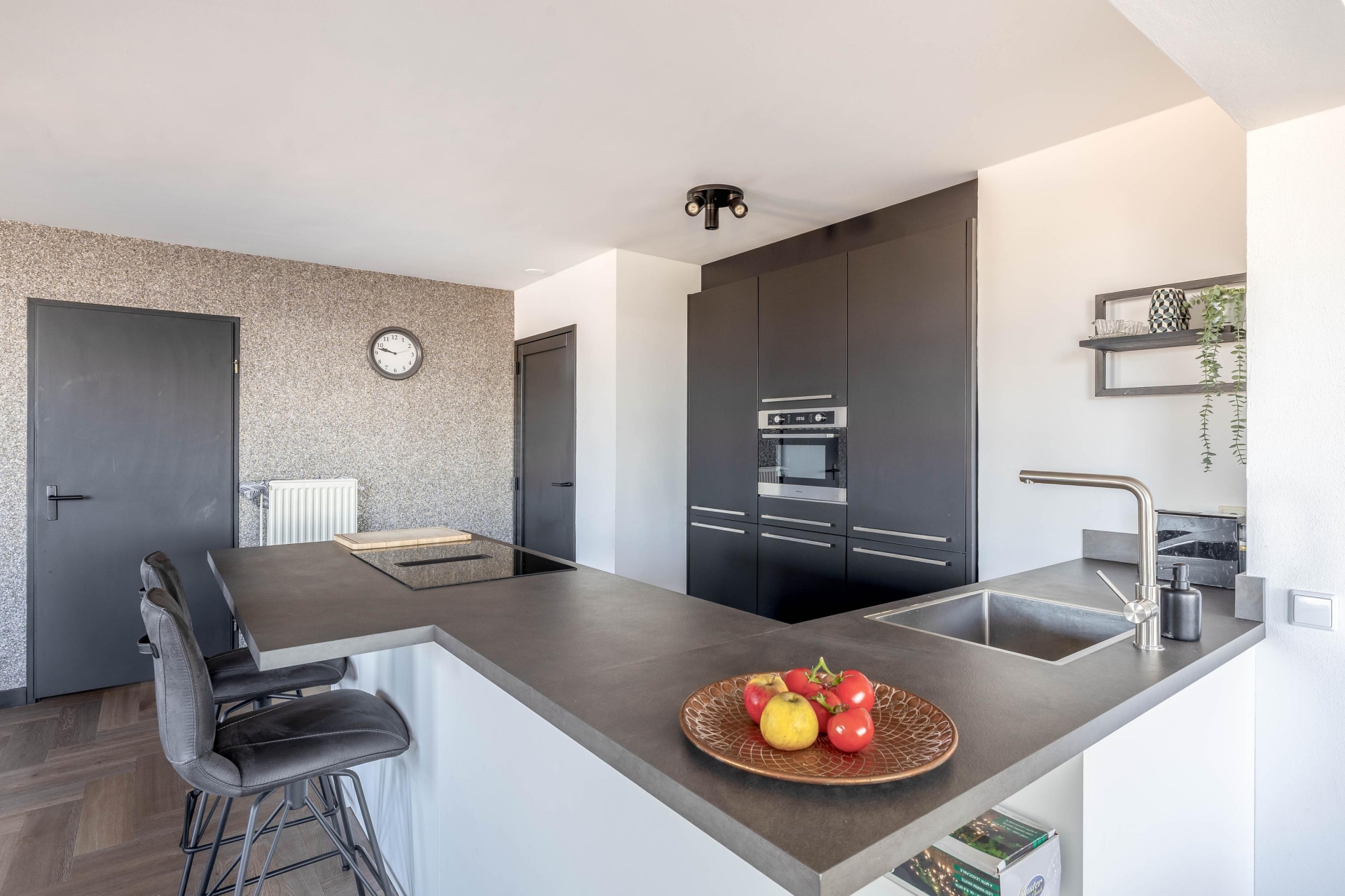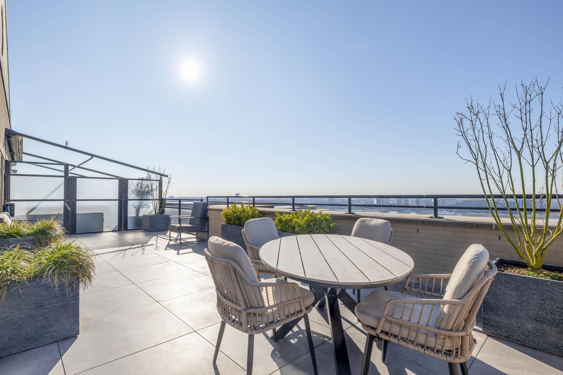 De woonkamer is een oase van licht dankzij de grote raampartijen en biedt toegang tot het fantastische loungeterras van ca. 60 m². Hier geniet je het hele jaar door van de dynamiek van de stad en de rust van het water. De open keuken – volledig vernieuwd in 2023 – is voorzien van luxe inbouwapparatuur en biedt alles voor de kookliefhebber.