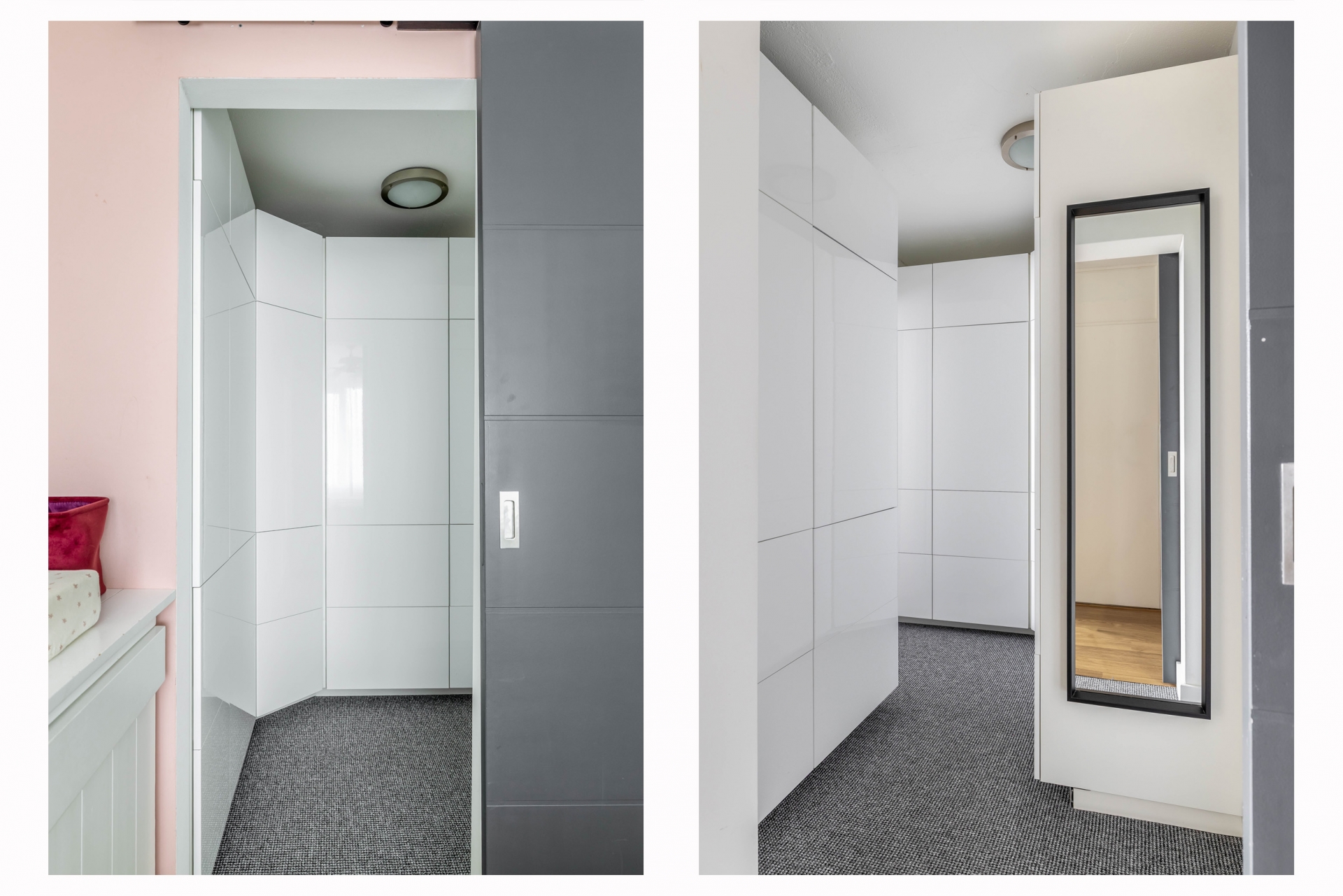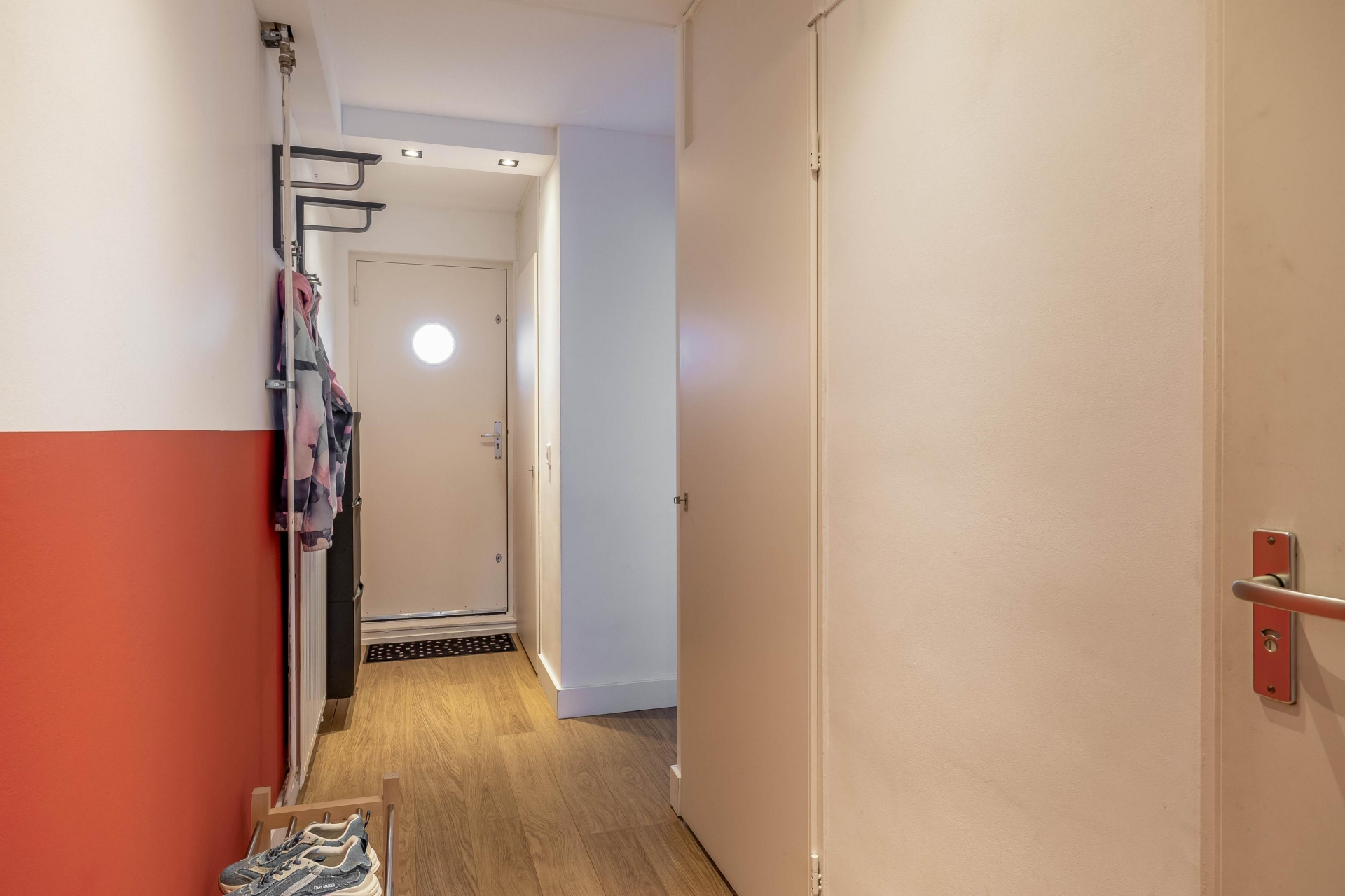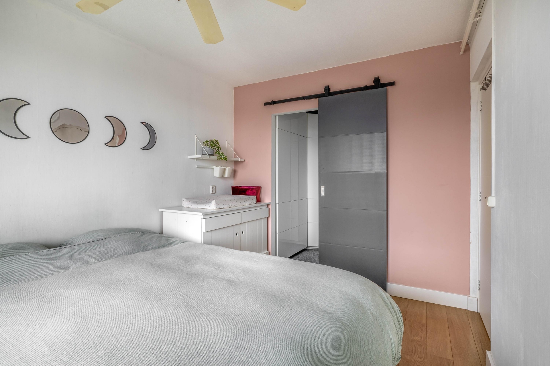 Er zijn twee slaapkamers aanwezig, waarvan één nu is ingericht als ruime master bedroom en de andere perfect dienst kan doen als werk-, kinder-, logeer- of hobbykamer. Wat direct opvalt is de slimme oplossing voor opbergruimte: de inloopkast biedt volop plek voor kleding, koffers, voorraad of andere spullen. Geen losse kasten meer nodig dus! De inloopkast kan je zowel vanuit de slaapkamer als de hal betreden. Ideaal wanneer jij of je partner wilt uitslapen terwijl de ander bij de kasten moet zijn.