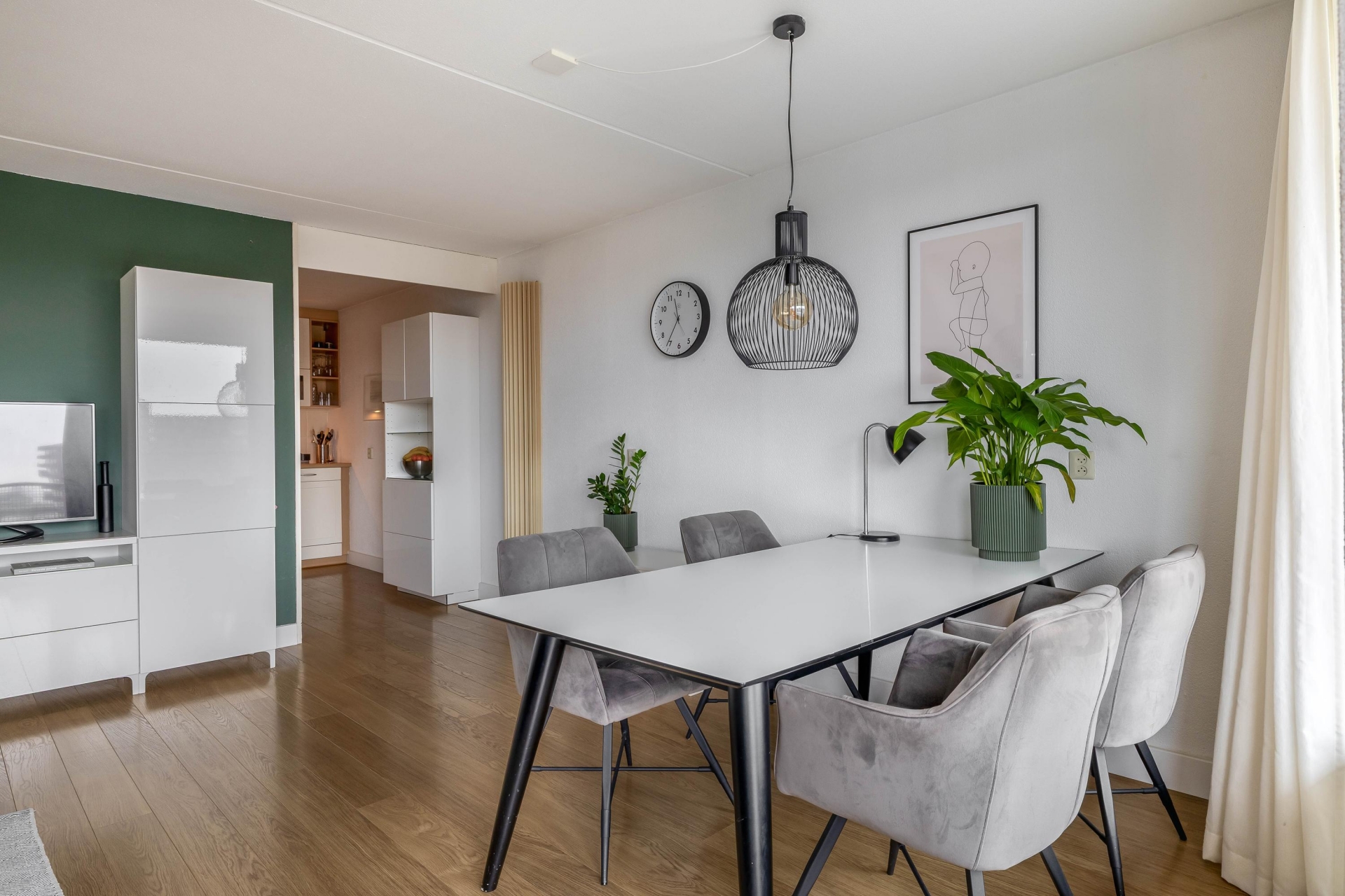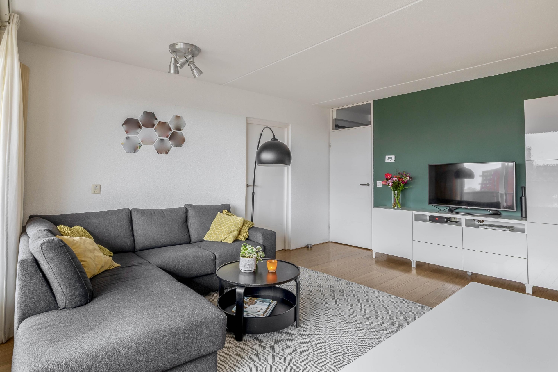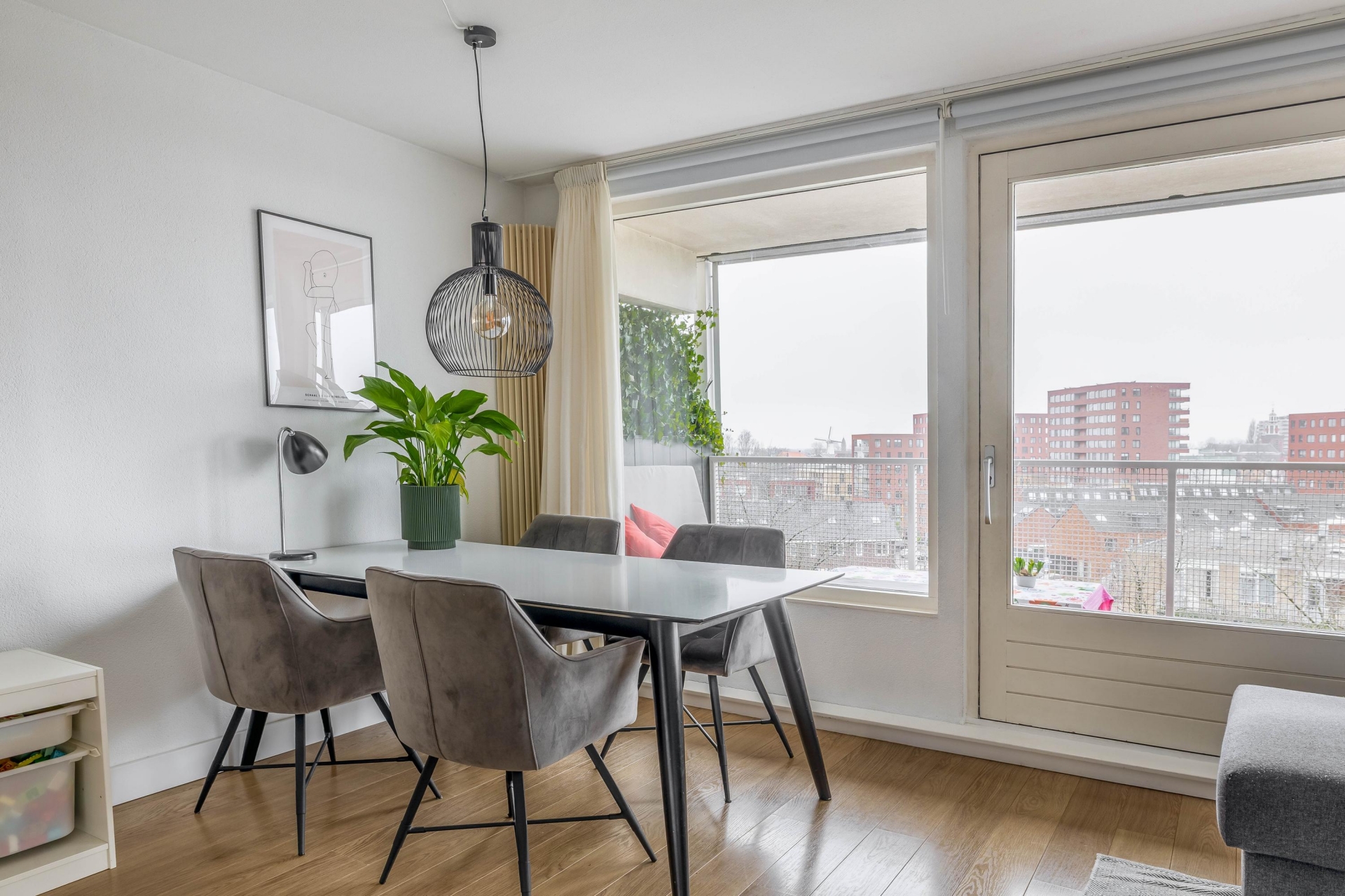 De woonkamer is ruim van opzet en wordt door de grote raampartijen heerlijk verlicht. Dankzij de ligging op hoogte kijk je hier mooi weg over de wijk, terwijl je binnen geniet van een comfortabele zithoek en plek voor een eettafel. De toegang tot het zonnige balkon loopt direct vanuit de woonkamer.