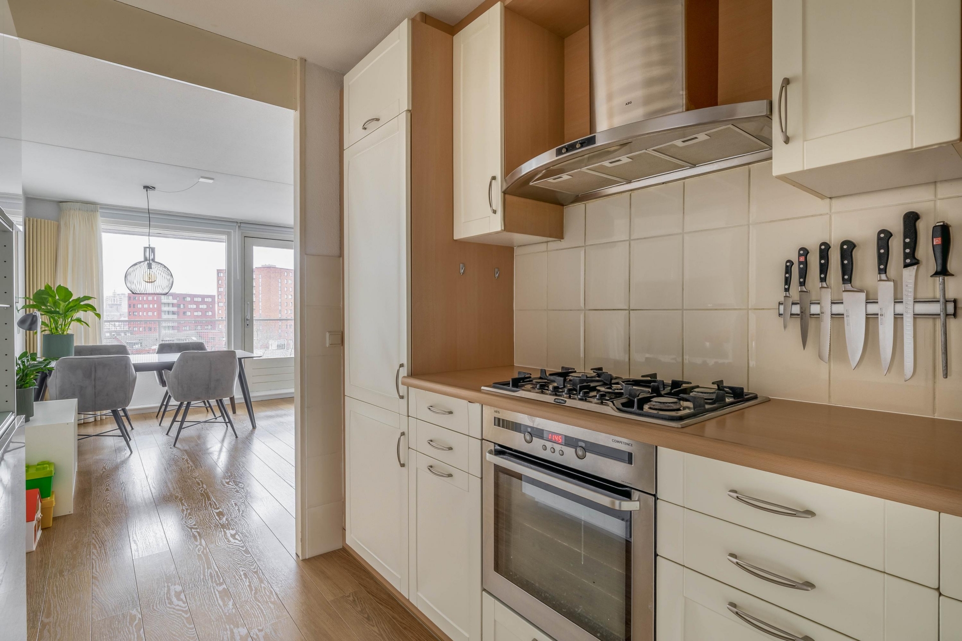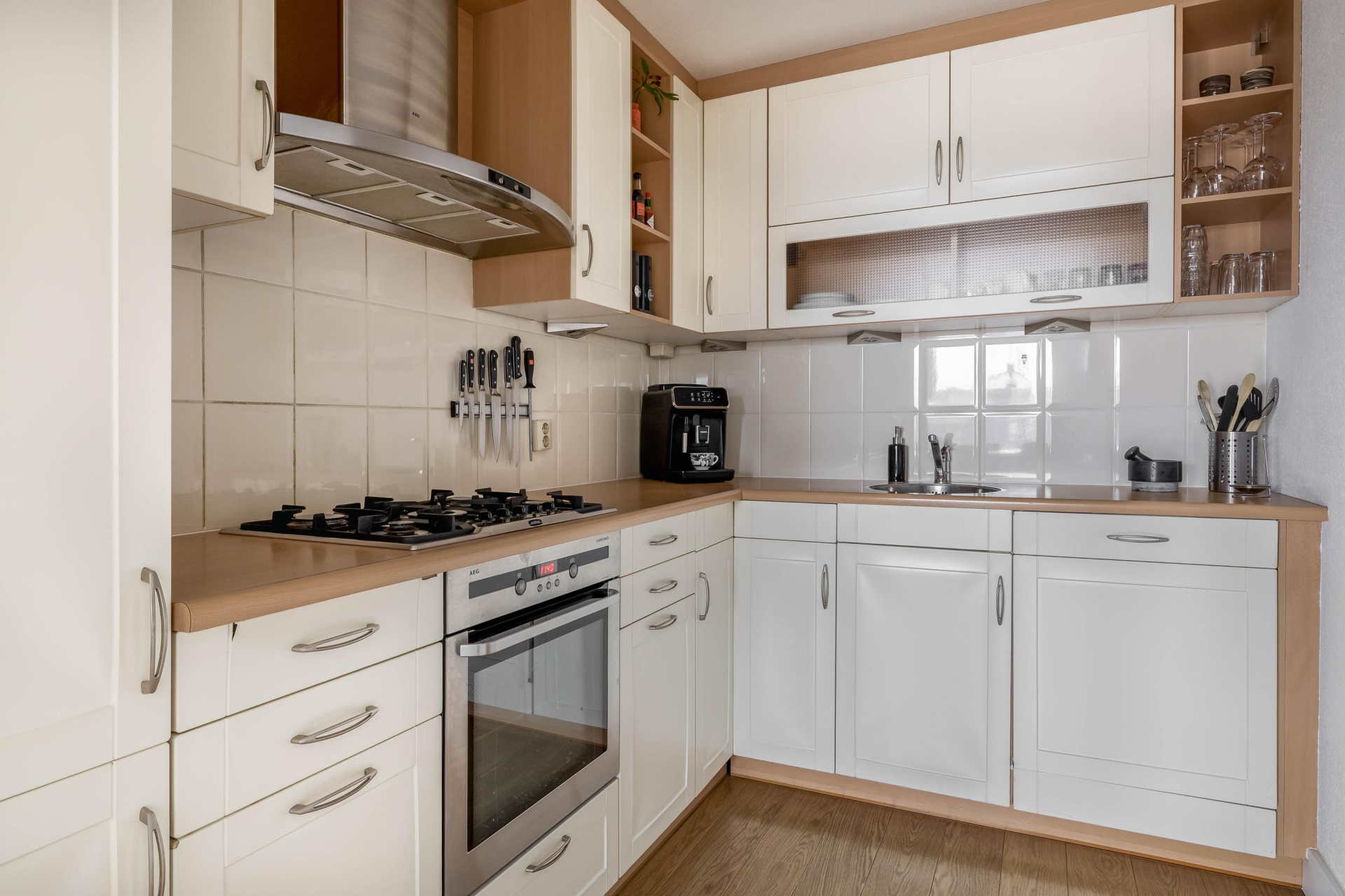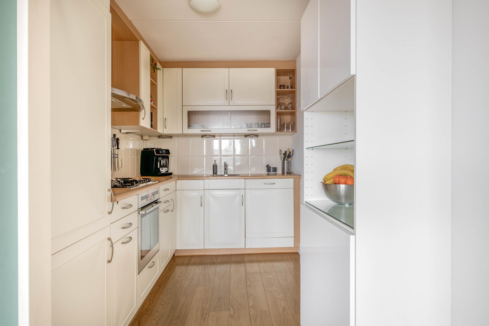 De keuken is praktisch ingedeeld en uitgevoerd in een lichte kleurstelling. Voorzien van diverse inbouwapparatuur, een strak werkblad en voldoende kastruimte is dit een fijne plek voor dagelijkse maaltijden of gezellig koken met vrienden.