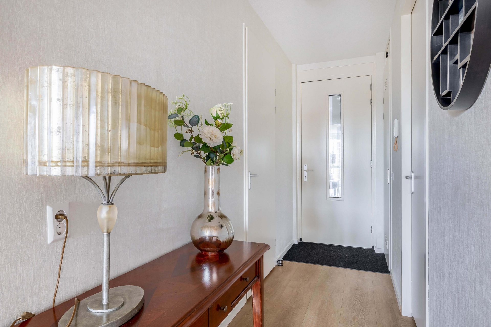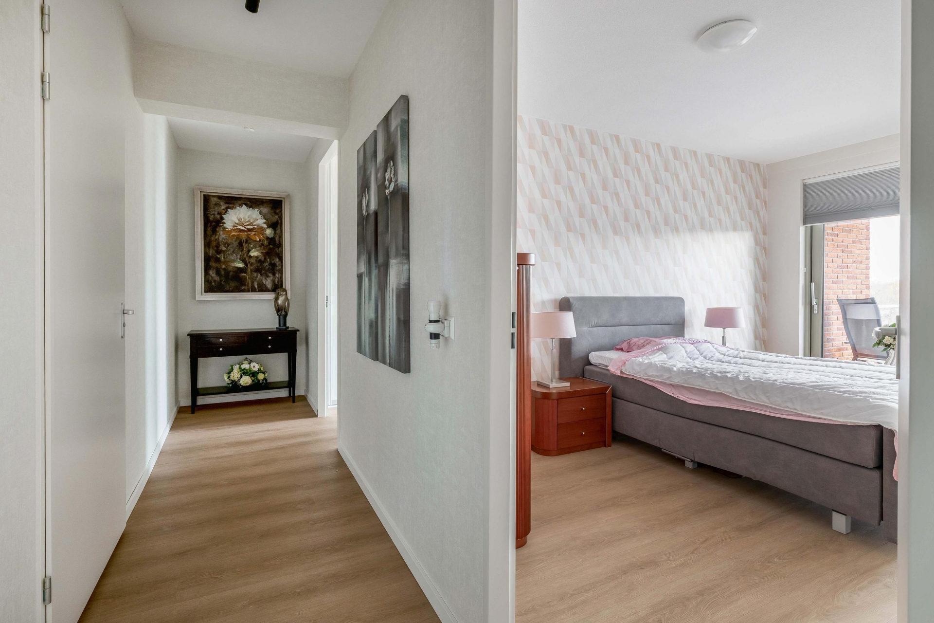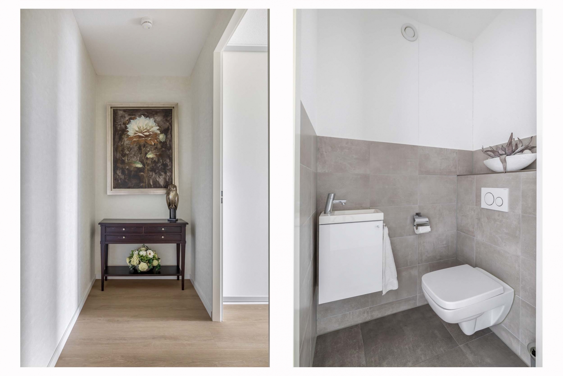 Entree/hal met de meterkast en toegang tot twee slaapkamers, het toilet met fontein, de badkamer, een inpandige berging en de woonkamer met open keuken. Het eerste wat opvalt is de PVC-vloer met strak afgewerkte muren. Deze is als ware eyecatcher in het hele appartement doorgelegd. Er is vloerverwarming aanwezig met mogelijkheid om te koelen.