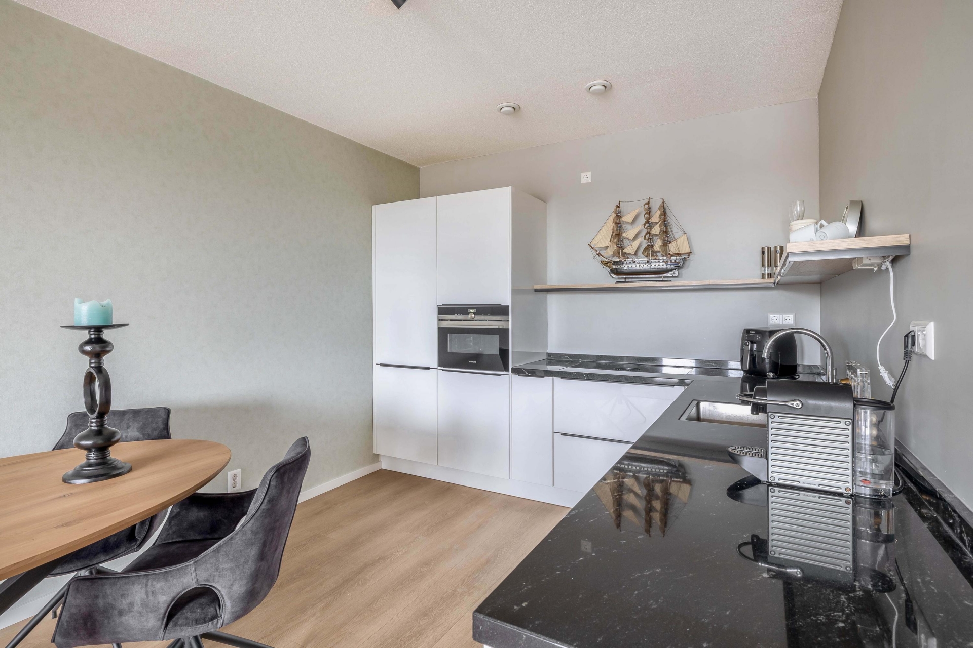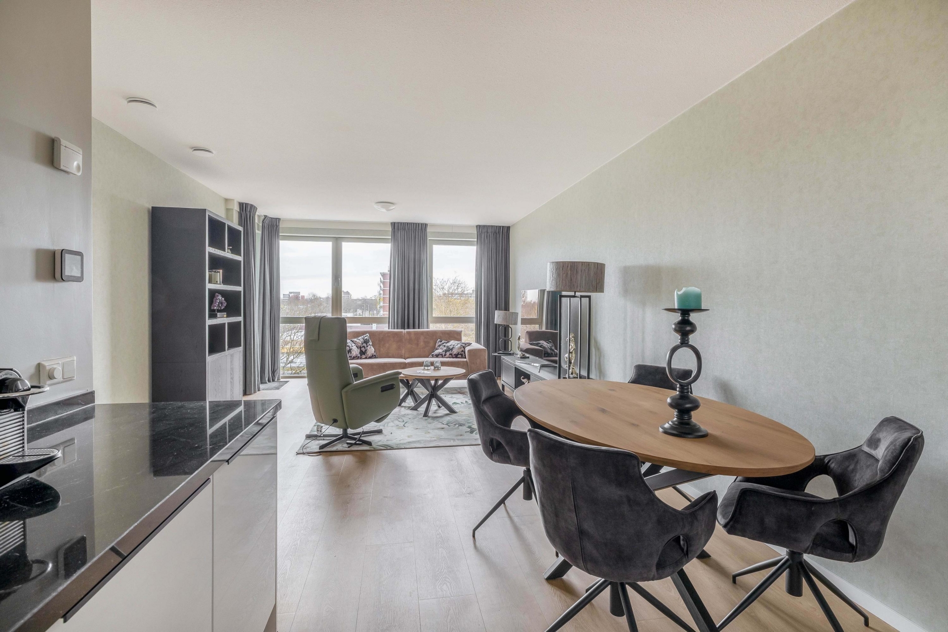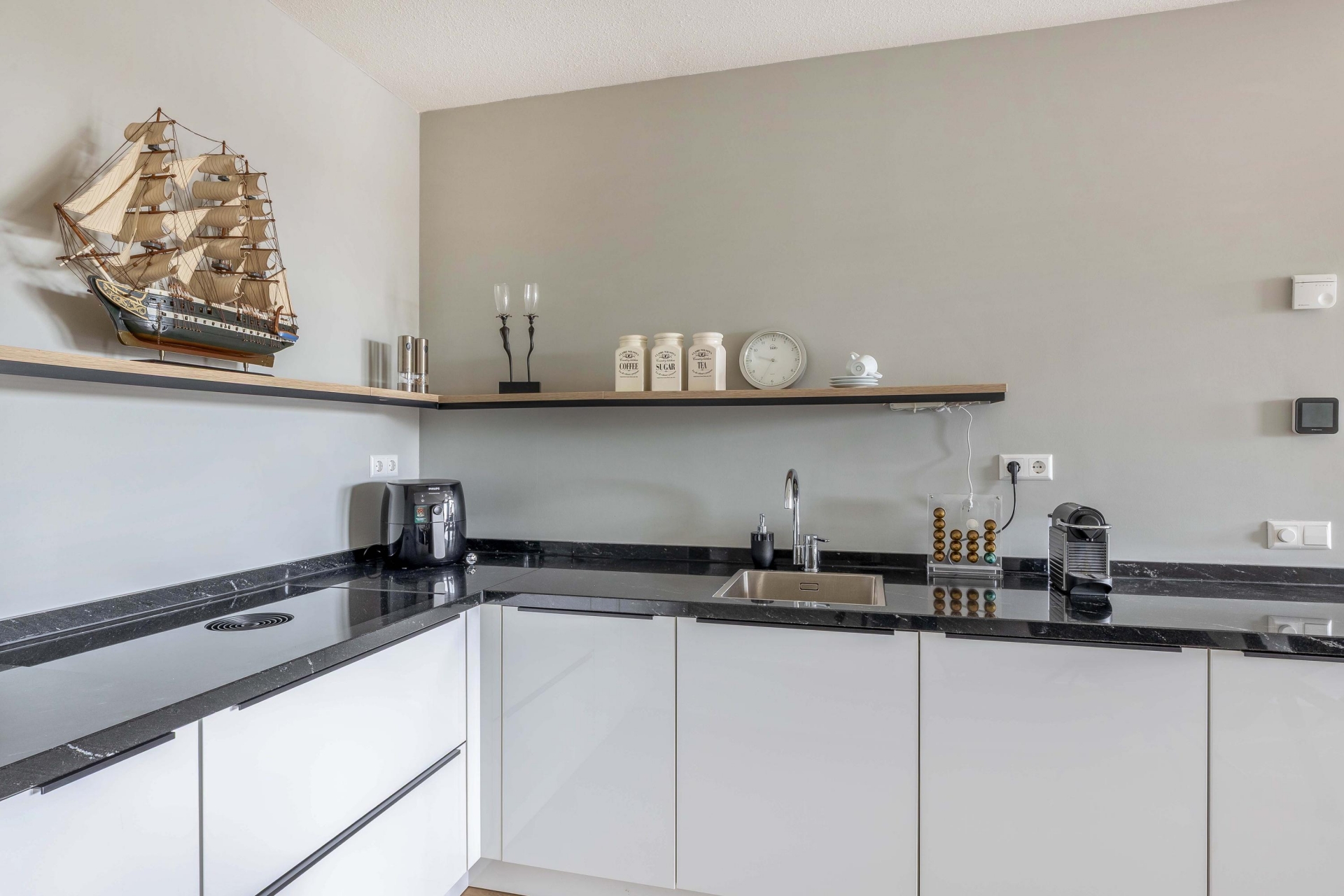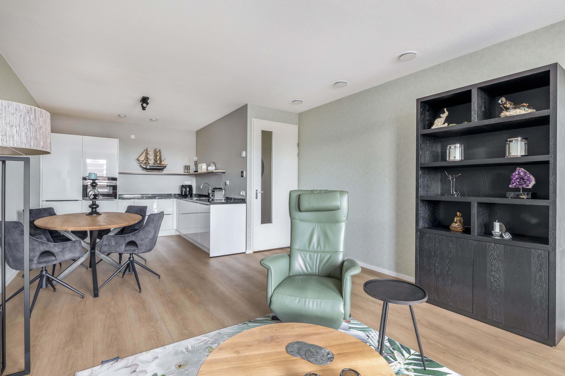 De woonkamer met moderne open keuken is gesitueerd aan de voorzijde van het appartementencomplex. De keuken is uitgevoerd met een granieten aanrechtblad en alle benodigde apparatuur is aanwezig. Denk hierbij aan een koelkast, vriezer, magnentron, inductiekookplaat met Bora systeem en een vaatwasser. De woonkamer en keuken beschikken over veel raampartijen voor een fraai zicht over de wijk. Vanaf de woonkamer is het balkon toegankelijk. Deze is gesitueerd op het noordoosten en heeft een fraai uitzicht waar je heerlijk in het zonnetje van kunt genieten.
