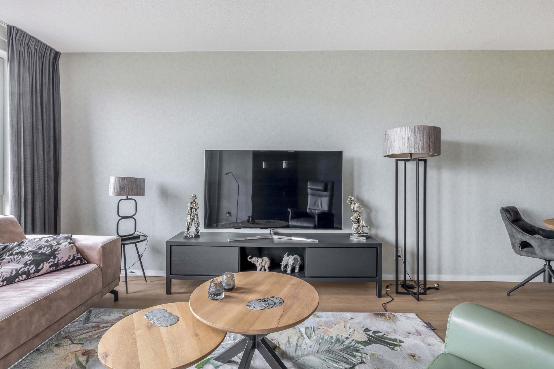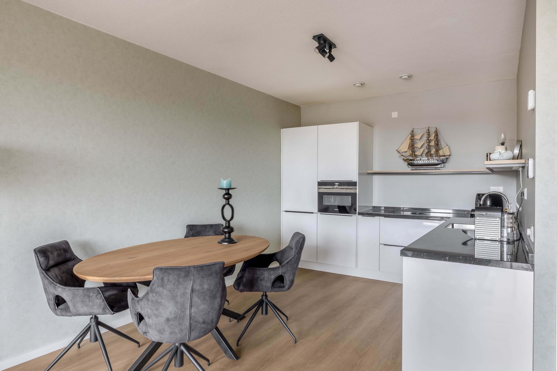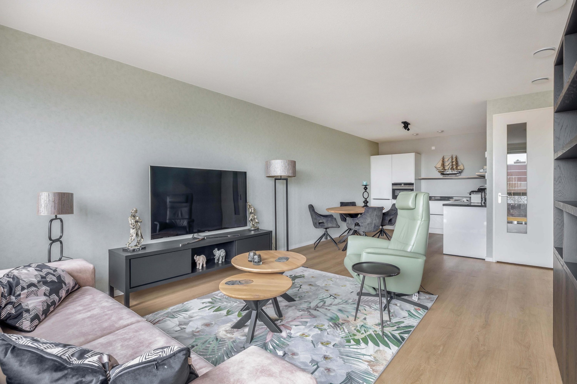 De woonkamer met moderne open keuken is gesitueerd aan de voorzijde van het appartementencomplex. De keuken is uitgevoerd met een granieten aanrechtblad en alle benodigde apparatuur is aanwezig. Denk hierbij aan een koelkast, vriezer, magnentron, inductiekookplaat met Bora systeem en een vaatwasser. De woonkamer en keuken beschikken over veel raampartijen voor een fraai zicht over de wijk. Vanaf de woonkamer is het balkon toegankelijk. Deze is gesitueerd op het noordoosten en heeft een fraai uitzicht waar je heerlijk in het zonnetje van kunt genieten.