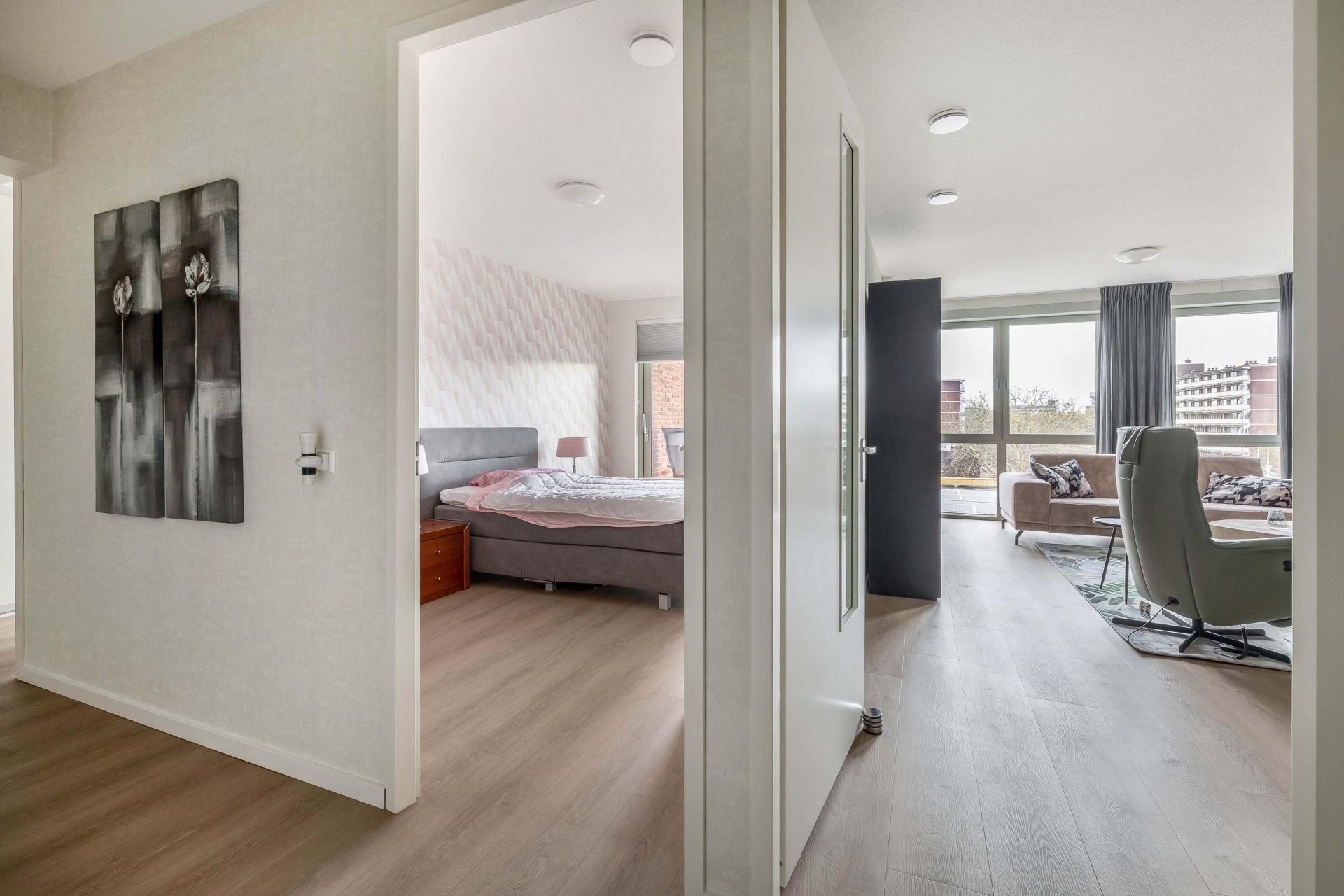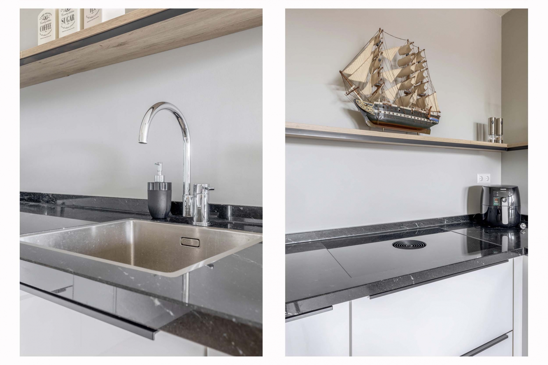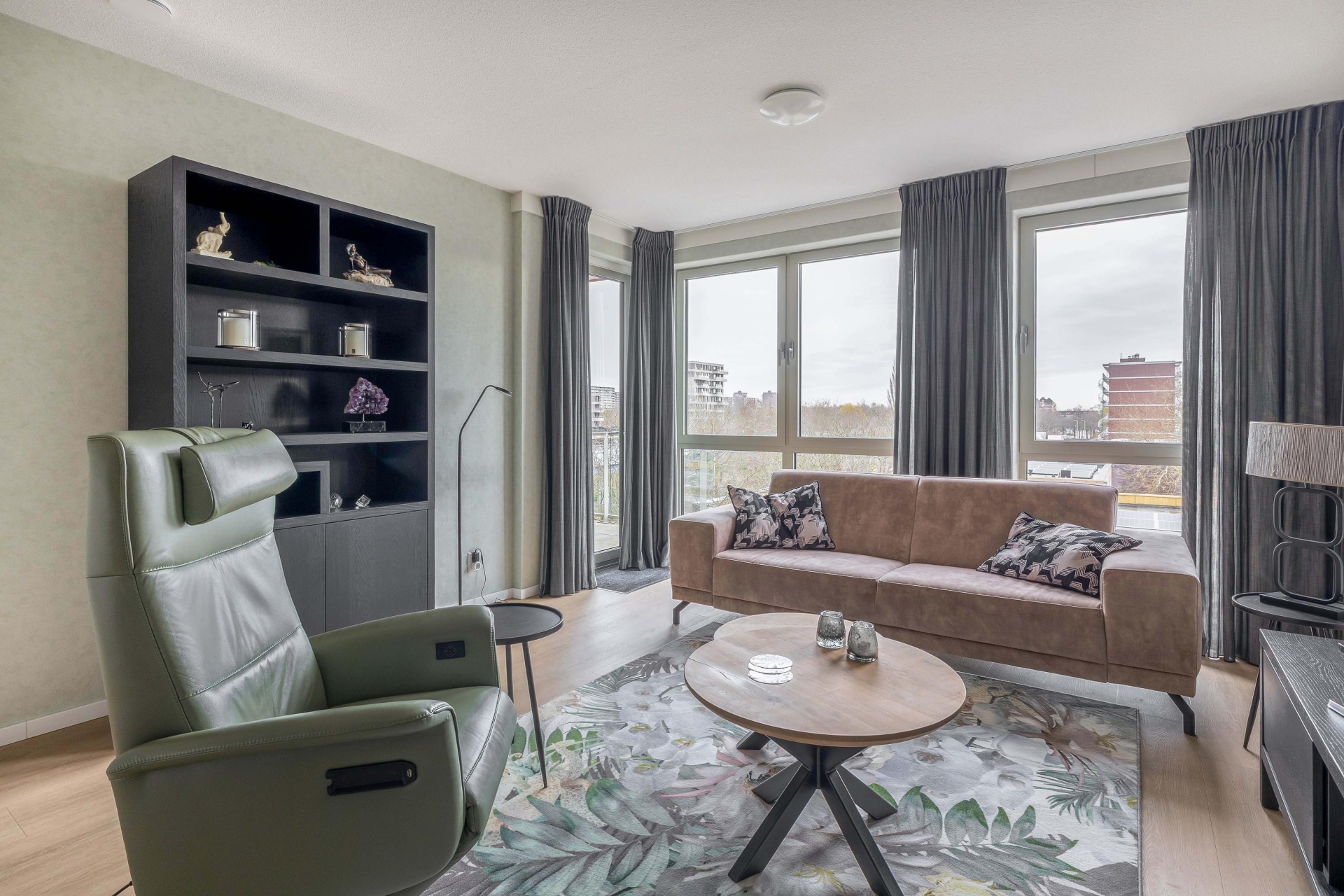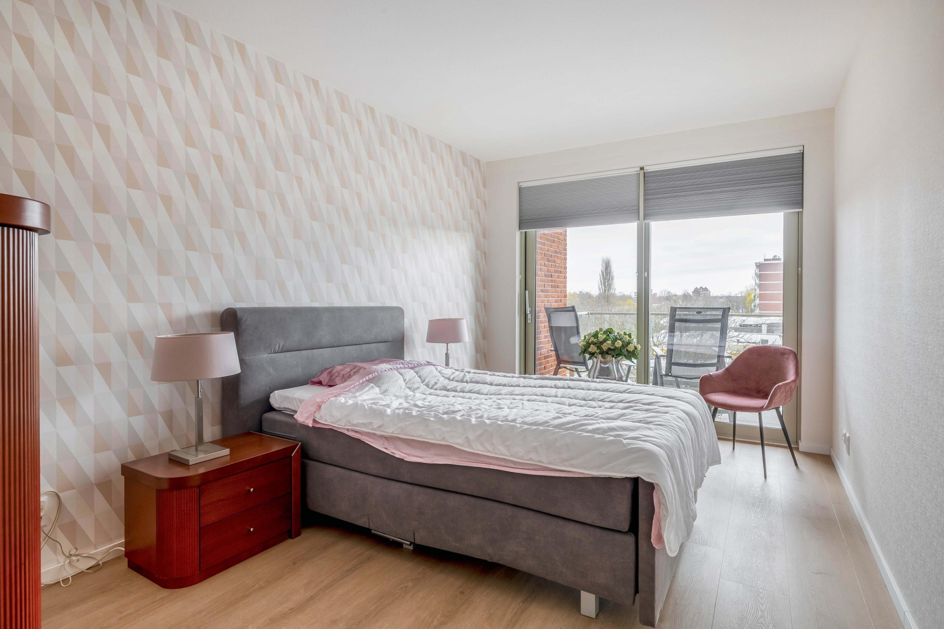 De woonkamer met moderne open keuken is gesitueerd aan de voorzijde van het appartementencomplex. De keuken is uitgevoerd met een granieten aanrechtblad en alle benodigde apparatuur is aanwezig. Denk hierbij aan een koelkast, vriezer, magnentron, inductiekookplaat met Bora systeem en een vaatwasser. De woonkamer en keuken beschikken over veel raampartijen voor een fraai zicht over de wijk. Vanaf de woonkamer is het balkon toegankelijk. Deze is gesitueerd op het noordoosten en heeft een fraai uitzicht waar je heerlijk in het zonnetje van kunt genieten.